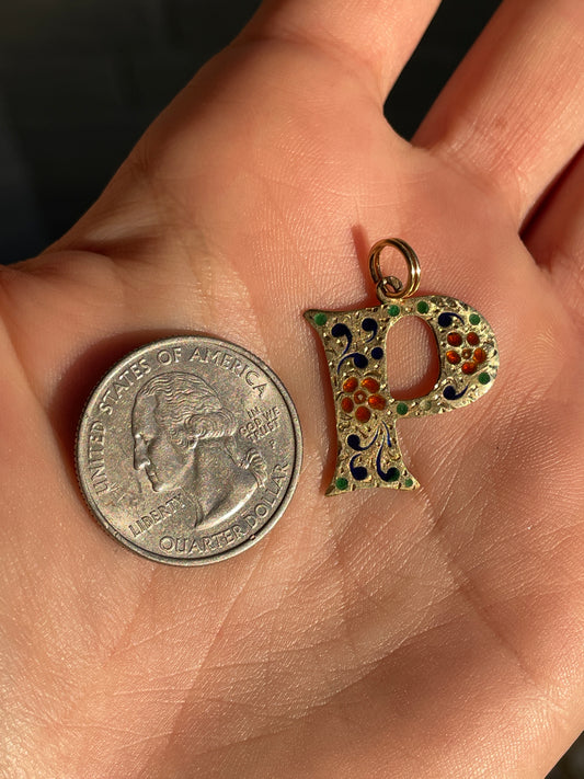 Vintage yellow 14K letter P oval charm with colorful enamel