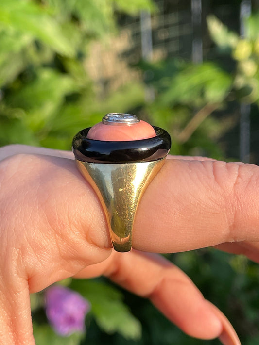 Vintage yellow 18K and platinum target ring with onyx, coral, and approx .8 ctw old European cut diamond, size 7.75