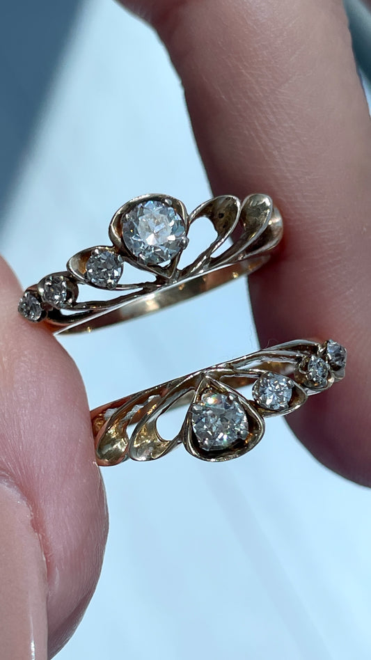 Vintage set of yellow 14K scalloped .88 ctw old cut diamond rings, size 7.75