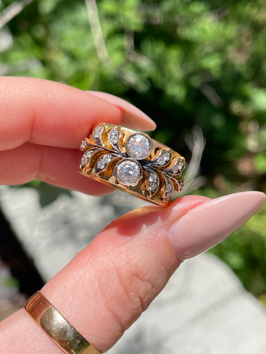 Vintage white 14K approx 2 ctw old mine cut and old european cut diamond double chevron ring, size 7