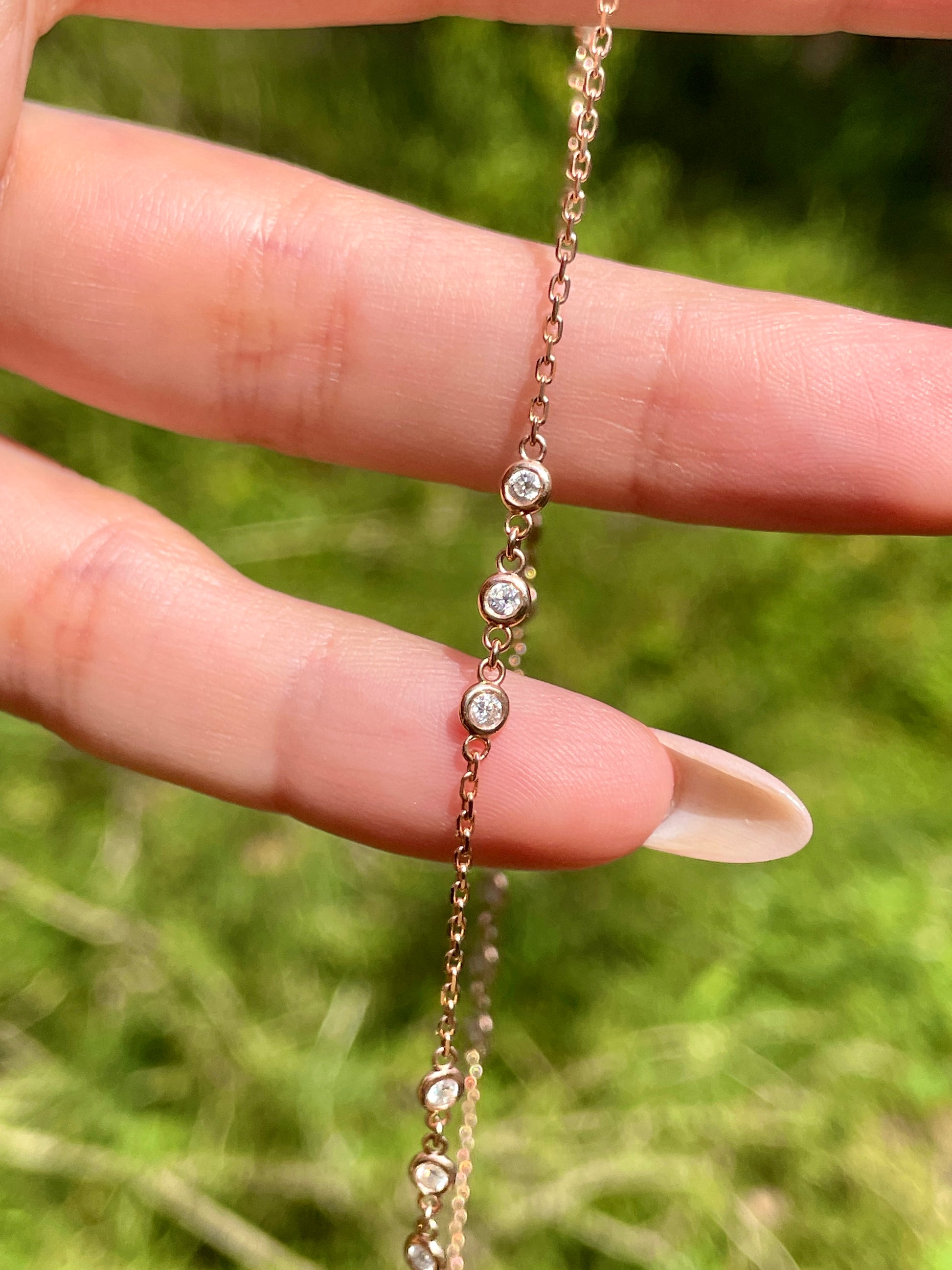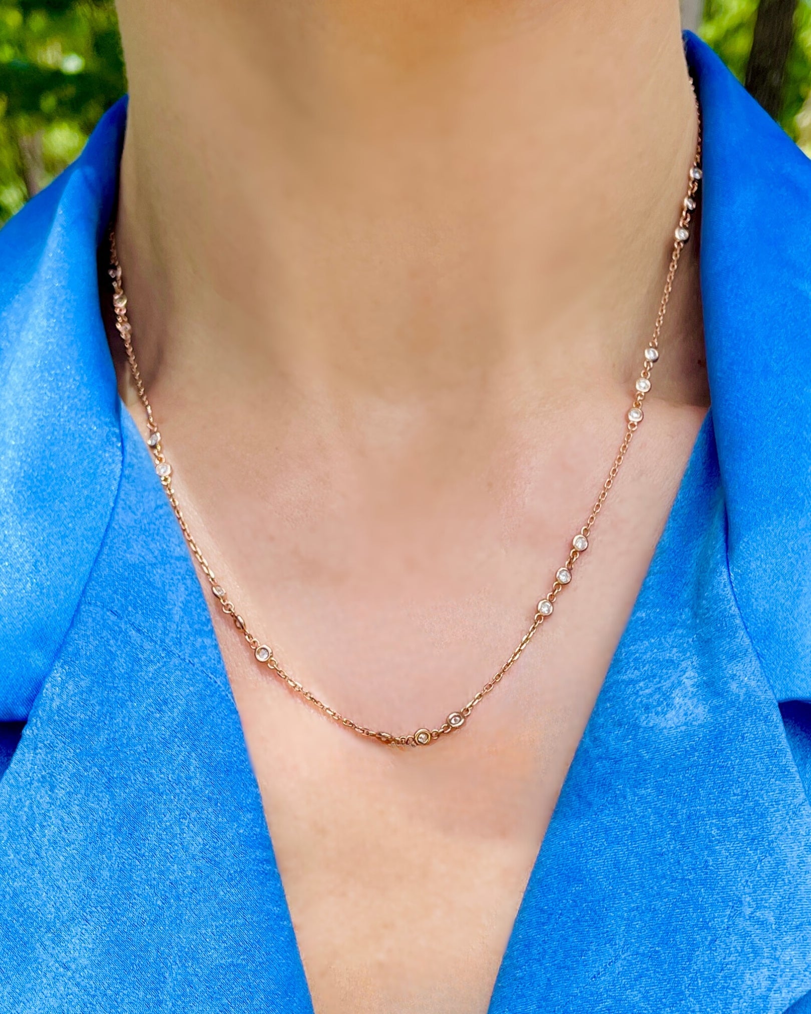 A 14K rose gold .9 ctw bezel set diamond station chain in excellent preowned condition measuring 18 inches long. Weighs 4 grams. Measures 3.2 mm widest.