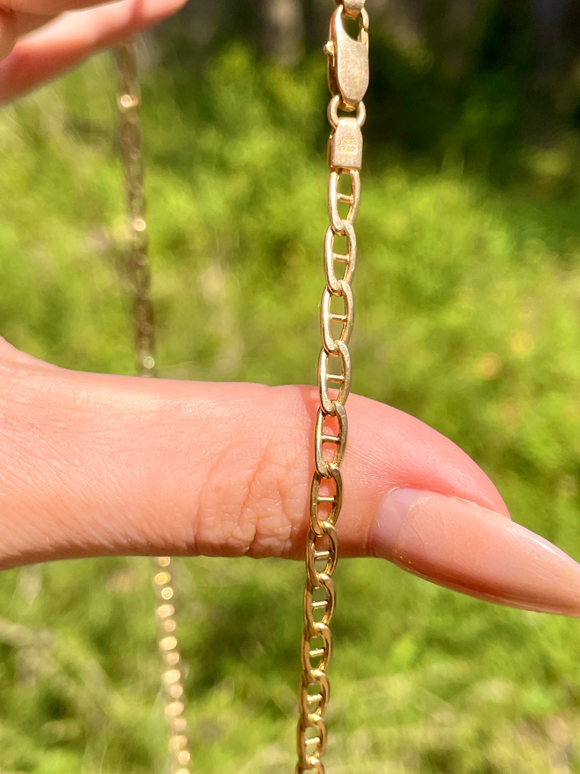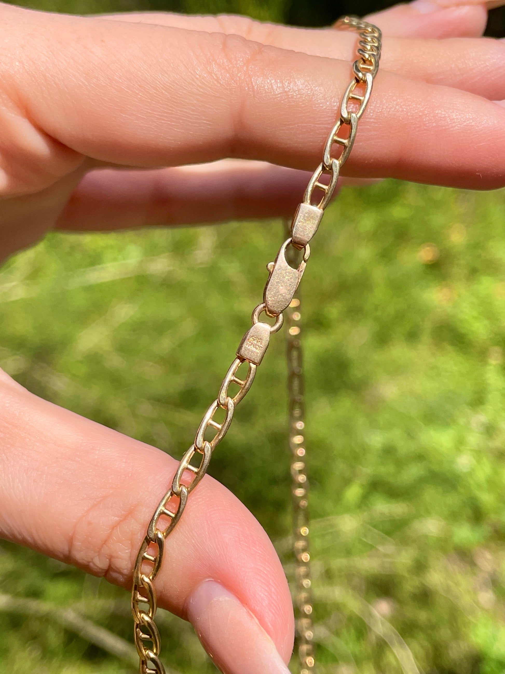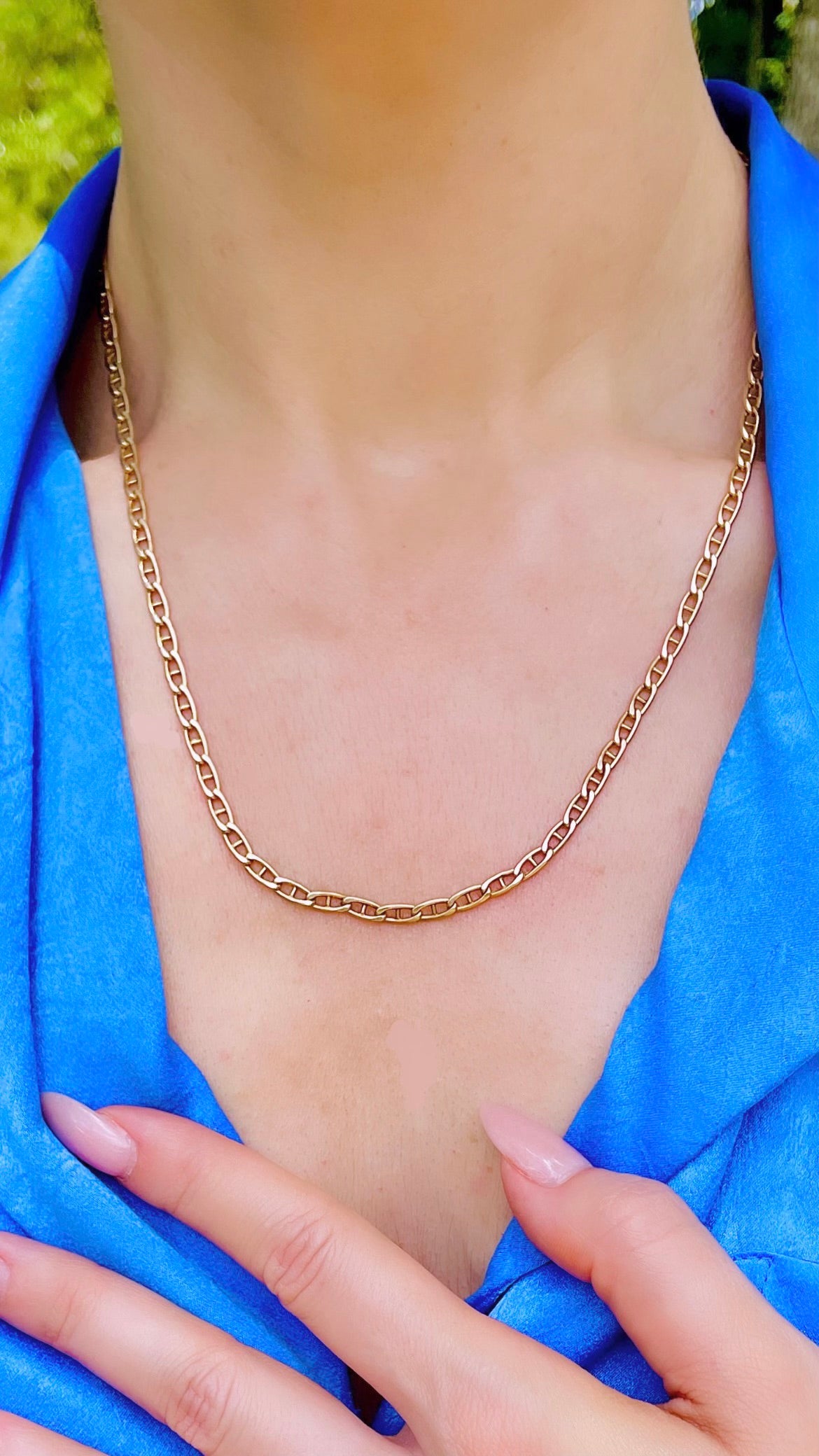 A vintage 14K oblong mariner link chain that is in very good condition with a lobster clasp, and is fully hallmarked. It is 20 inches long. Weighs 7.6 grams. 3.5 mm wide. Links are semi-solid. A nice neutral yellow 14K gold.