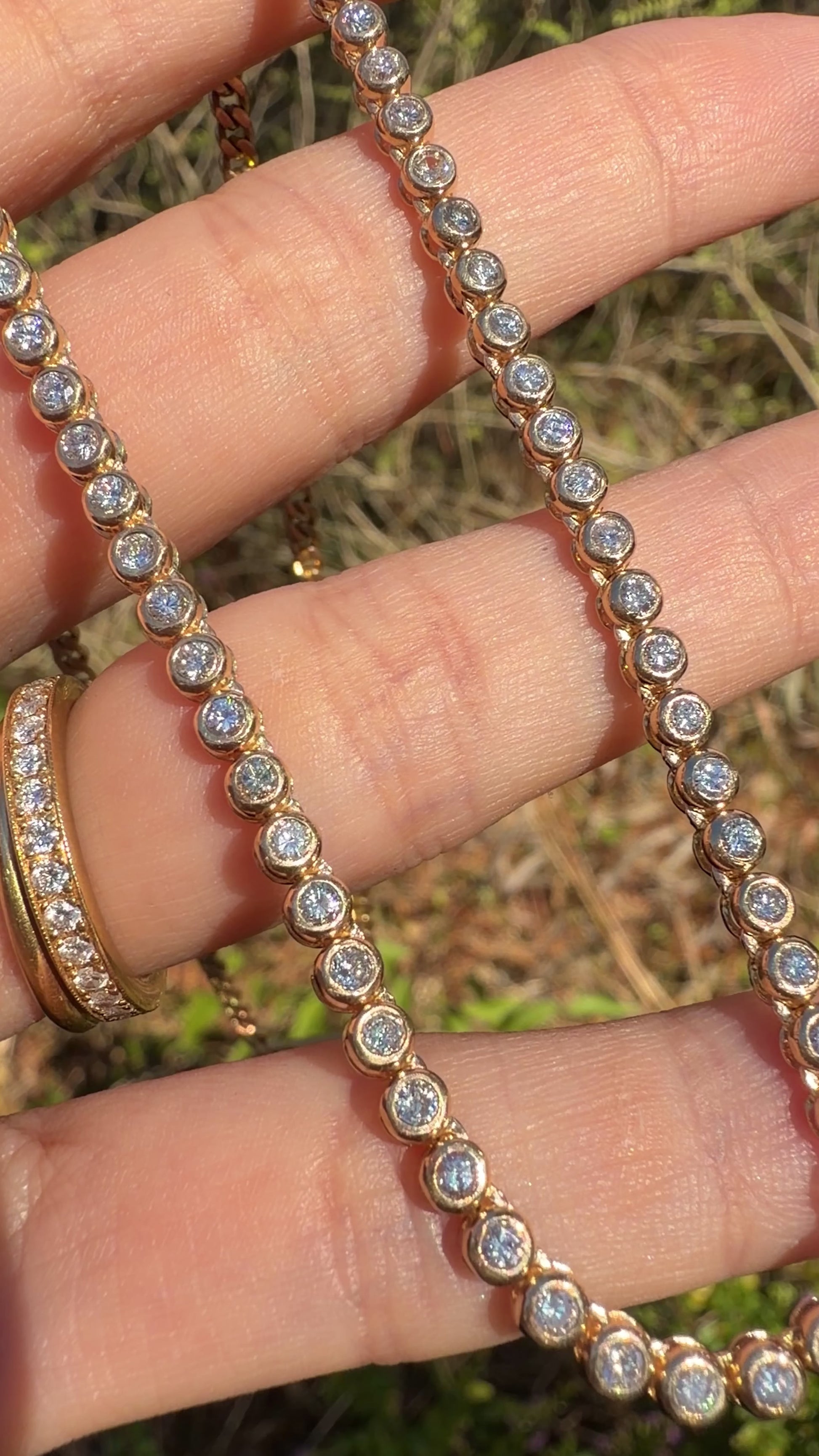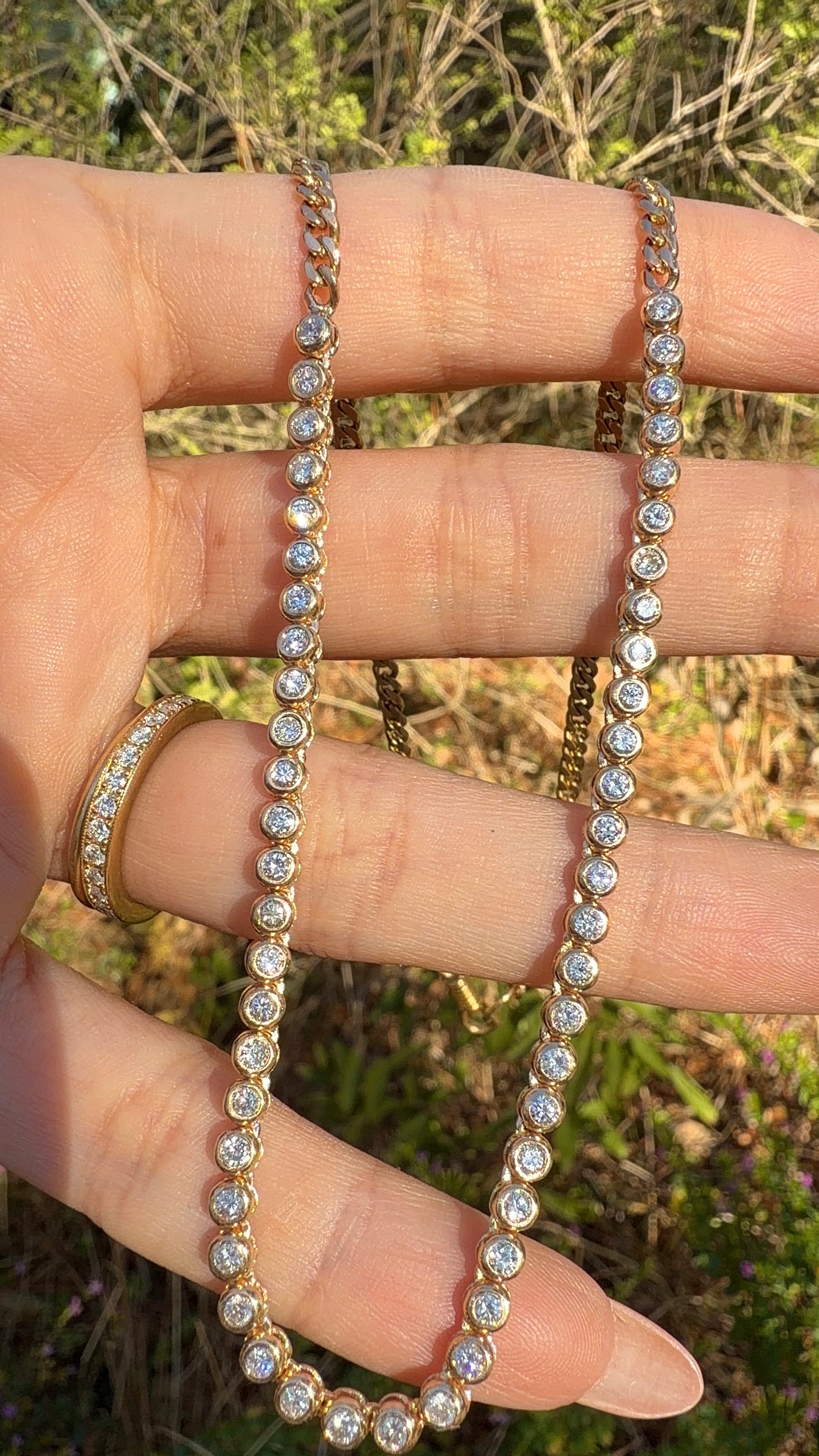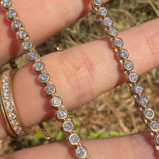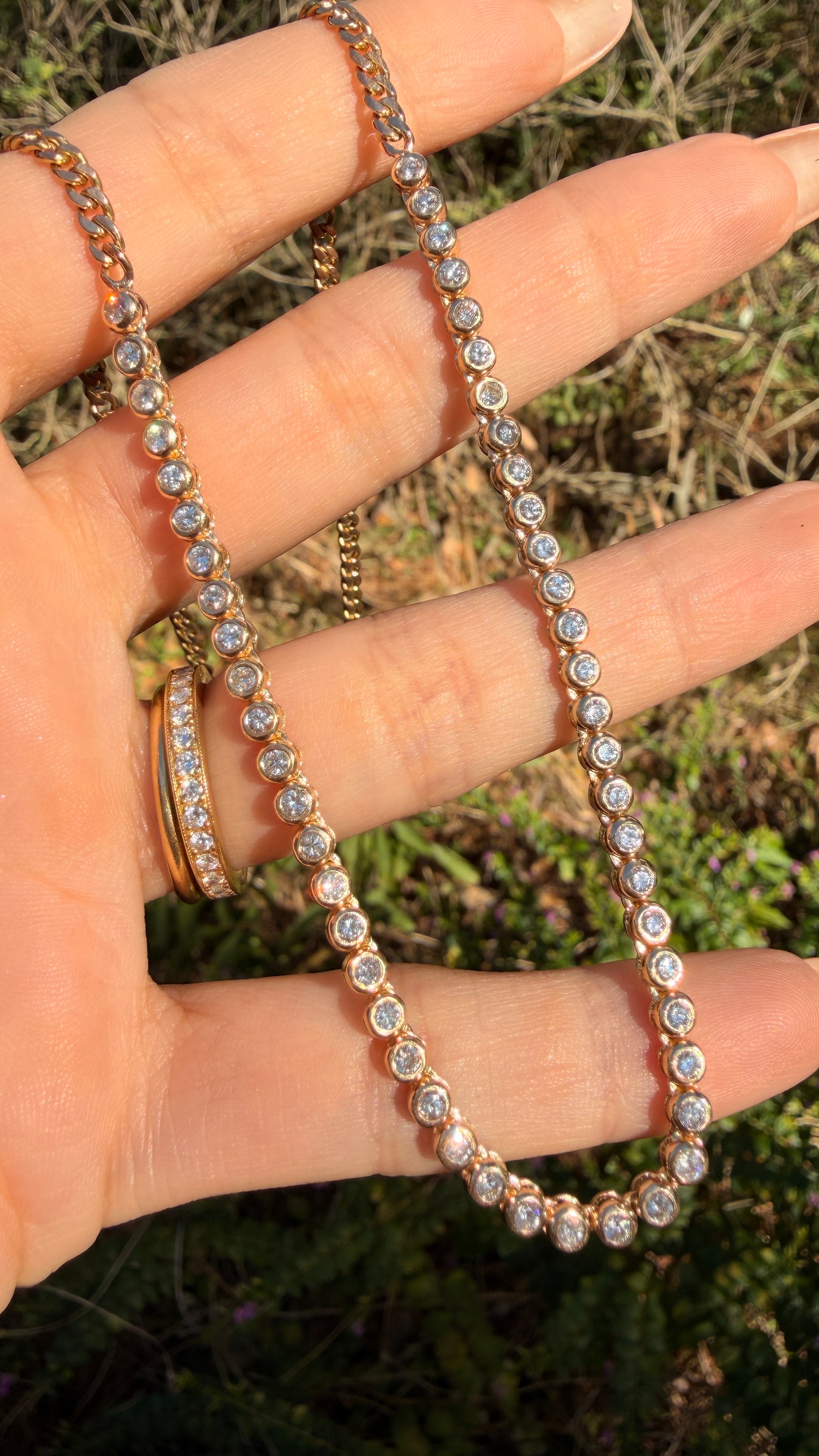- Approx 1.5 ctw of repurposed natural vintage (GH color, VS/SI clarity) diamonds set in our custom yellow 18K bubble bezels, centered on the chain make up 7 inches of the necklace