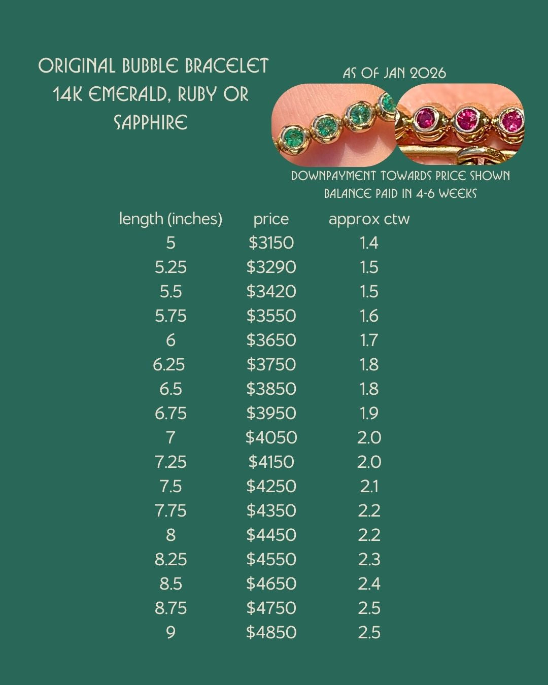 Use buttons in the listing to customize your Original Bubble Bracelet, including length, gold color, and stone. Checkout to reserve your bracelet with an upfront downpayment of $1500 for 14K gold.