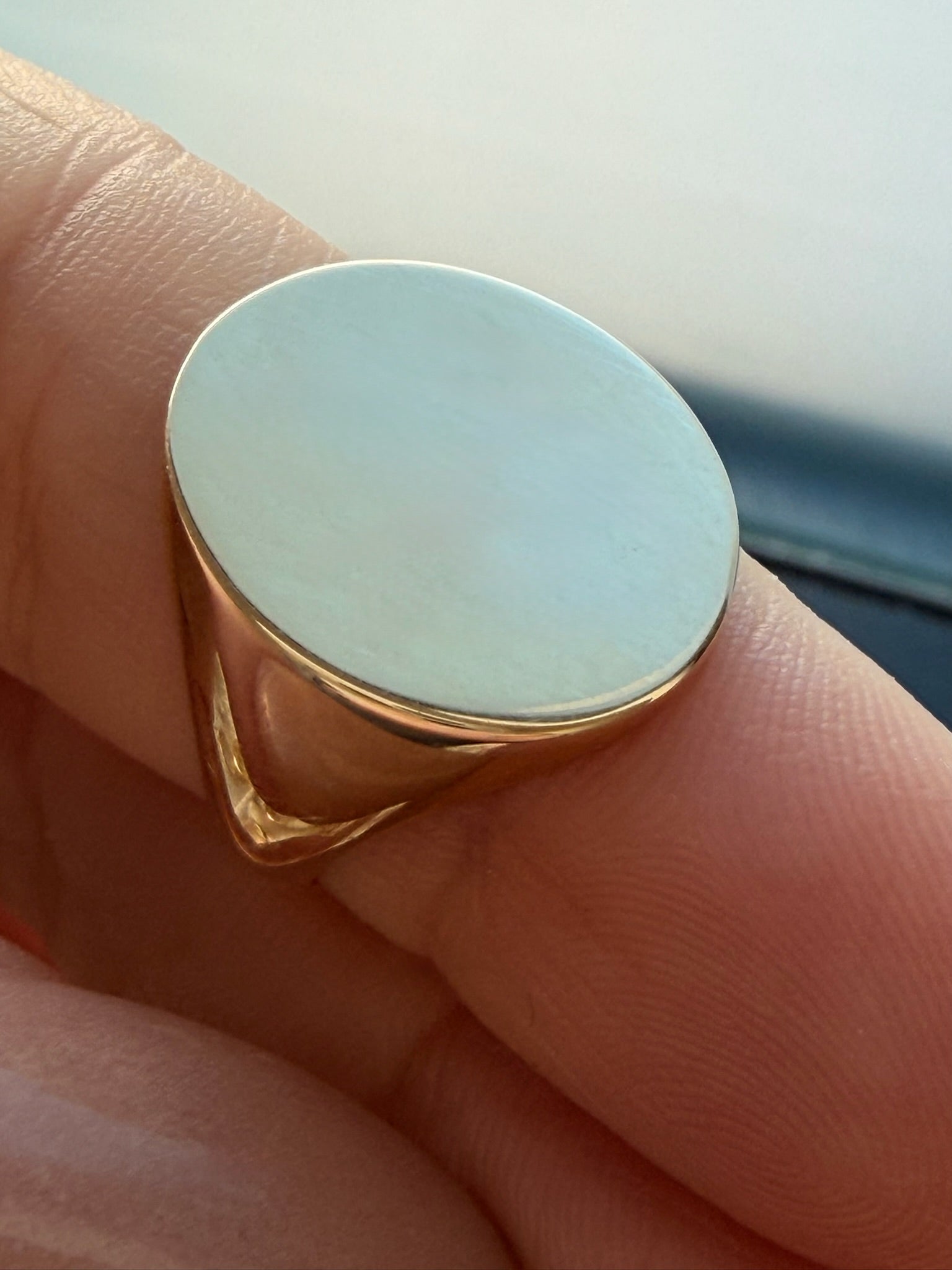 Stretched Oval Blank Slate Signet: Face measures 12.6 x 9.8 mm. In size 3.75, weighs over 5 grams in 14K, over 6 grams in 18K, and over 7 grams in 22K. **note, weight will scale somewhat with ring size.