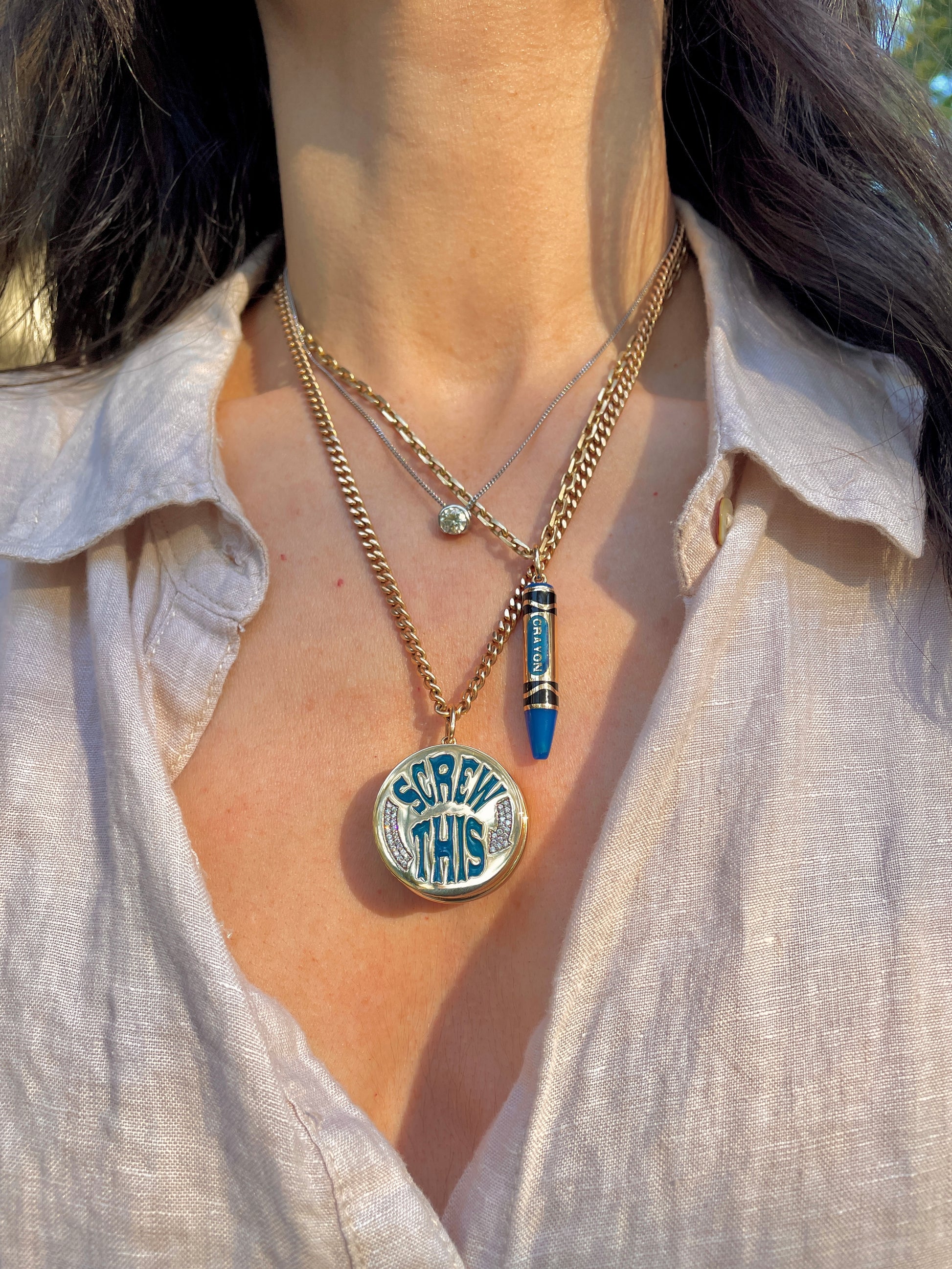 Our original custom Colorful Crayon Pendant is part of 3 Graces of Gold's Plot Twist Collection of personalized made to order talismans inspired by the combination of meaningful symbols, everyday objects, and messages we connect to as we navigate life's twists and turns. An old meets new plot twist on custom jewelry that empowers, inspires, and is a little unexpected.
