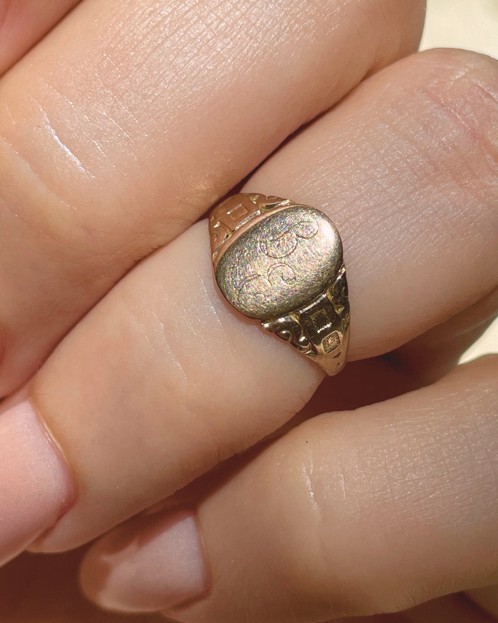 Antique 10K rosy yellow signet with faint “BE” engraving. Maybe it's your initials, or that of a loved one. Or just a reminder to be present. Currently size 2.25 (sizable), measures 9 mm at widest. Weighs 0.8 grams. In very good preowned antique condition.