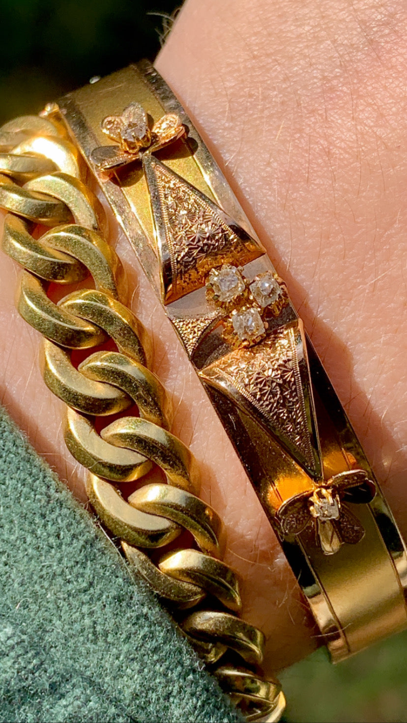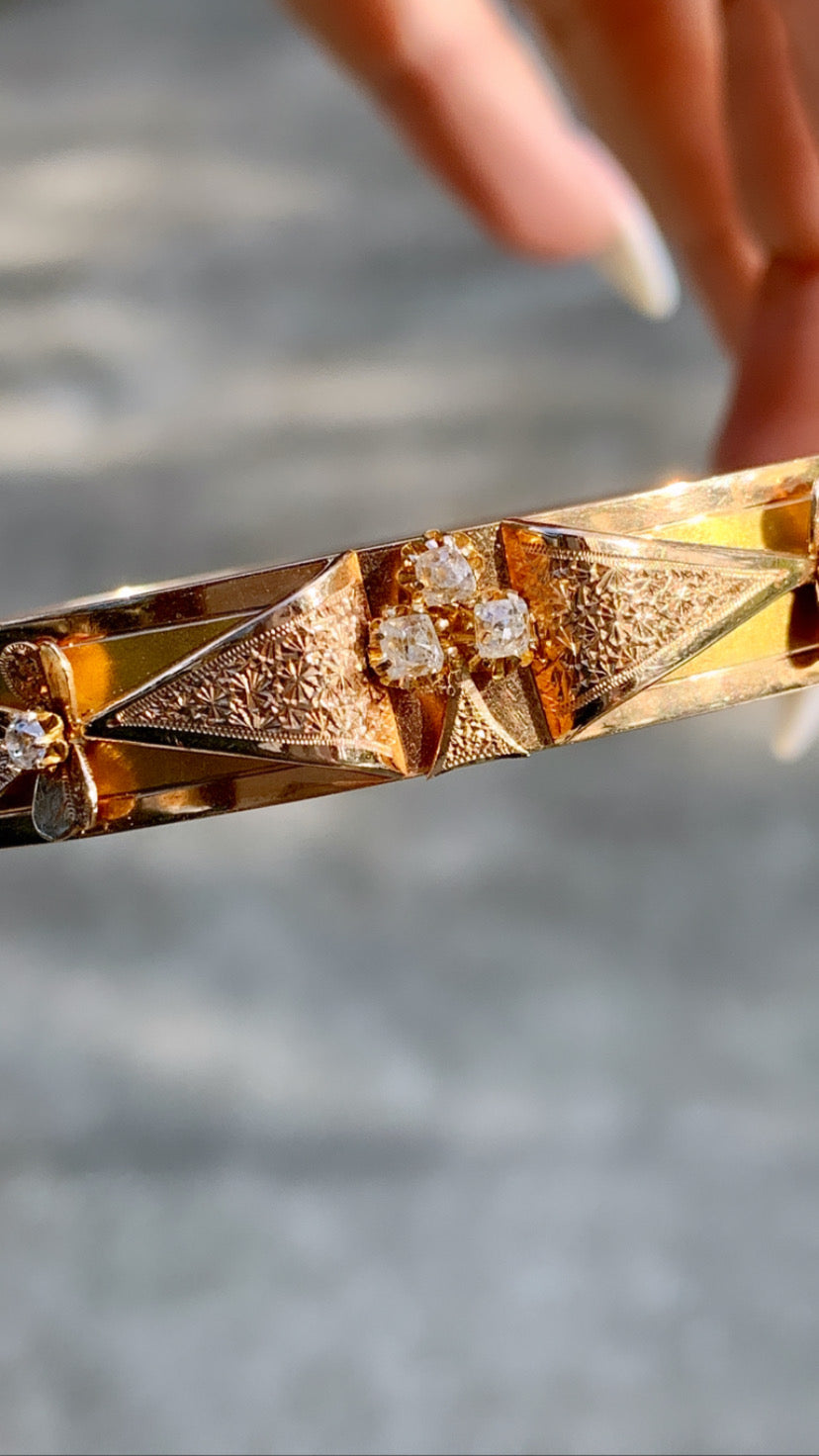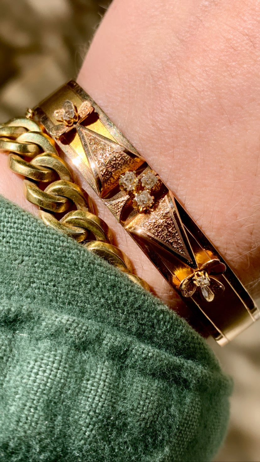 Antique 14K old cut diamond clover hinge bangle, with 2 patterned clovers on sides with center set 2.2mm stones and a diamond trefoil with 2.8-3 mm stones at total estimated .42 carats. The old cuts are chunky, bright and beautiful - all original except for 1 side stone replacement (has a chip hidden by a prong). Beautiful warm gold with use of multiple finishes including a high karat yellow bloomed finish across the center half adding dimension and attention to all the gorgeous details and patterns. Nice and wide 10.1 mm. Very minor dents near clasp, otherwise minimal. Weighs 12 grams, Interior measures 2.35 x 2.1 inches. Fit my 6.25 inch wrist perfectly, could fit a little smaller or larger comfortably. $1150