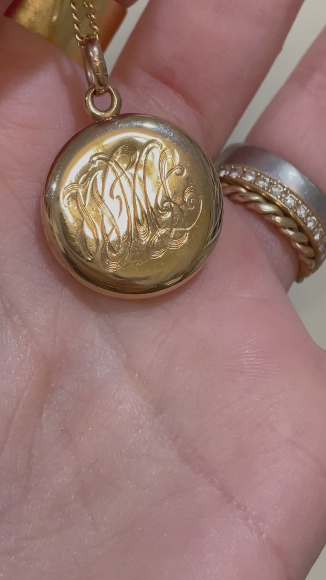 Antique 14K Old Mine Cut diamond star set locket. Measures 1.2 inch long x .9 inch wide. Weighs 5.7 grams. Diamond measures ~3mm x 3mm and has a small chip on the table (condition reflected in price). Hand engraving of initials that appear to be ÒWMLÓ. Has a sturdy snap closure. A classically beautiful piece to be worn solo or layered with other pendants. $460
