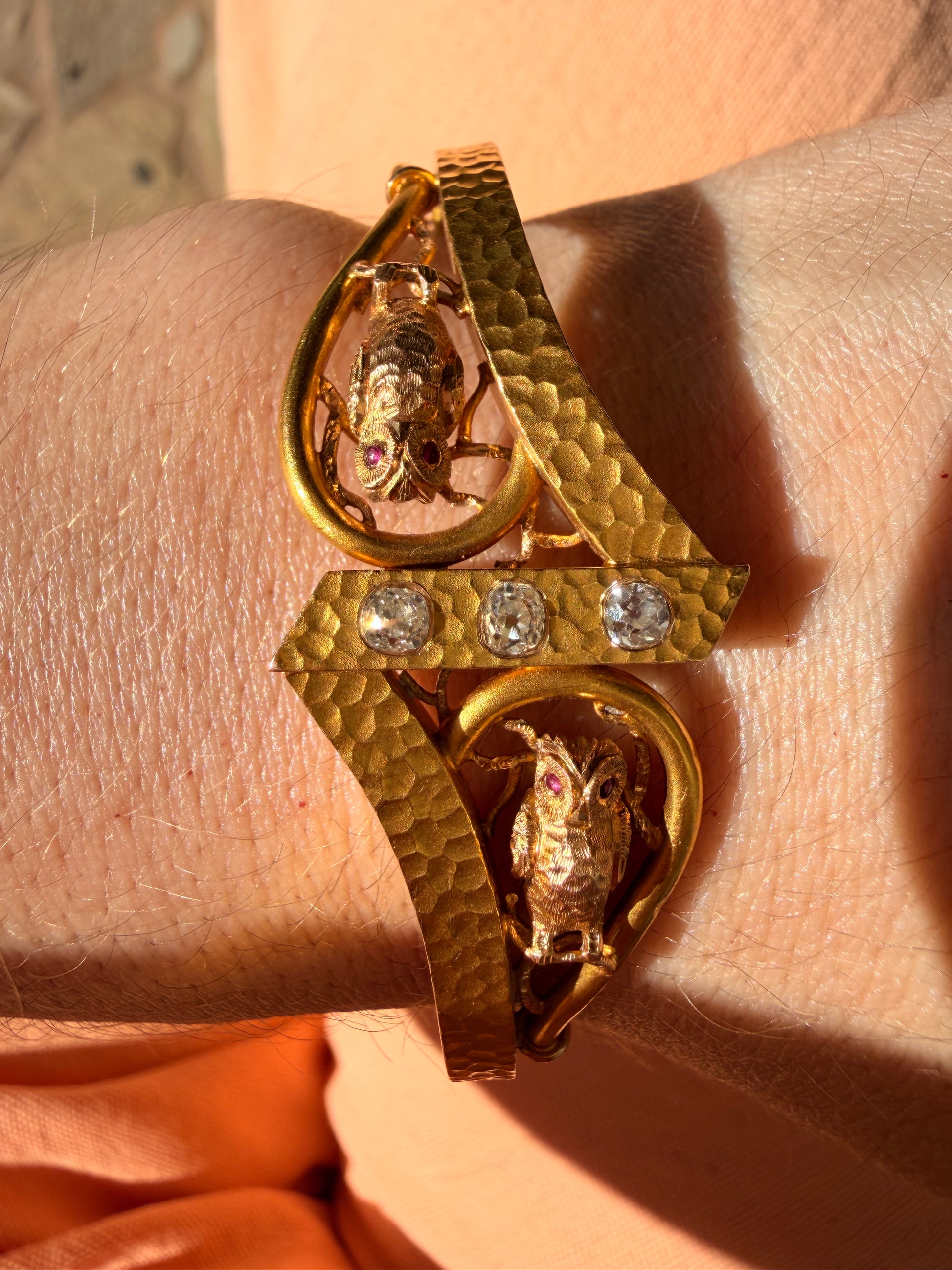 Antique 14K owls hinge bangle with approx .35ctw old mine cut diamonds