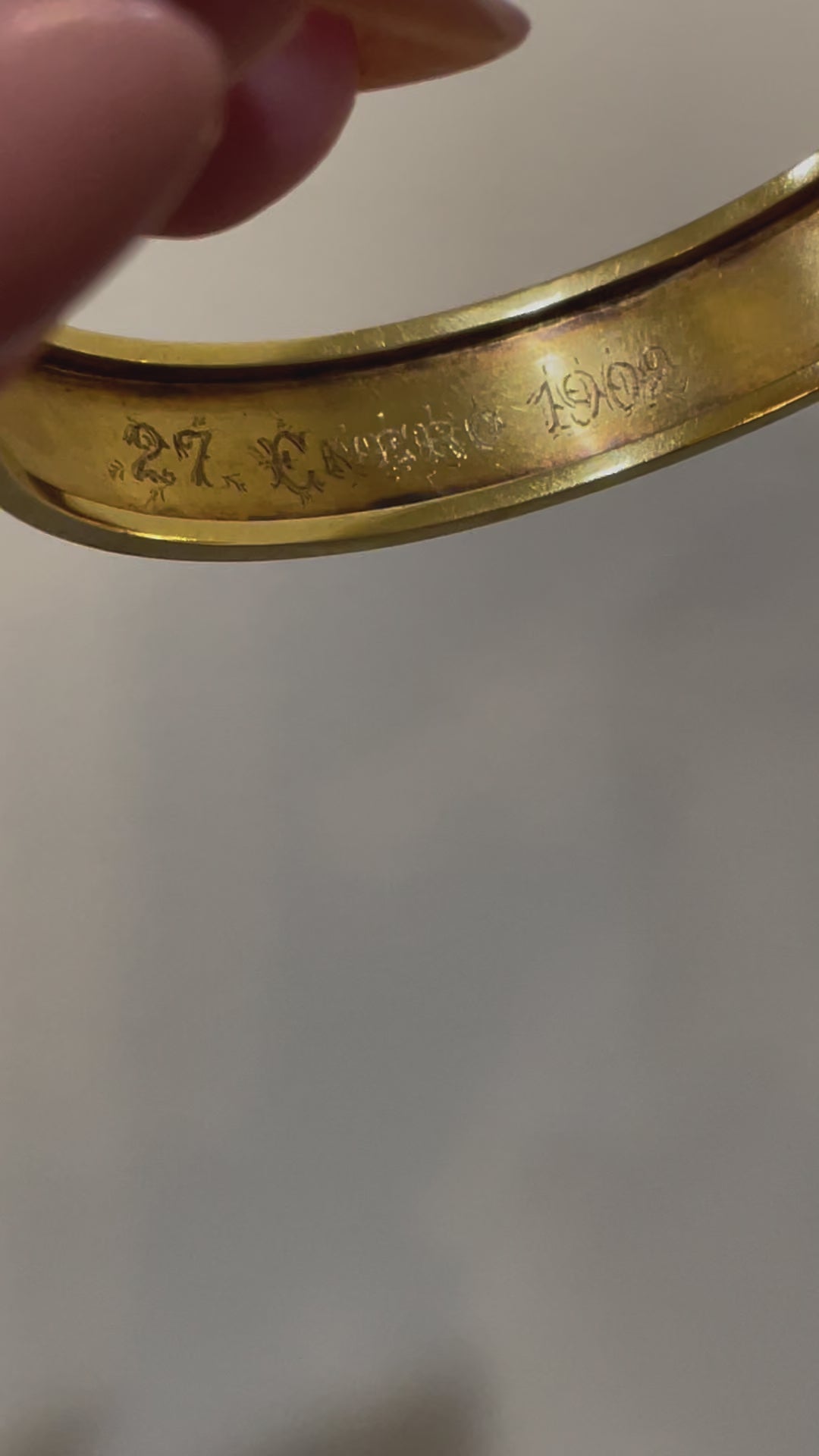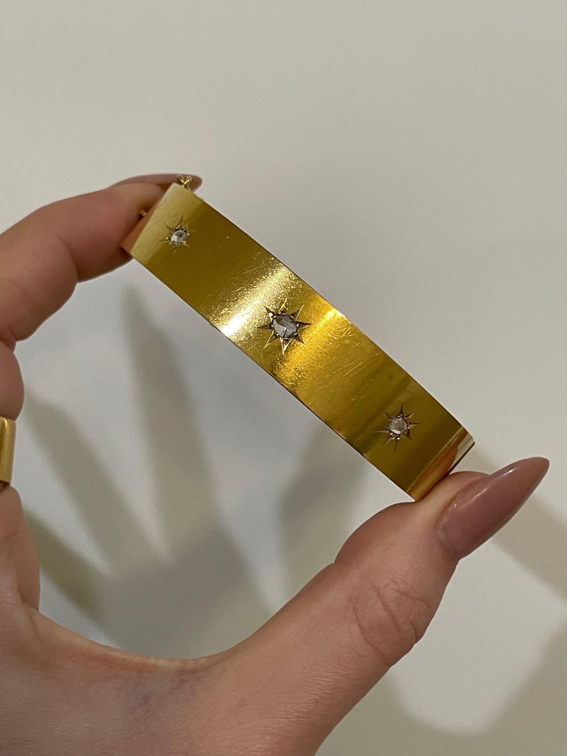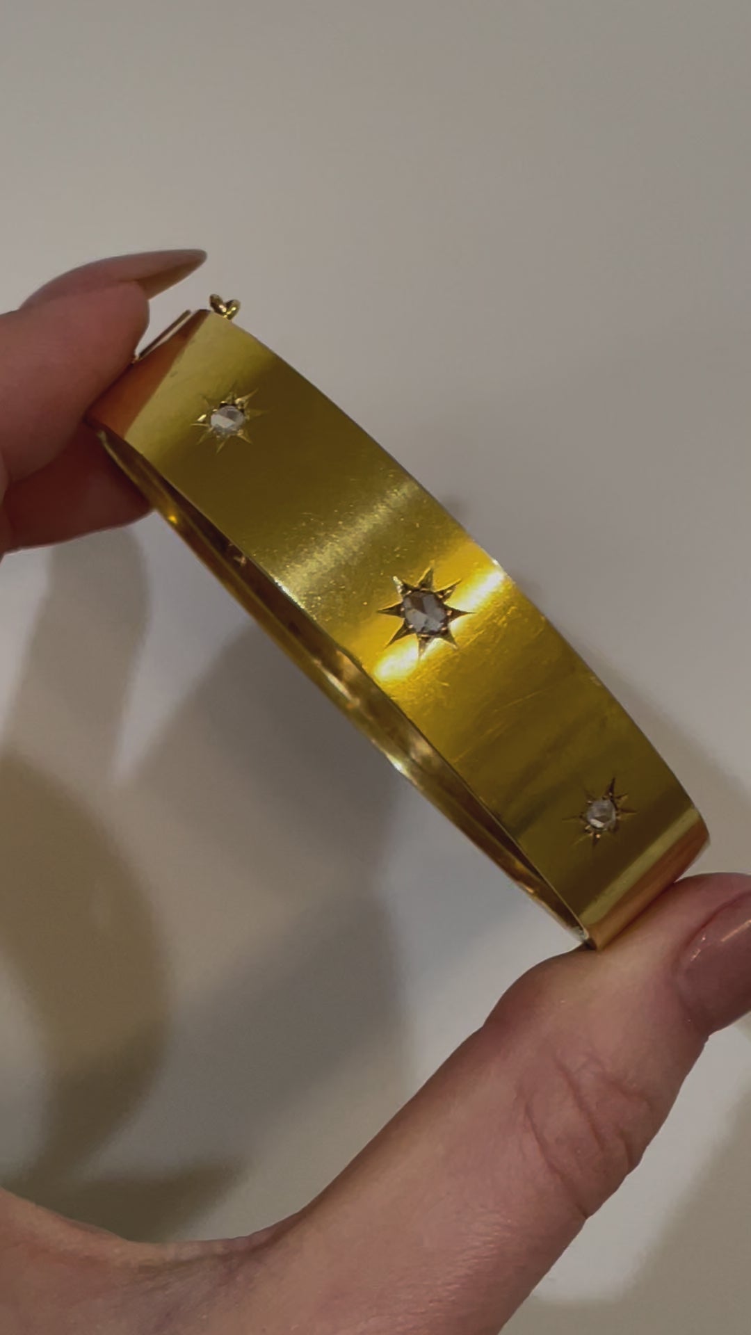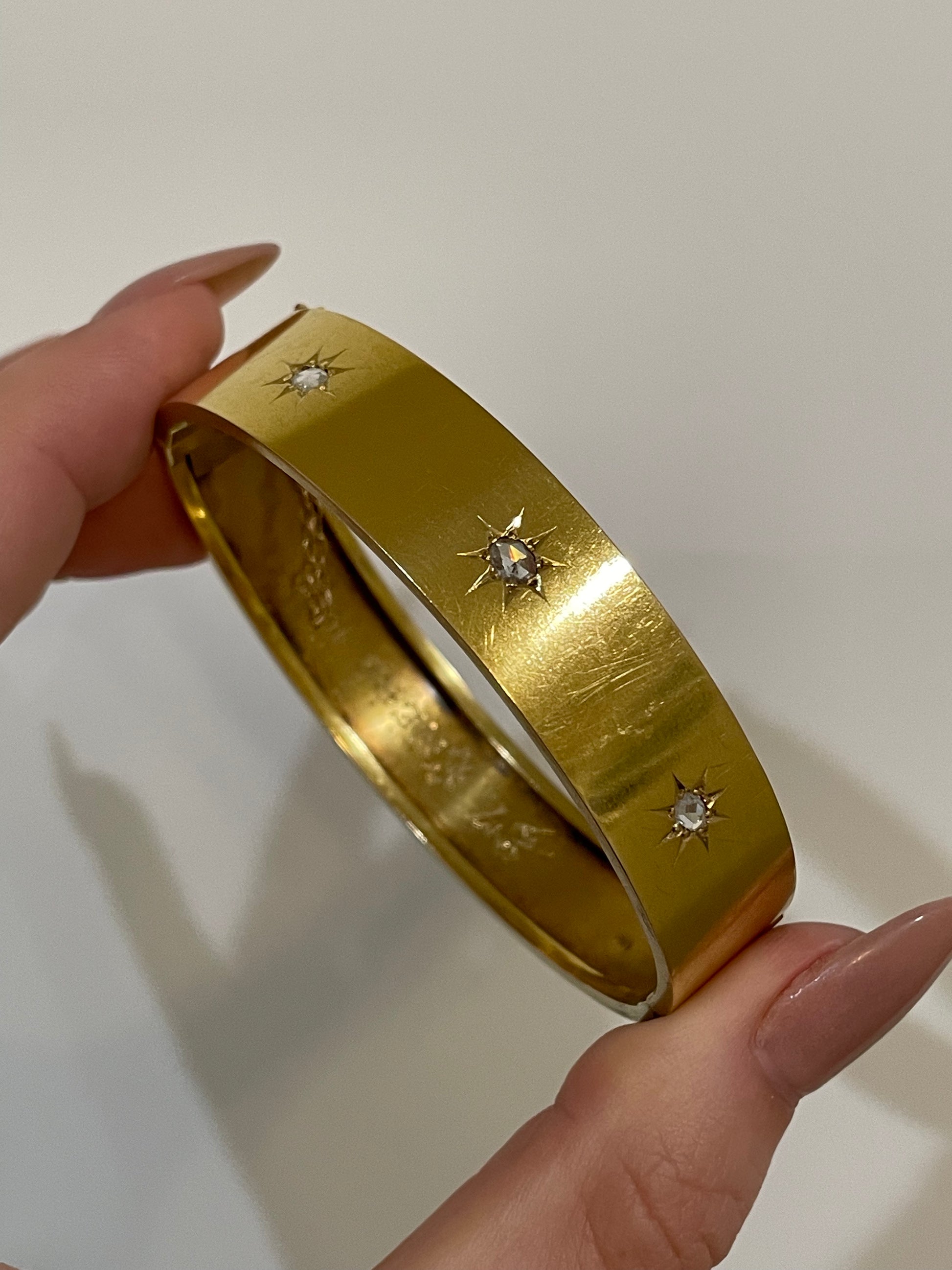 Antique 18K rose cut diamond star set wide oval hinge bangle. Weighs 28.5 grams, and 13.5 mm wide (doesnÕt taper). Stones range 2.5-2.7 mm wide x 3.3-3.9 mm long. Interior is 2.4 x 2.11 inches. Best fit for a medium sized 6.25 to 6.75 inch wrist. Interior engraving for Enero (January) 27, 1902. $2700