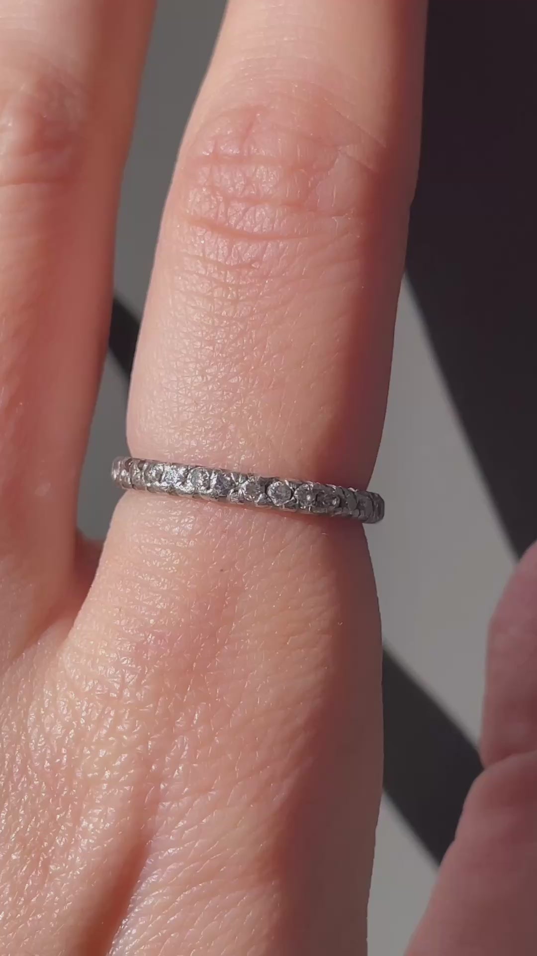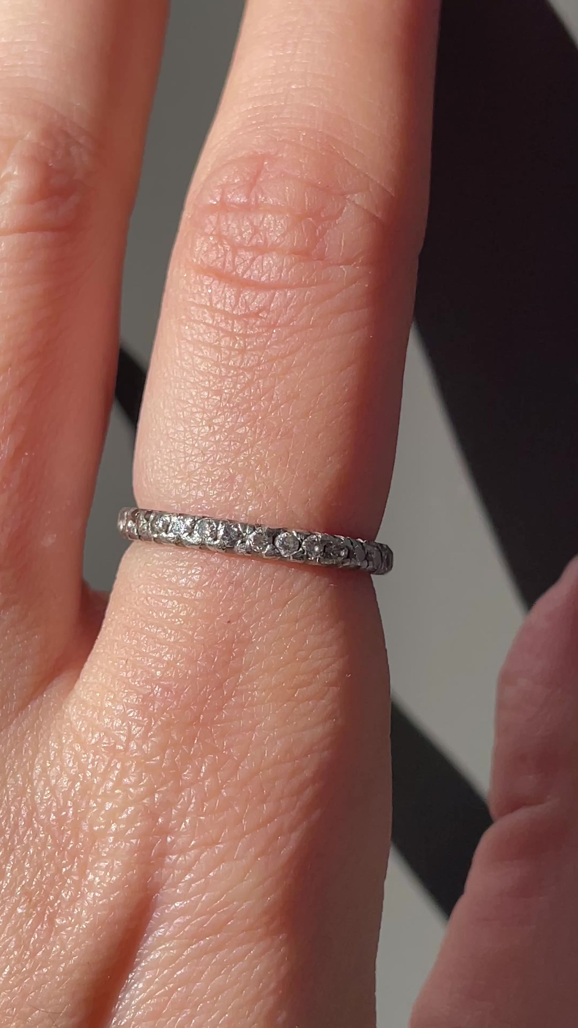 An Antique platinum 14K approx .62 ctw diamond eternity ring, size 6.75. Ring measures 2.4 mm at widest. Weighs 2.4 grams. Diamonds are grayish in color. In very good preowned condition.