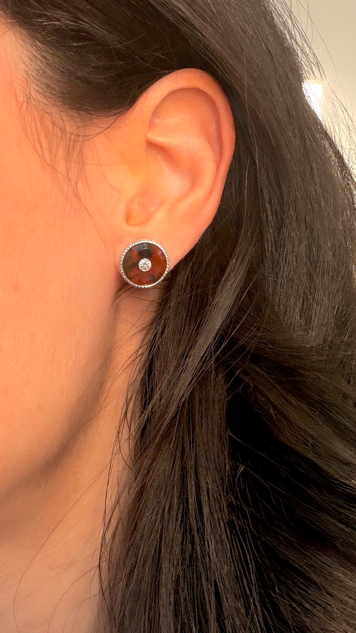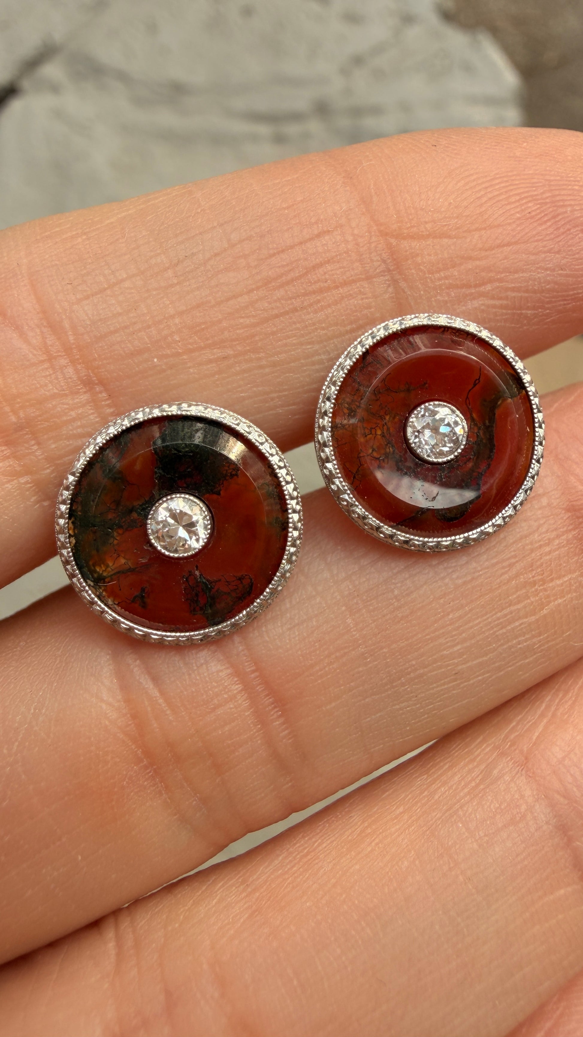 A beautiful eye catching pair of Antique Platinum and yellow 18K agate and .22ctw old European cut diamond disc post earrings. Agate is a vibrant earthy red with dark green swirls. Diamond and agate are bezel set in platinum with fine mill grain and etched details, while post of earring and earring backs are yellow 18K gold. Diamonds are bright white G color, VS/SI clarity. Earrings measure 13 mm diameter. Weigh 3 grams combined. In good preowned condition.