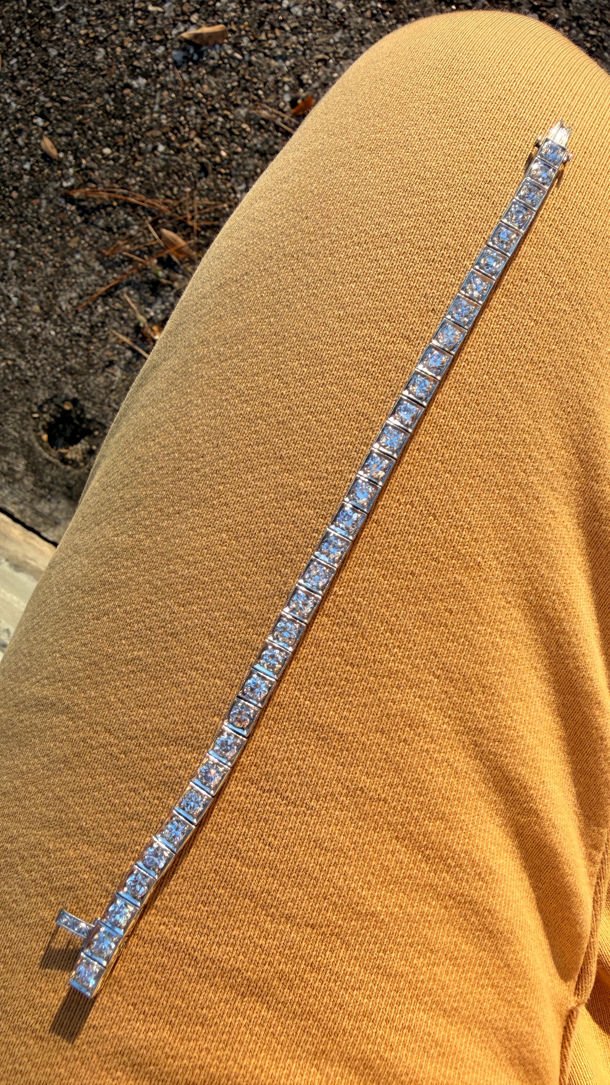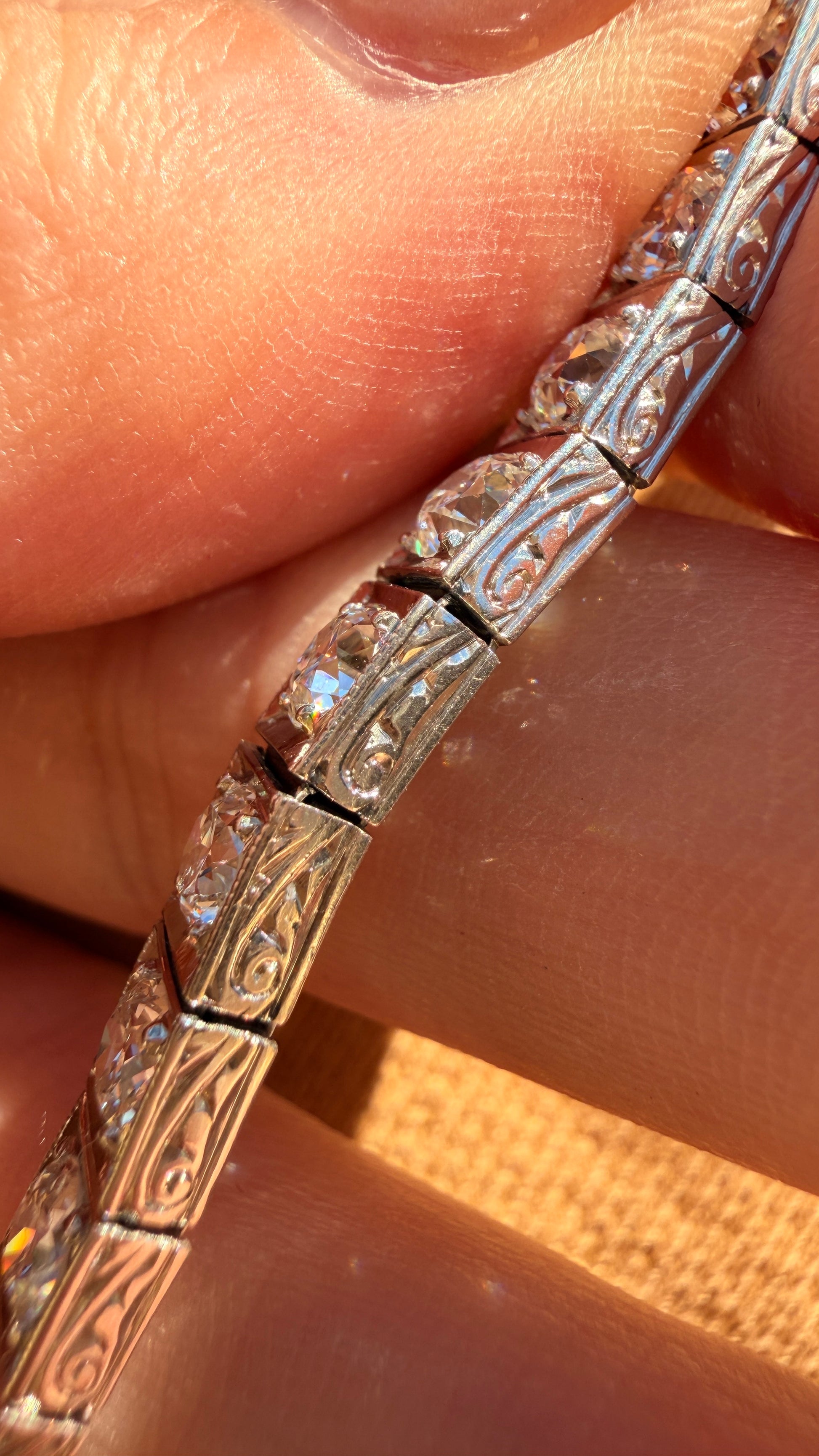 A stunning Antique circa 1910s-20s Platinum approx 6ctw Old Mine Cut Diamond and European Cut Diamond Line bracelet, 6.5 inch long. Sizable (Each link 10mm). Set with an impressive mix of bright GH color and mostly VS2 clarity natural antique diamonds which are very well matched and super fiery. Square links are 4.9 mm wide and serve as great protection for the stones. Platinum links are nice and chunky with beautiful side hand engraving, and all link connections are in great condition with minimal wear. Tab clasp is secure. The bracelet has a great concealed safety clasp that swings underneath (our favorite kind, just as we use on our custom bubble bracelets, as it doesn’t get snagged on clothing). Fabulous and classic piece that’s gorgeous solo or stacked. Weighs 18.6 grams.
