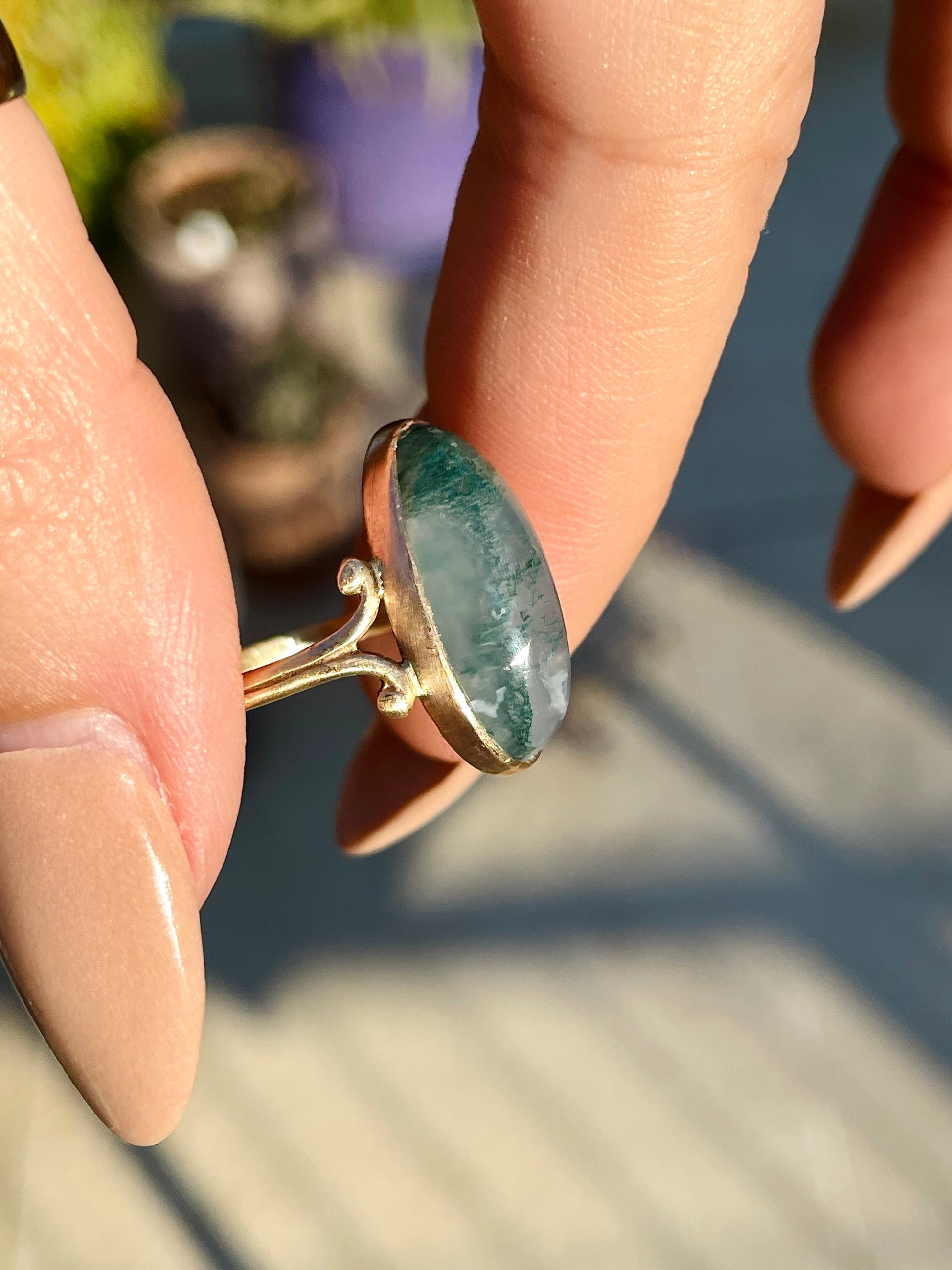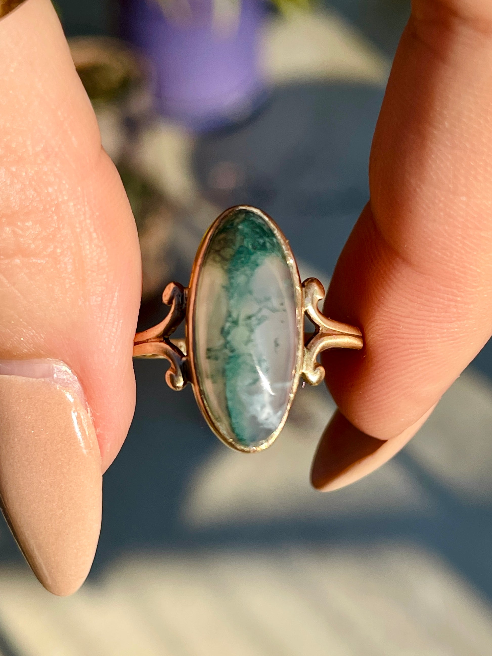 Antique rosy yellow 14K most agate bezel set ring, size 9.25. Sizable. Weighs 2.3 grams. Measures 19 mm widest. Tested 14K.