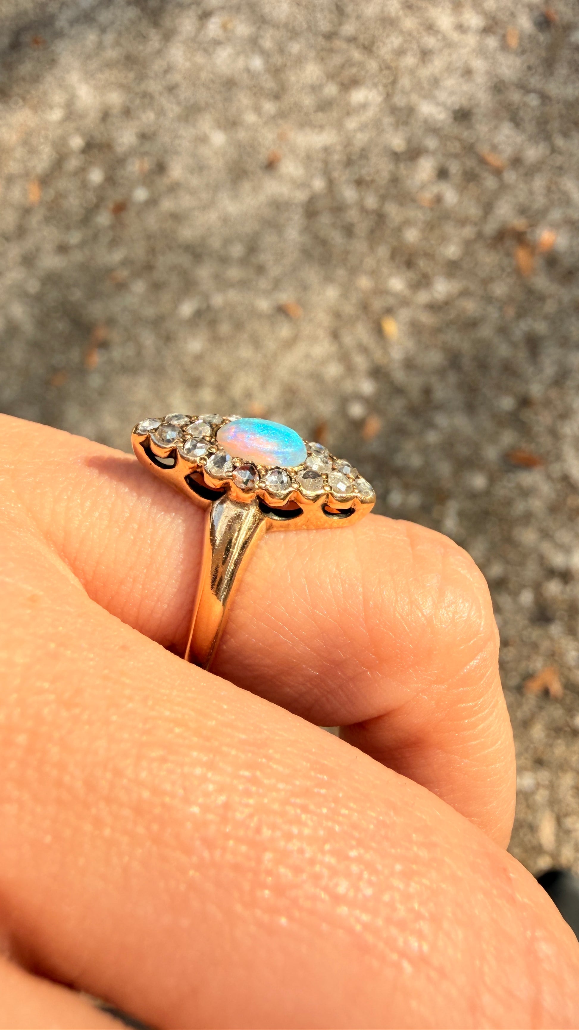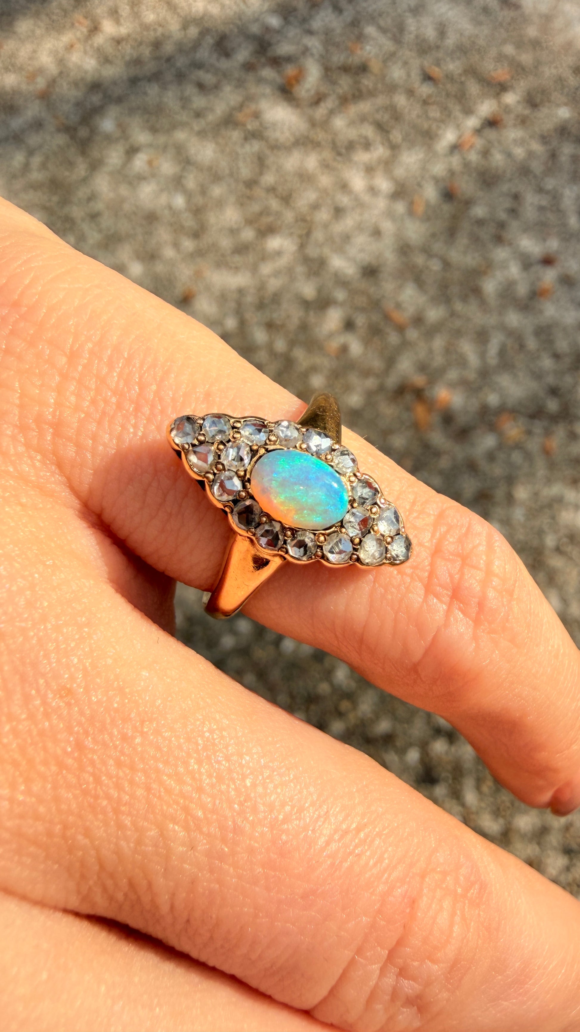 Obsessed with this one - a really beautiful Antique yellow 14K opal and approx .4ctw rose cut diamond navette ring, size 5. Sizable. A 6.1 x 4.5 mm opal cabochon with tons of color play including orange, yellow, green, and blue surrounded by moody grey-white rose cut diamonds. The pairing of the warm and cool tones is so striking! The shape of this navette is really attractive, a bit more bubbly versus elongated as is typical, and the gold on the shoulders is generous, not super delicate. Face measures 17.7 x 8.6 mm. Weighs over 3.8 grams. Hallmarked.