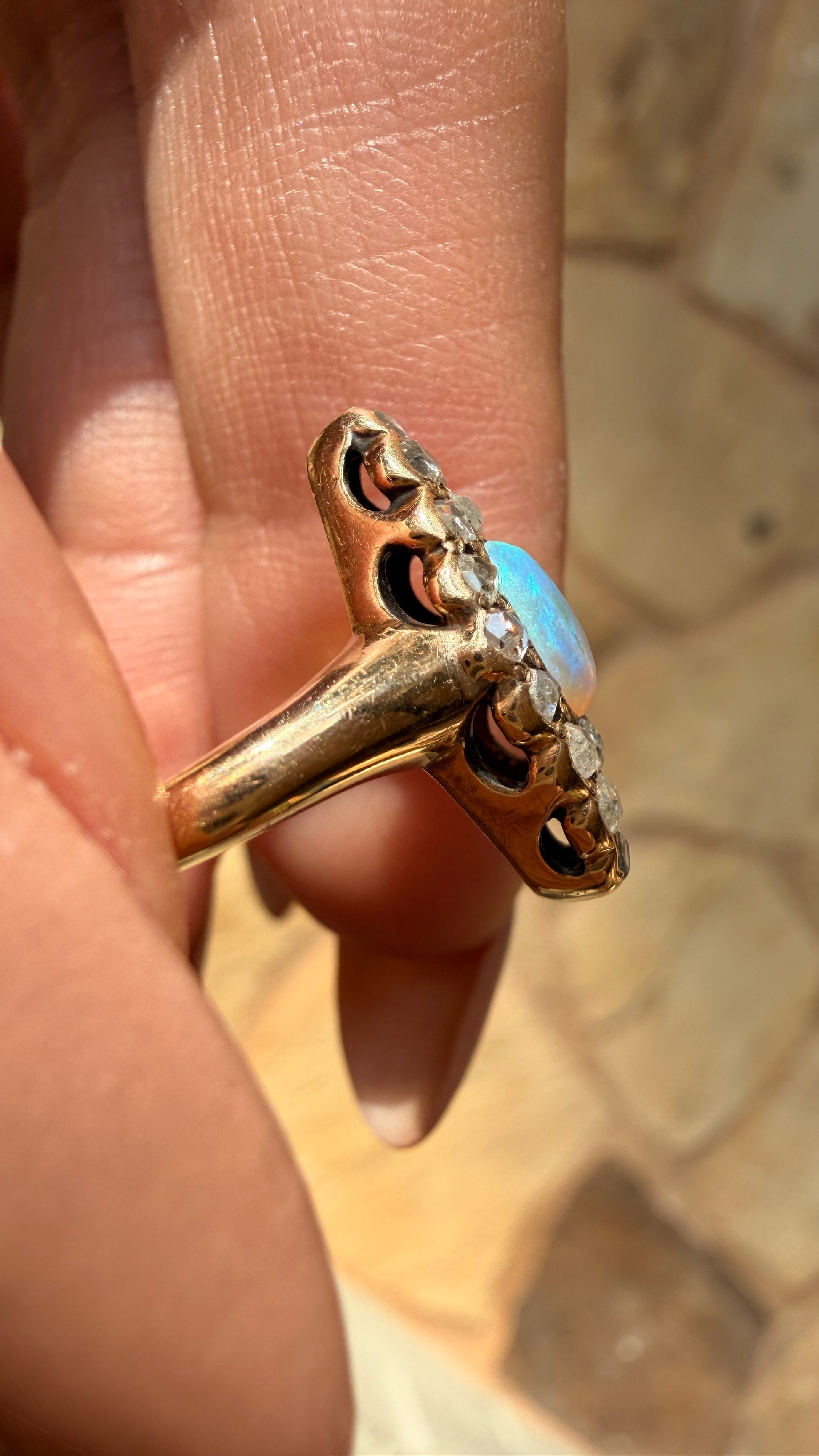 Antique yellow 14K opal and approx .4ctw rose cut diamond navette ring, size 5