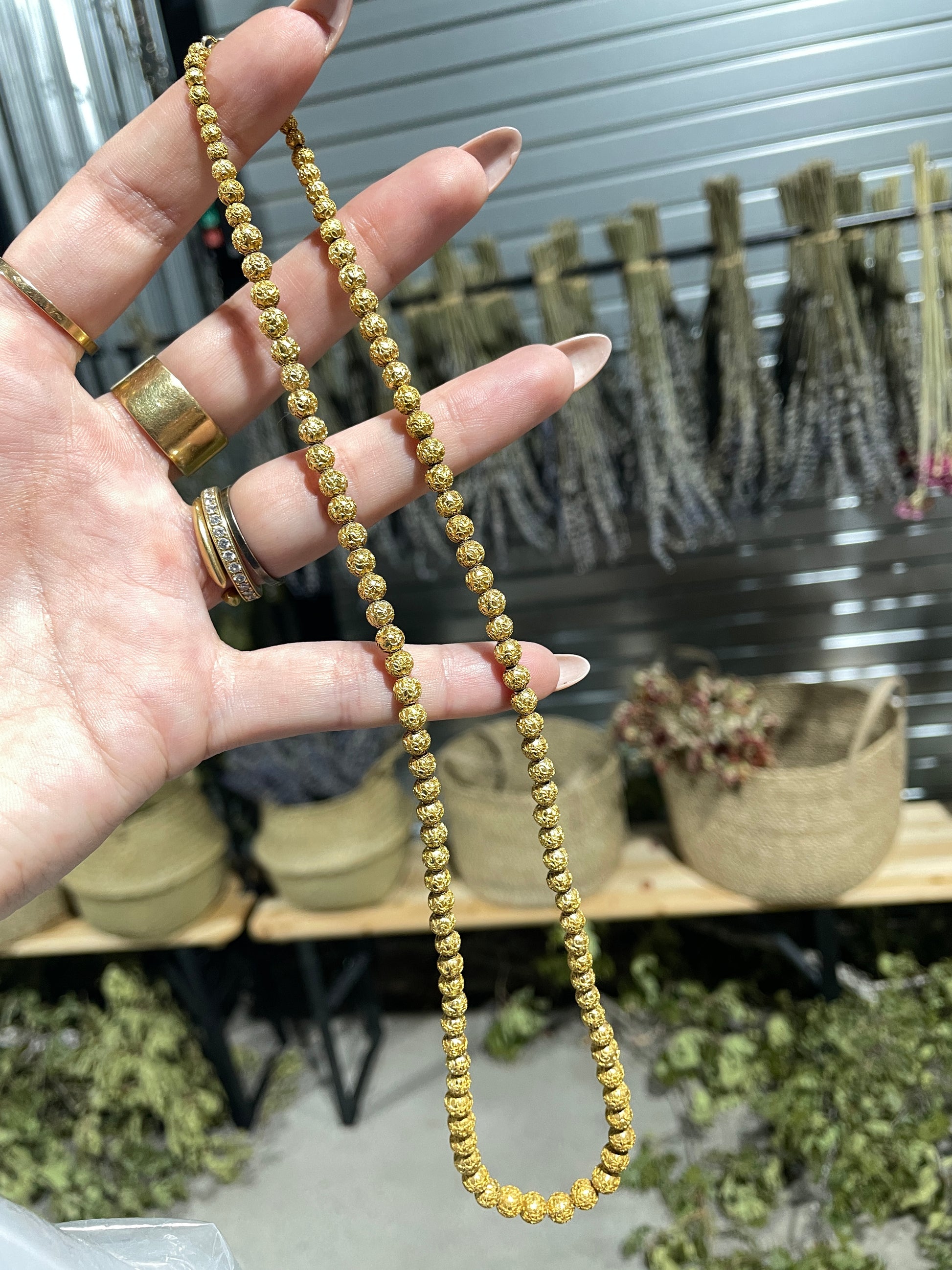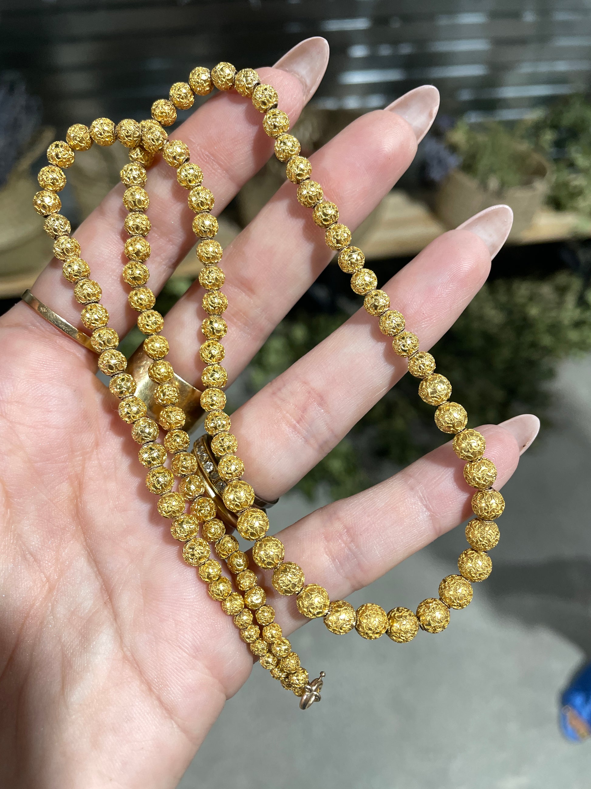 Super fun and wearable antique yellow 14K textured graduated bead chain with bullet clasp. Very rich in color. In very good preowned condition.