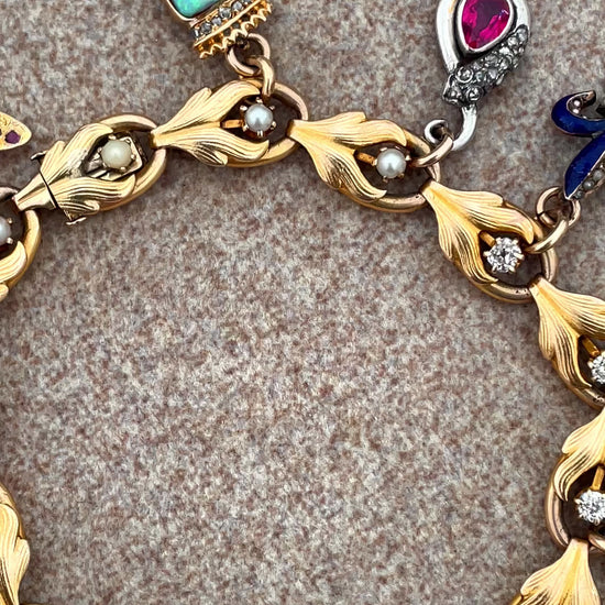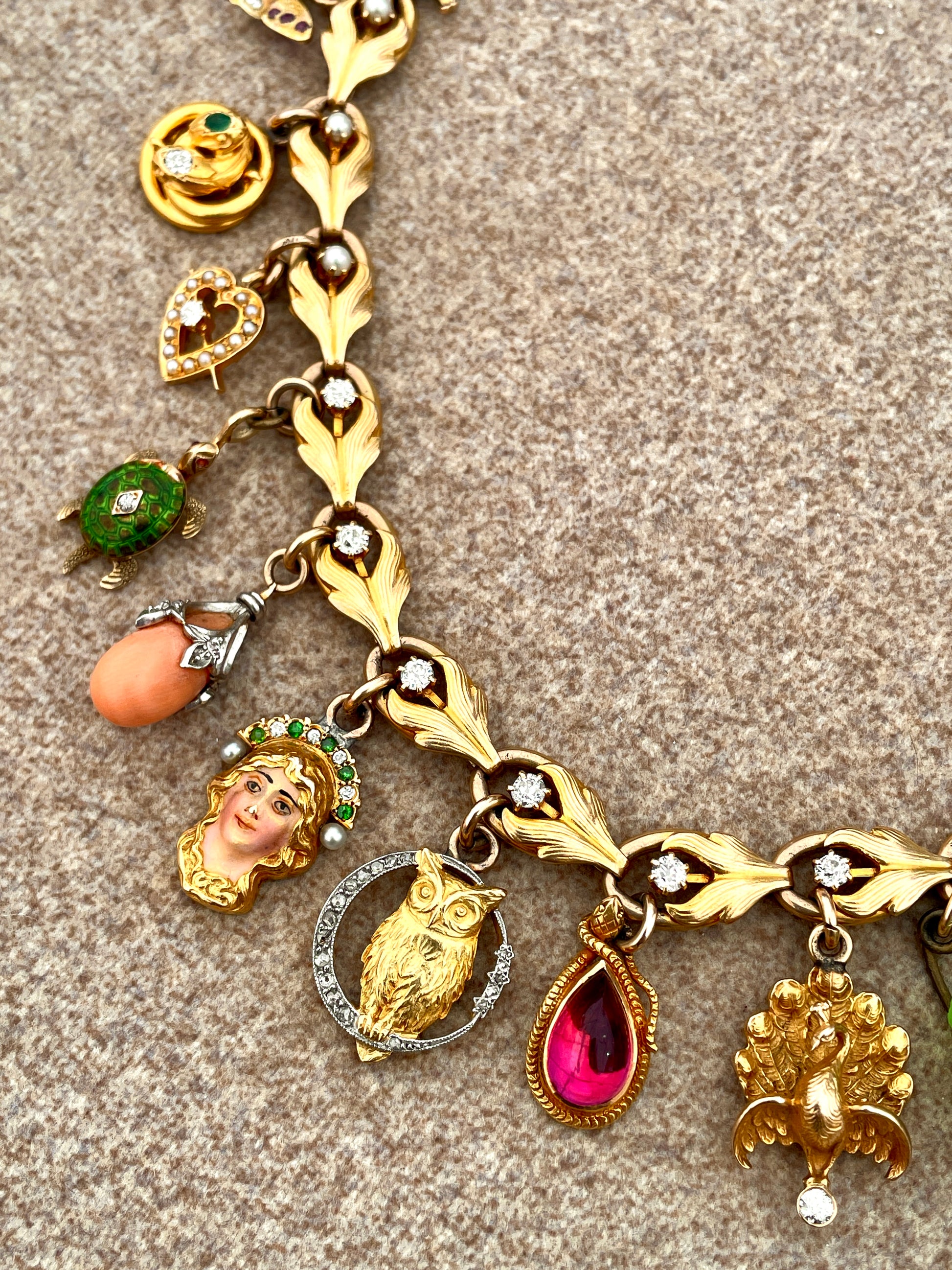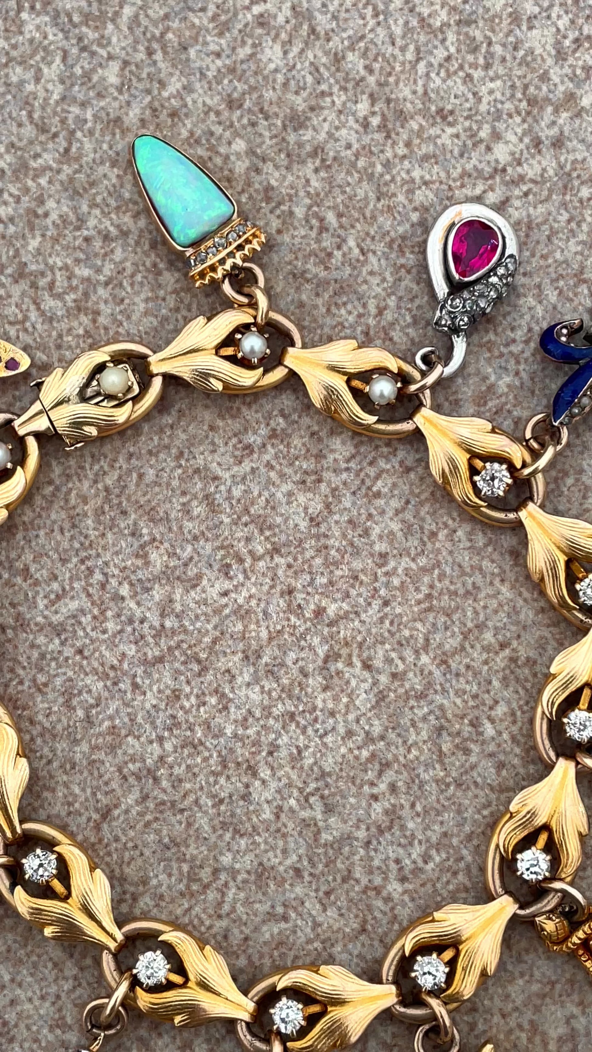 Antique yellow 18K and 14K charm bracelet with old mine cut diamonds, pearls, gemstones and enamel