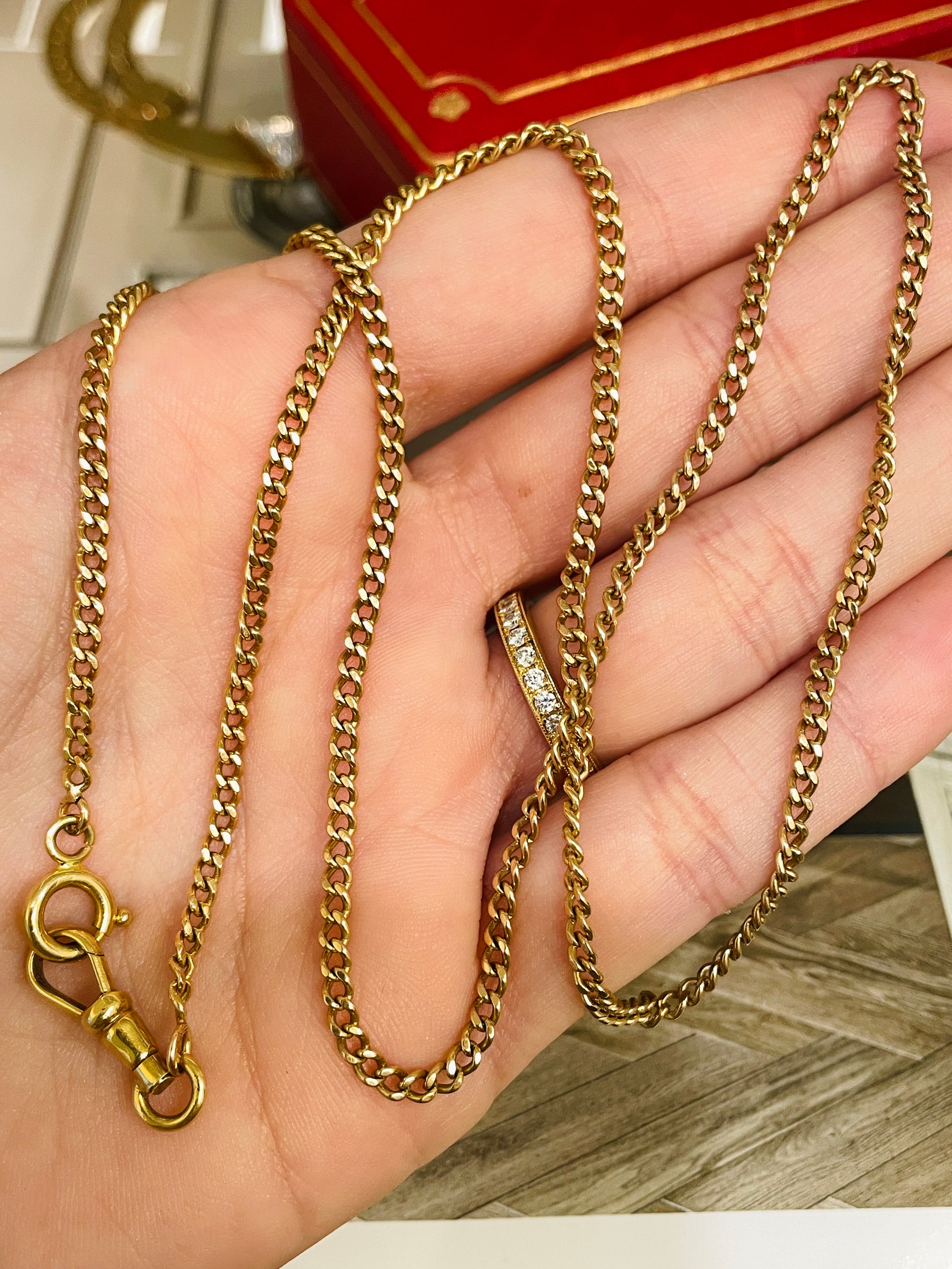 A really useful Antique yellow 18K curb link watch chain with dog clip, 23.5 inch long. Links are solid construction, measuring 2.7 mm wide. Weighs 14.3 grams. In very good preowned condition.
