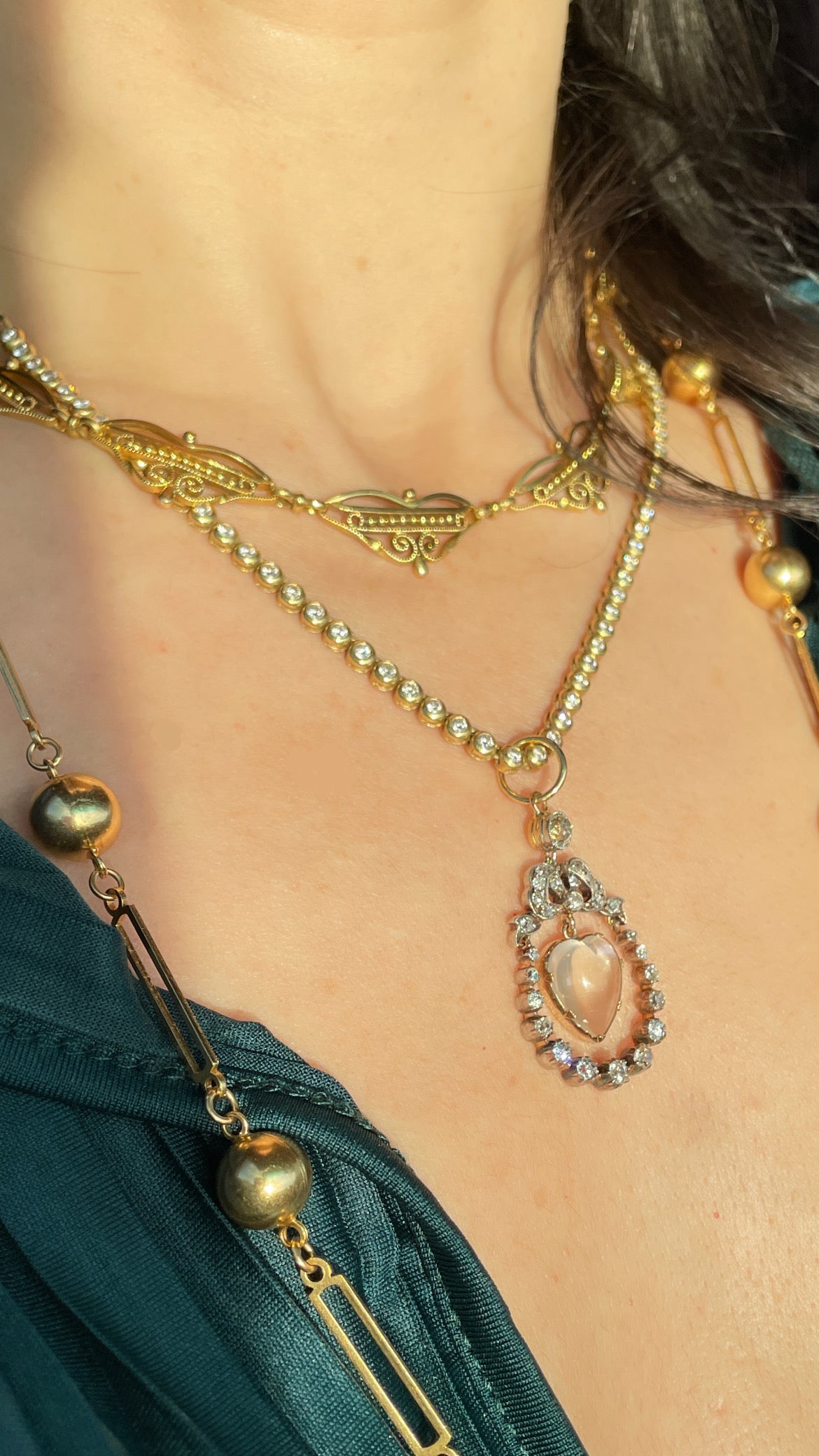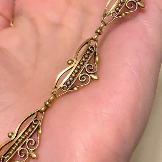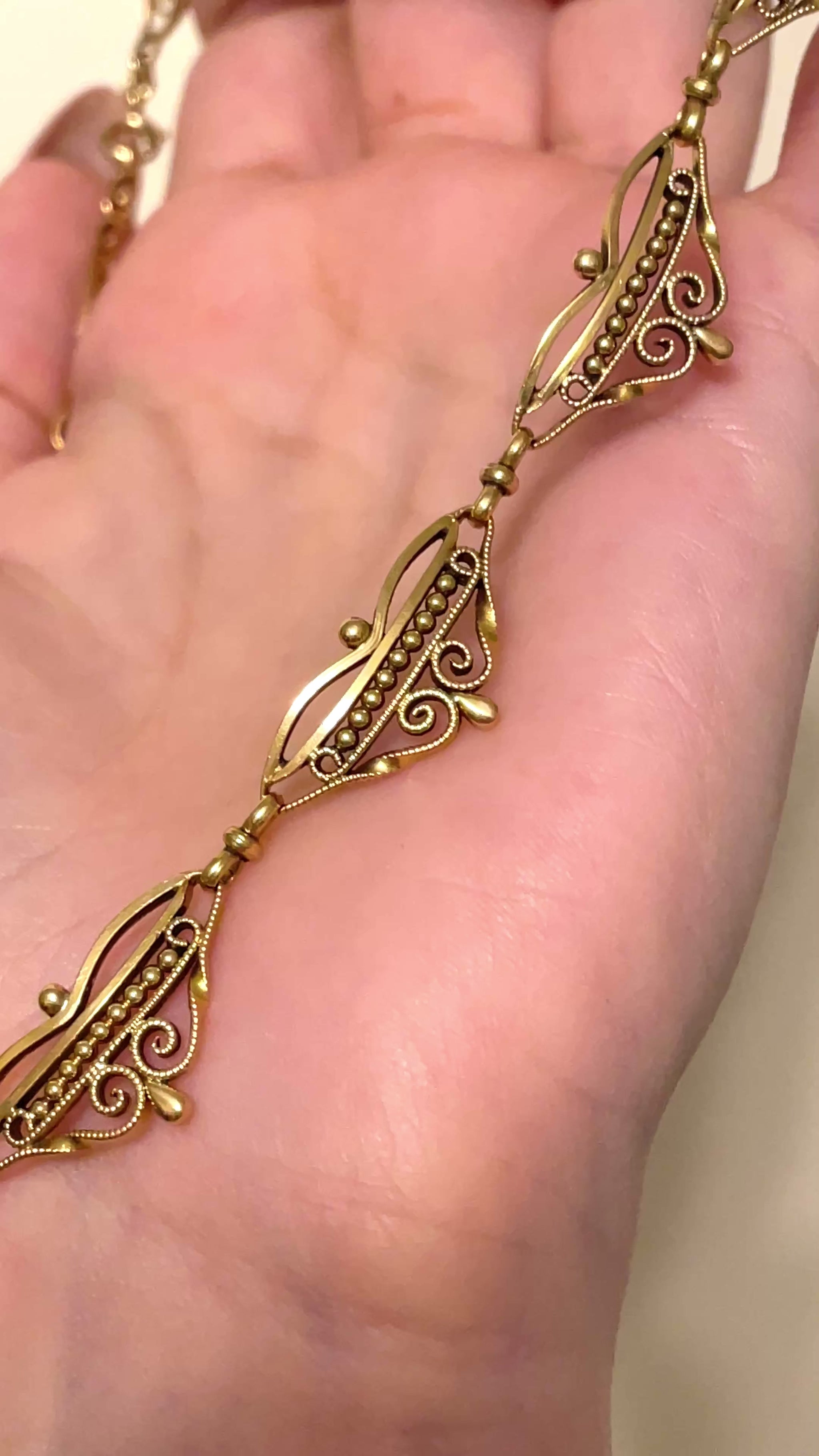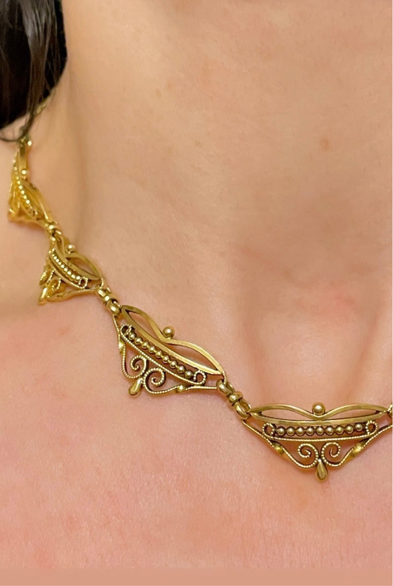 Antique yellow 18K French ornate scrolled link collar necklace, 15.5 inch