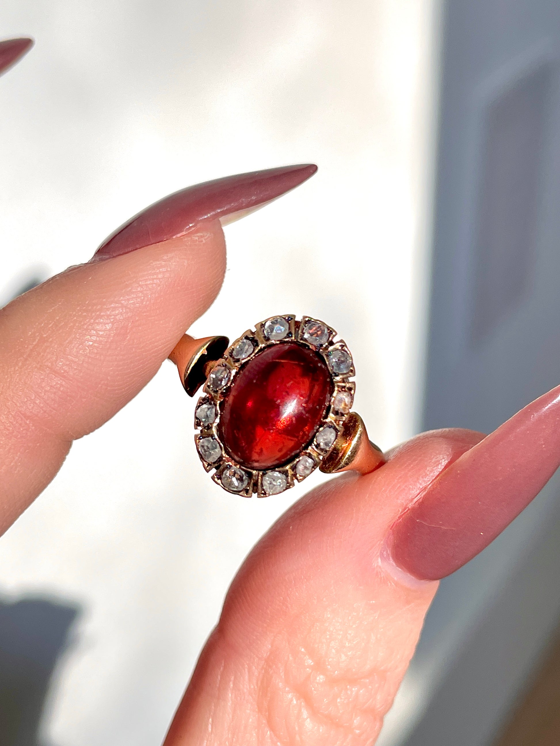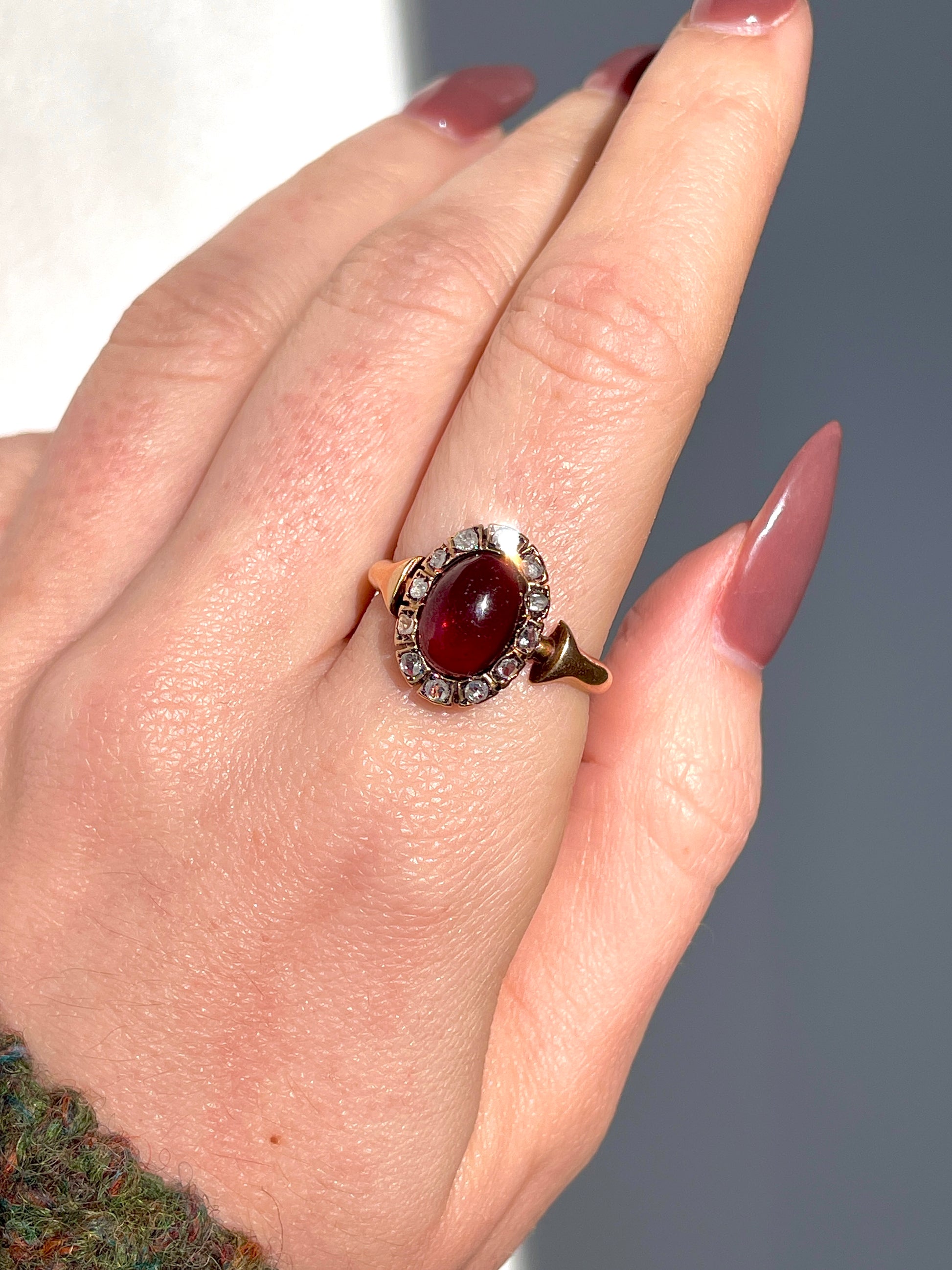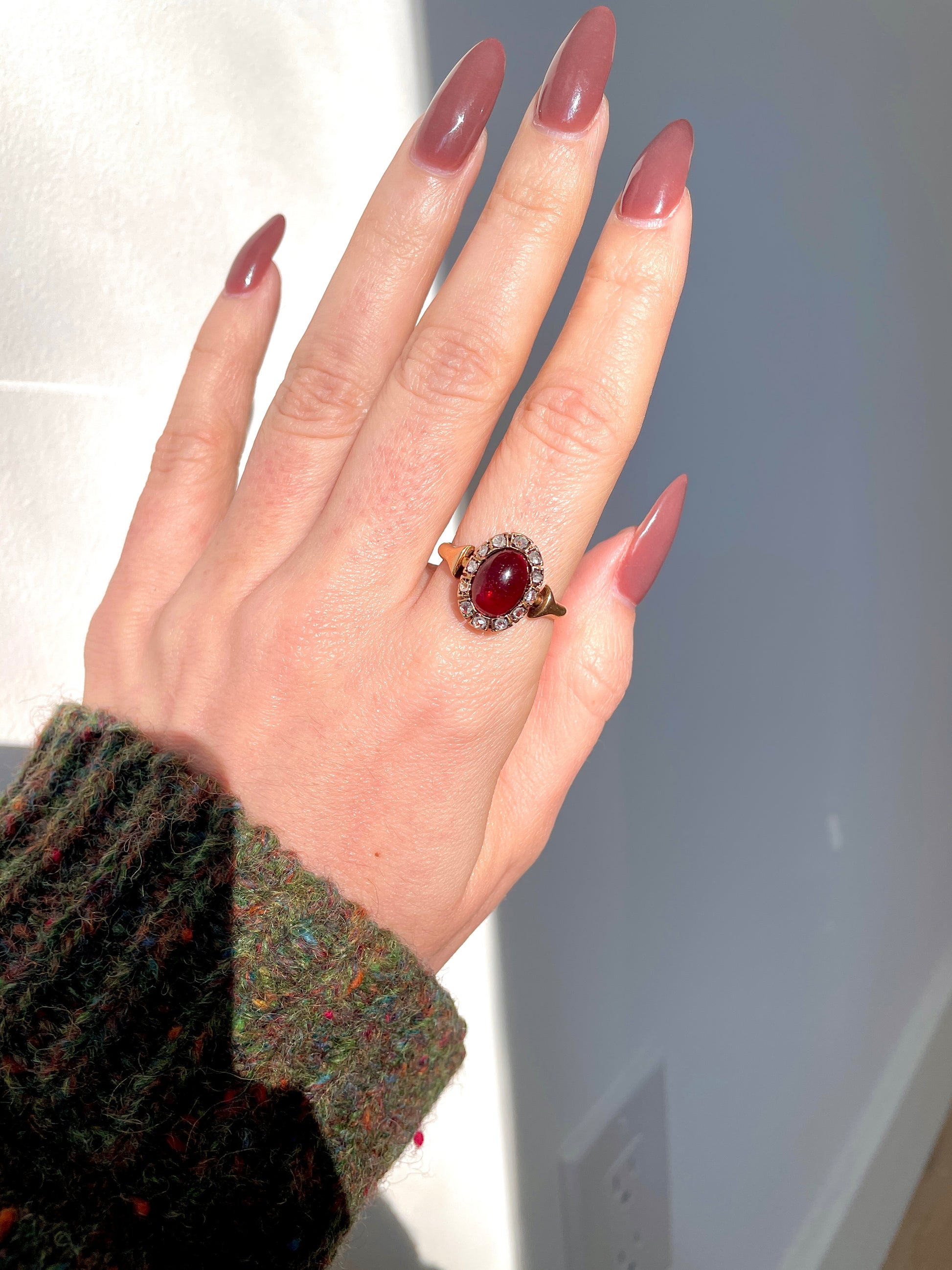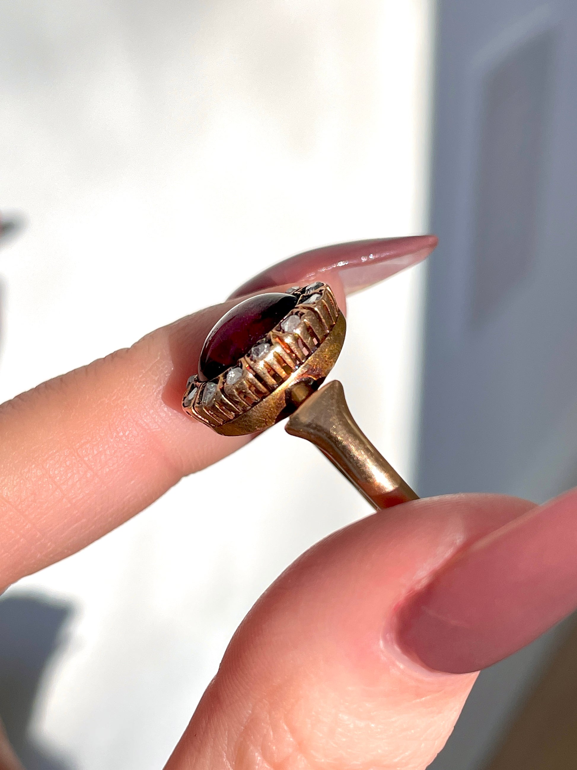 A beautiful Antique rosy yellow 18K gold approx 3.9 ctw tourmaline cabochon and .22 ctw rose cut diamond ring, size 9.5. Sizable. Measures 14.9 mm wide. Weighs 5.2 grams. Garnet is clear and translucent with some pretty internal inclusions. Rose cut diamonds all set in rosy yellow 18K gold. Super pretty on. Evidence of former sizing. In very good preowned condition.
