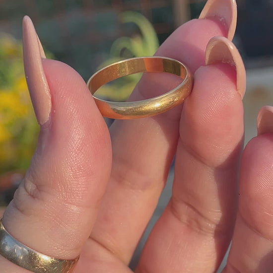 Rich yellow Antique 18K round band, size 11. Sizable. Totally solid. Measures 3.9 mm wide. Weighs 4.8 grams. Hallmarked 750 for 18K gold and other hallmarks. Very good preowned condition. Beautiful patina.
