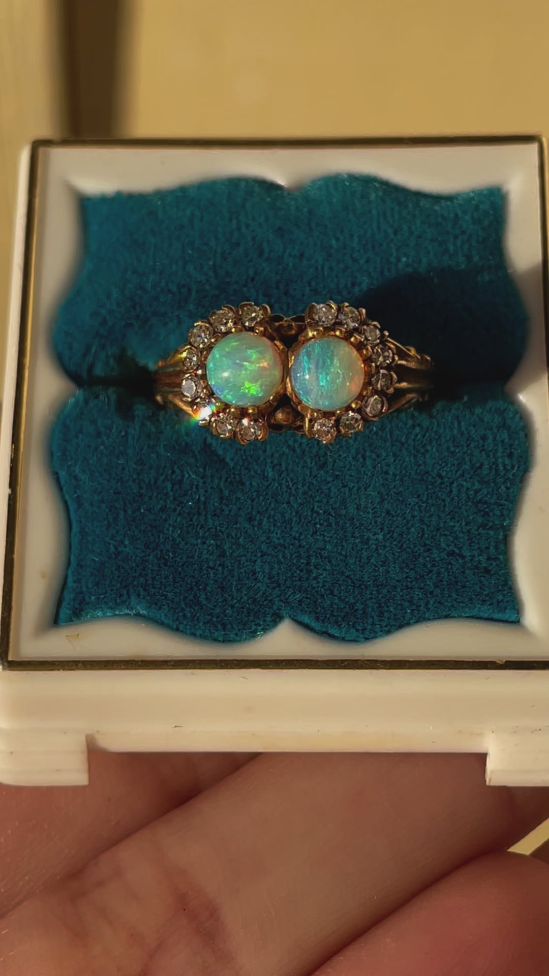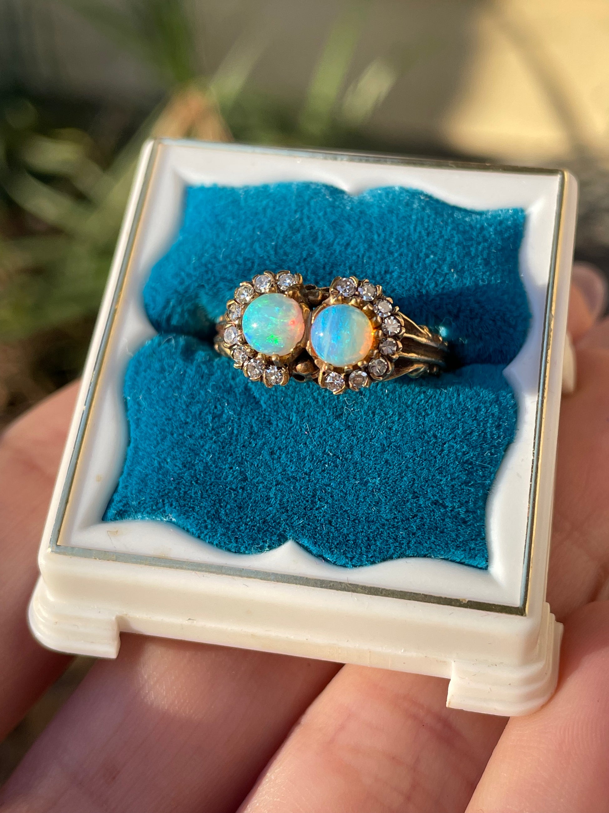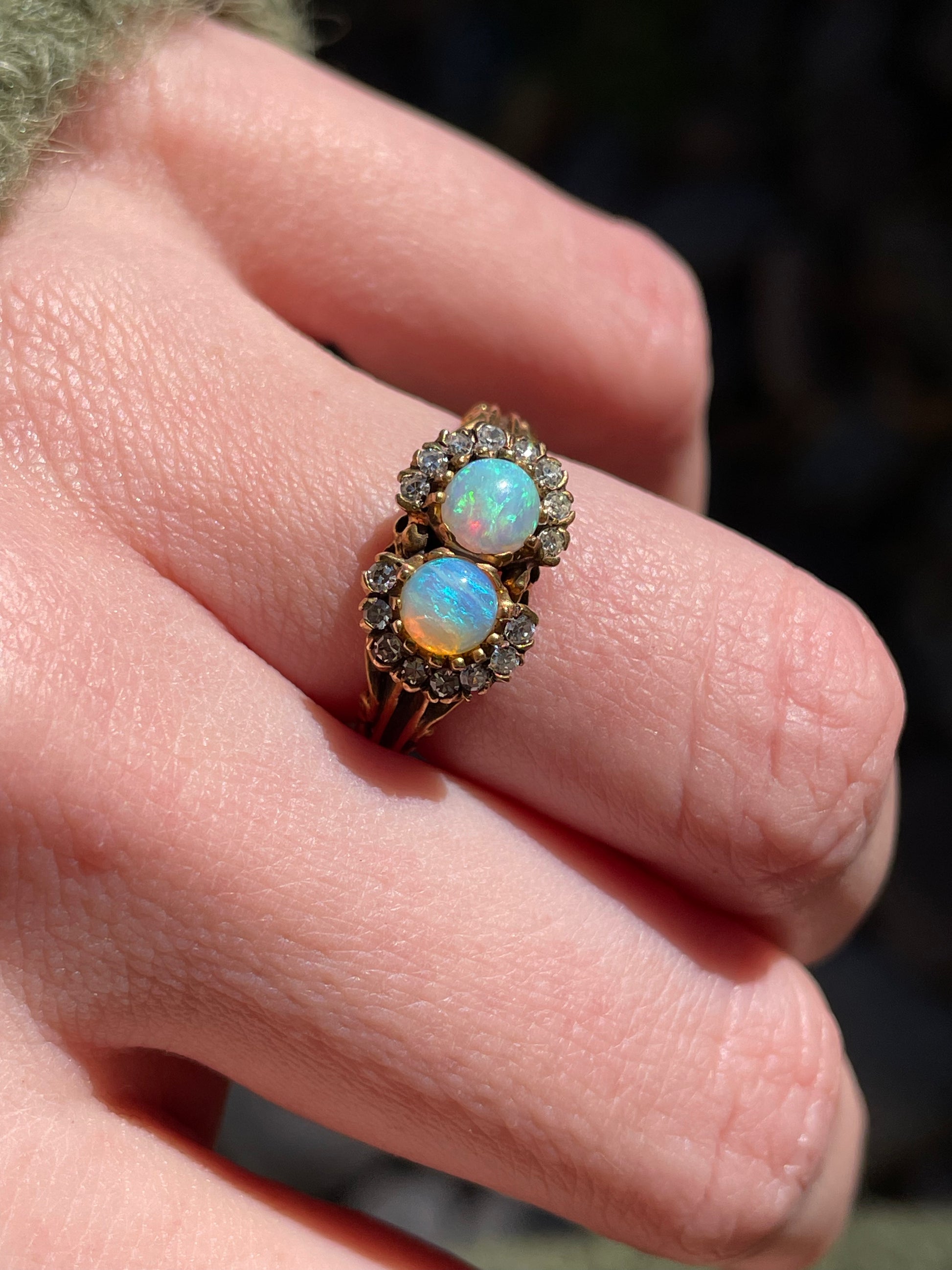 14K antique art nouveau dual opal cabochon ring with .16 ctw diamond partial halos. Size 5.25, 8.6 mm widest. $995