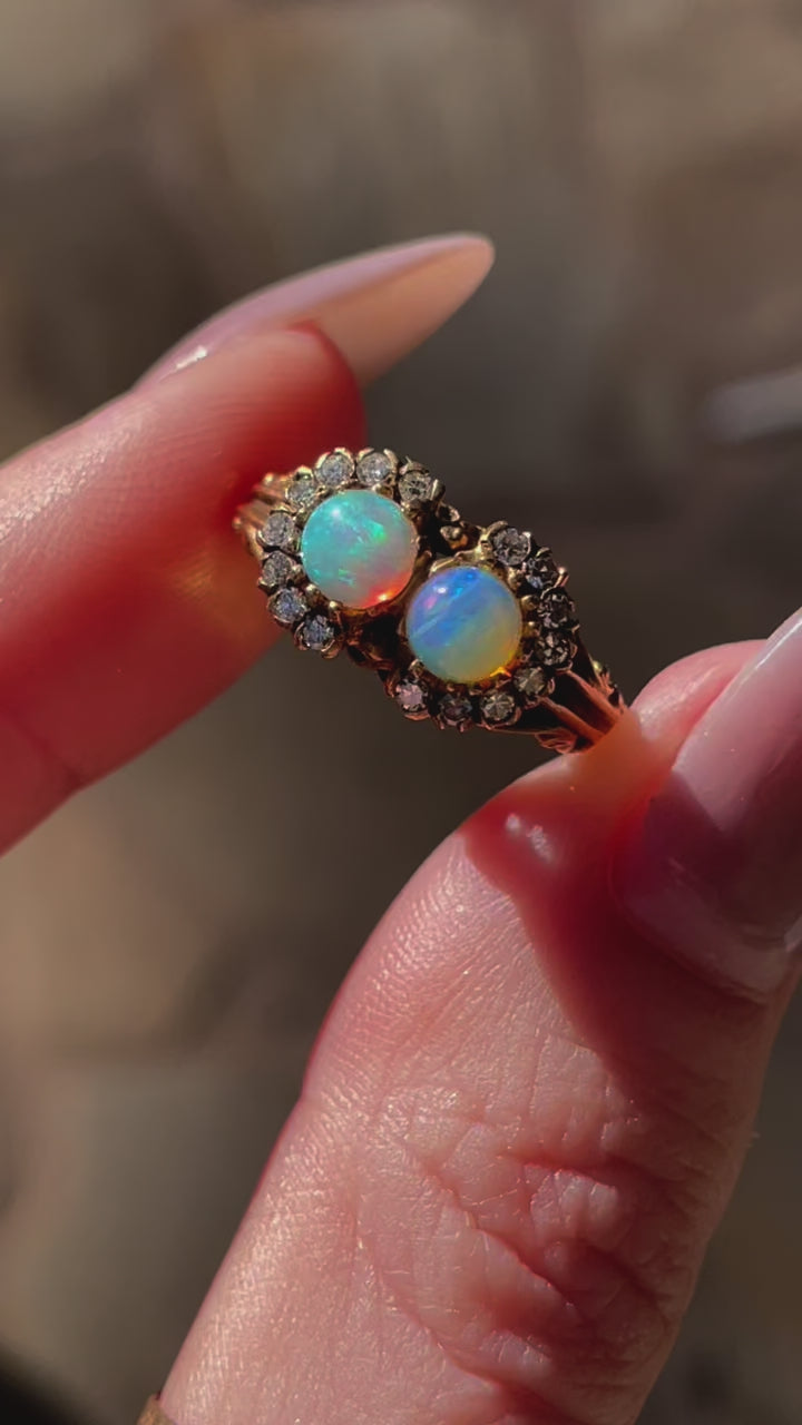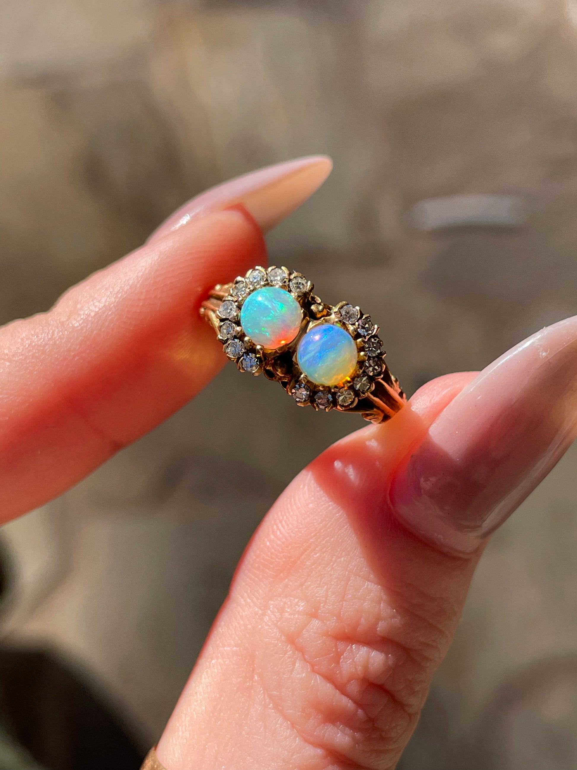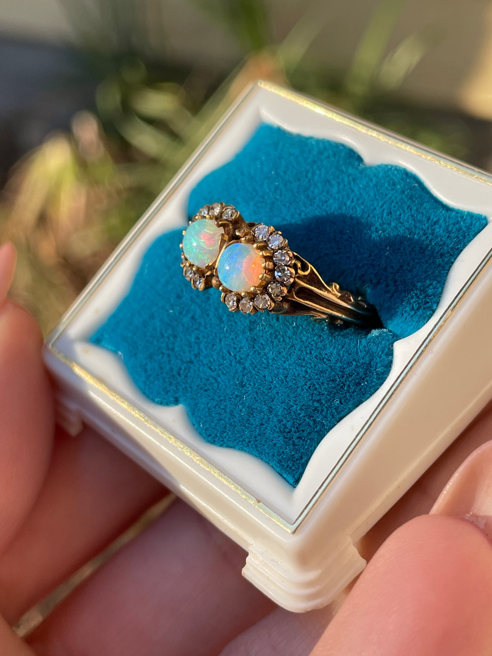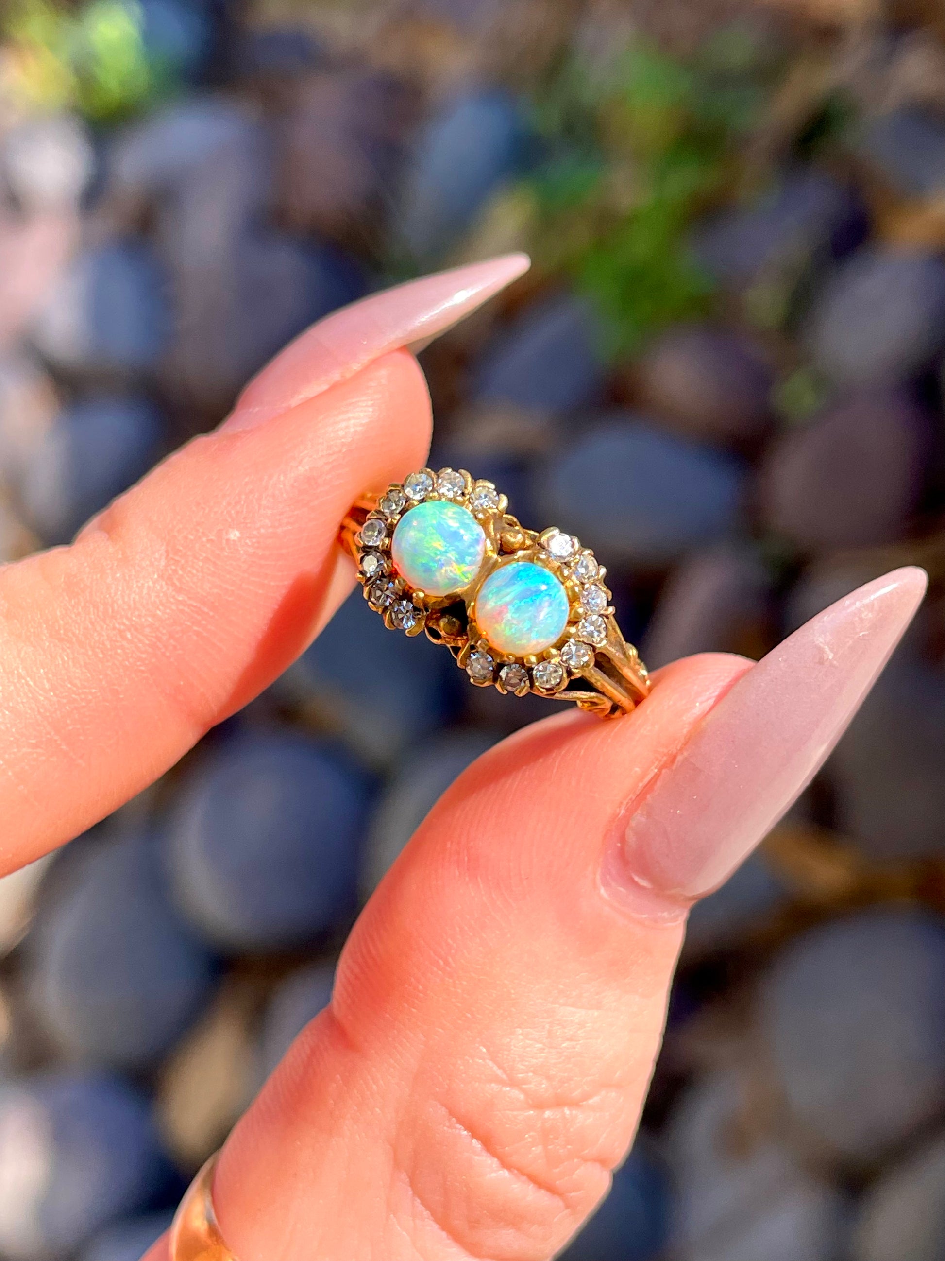 14K antique art nouveau dual opal cabochon ring with .16 ctw diamond partial halos. Size 5.25, 8.6 mm widest. $995