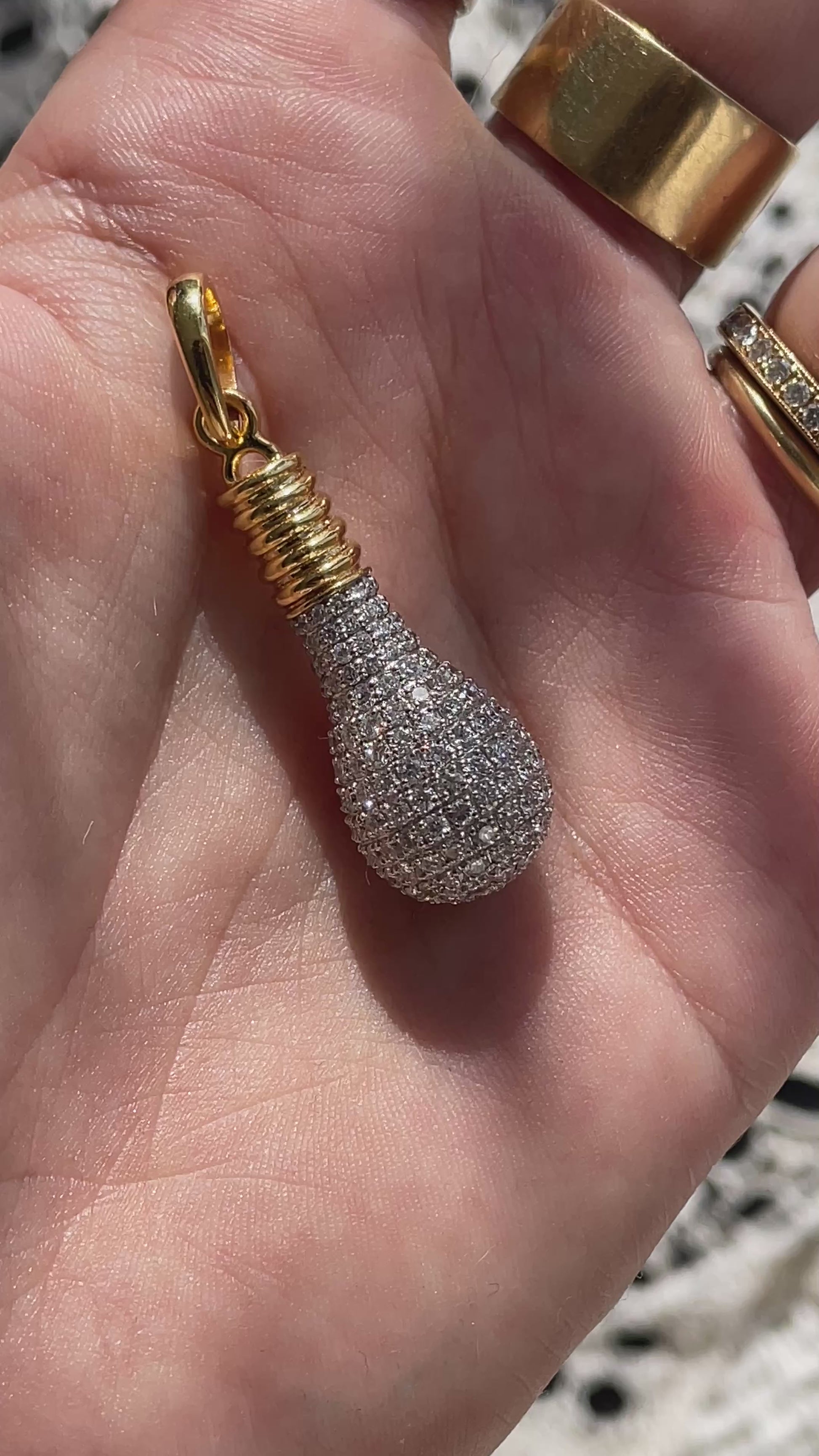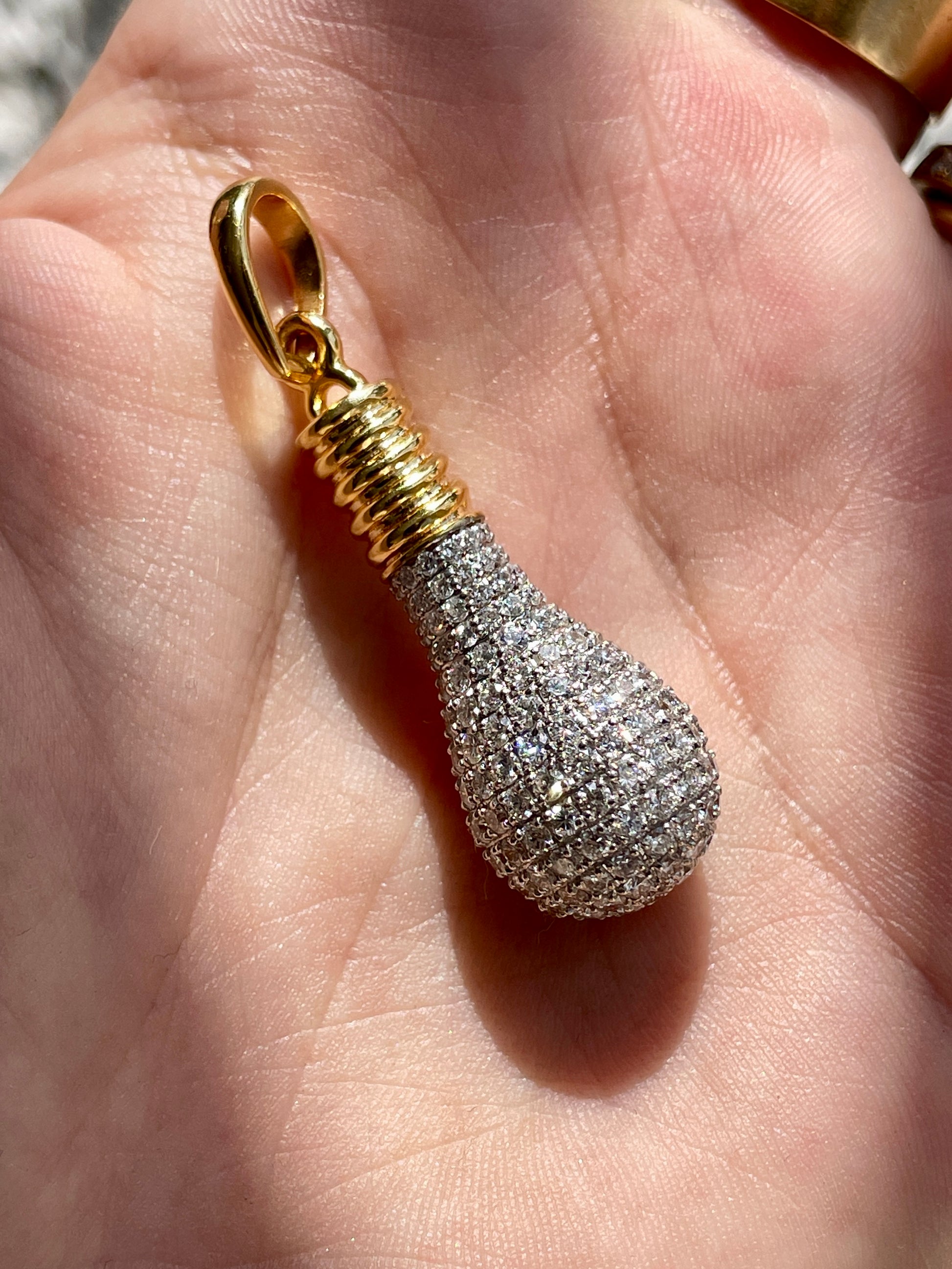 This is a conversation starter! A yellow 14K mega watt sparkle approx 3 ctw diamond lightbulb pendant. Diamonds are very bright estimated G color, VS clarity, set in white 14K gold. Yellow gold is very buttery in color. Measures 1.8 inch long with bale x .5 inch wide. Weighs 6.2 grams. Very good preowned condition.