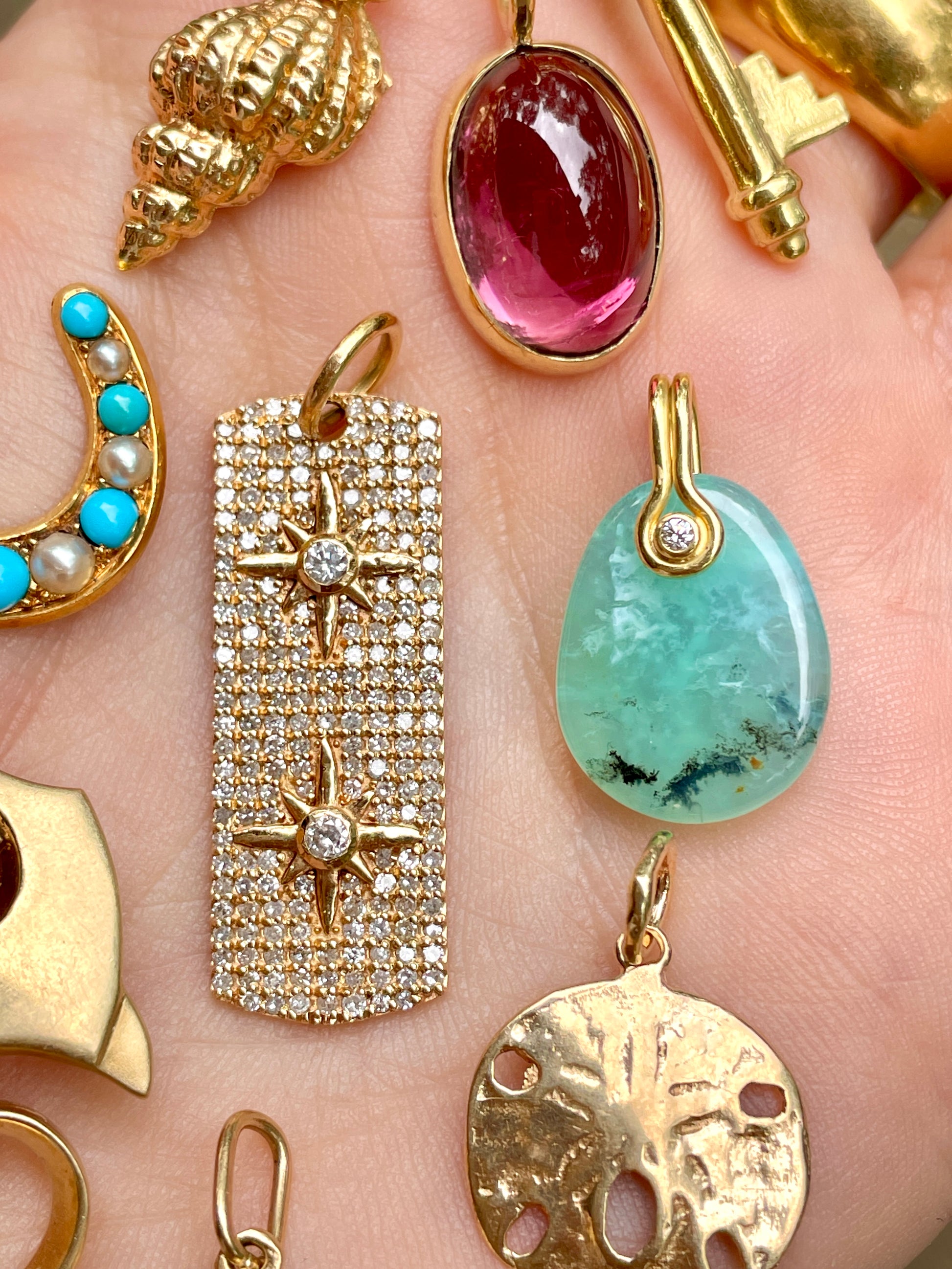 Great sparkle with this Estate yellow 14K celestial diamond tag pendant with approx .5 ctw of diamonds. A great size, measures 1.5 inch long with bale by .5 inch wide. Bezel set diamonds inside star details. Diamonds are bright and included but very sparkly. Hallmarked on the back. Weighs 3.8 grams. In very good preowned condition.