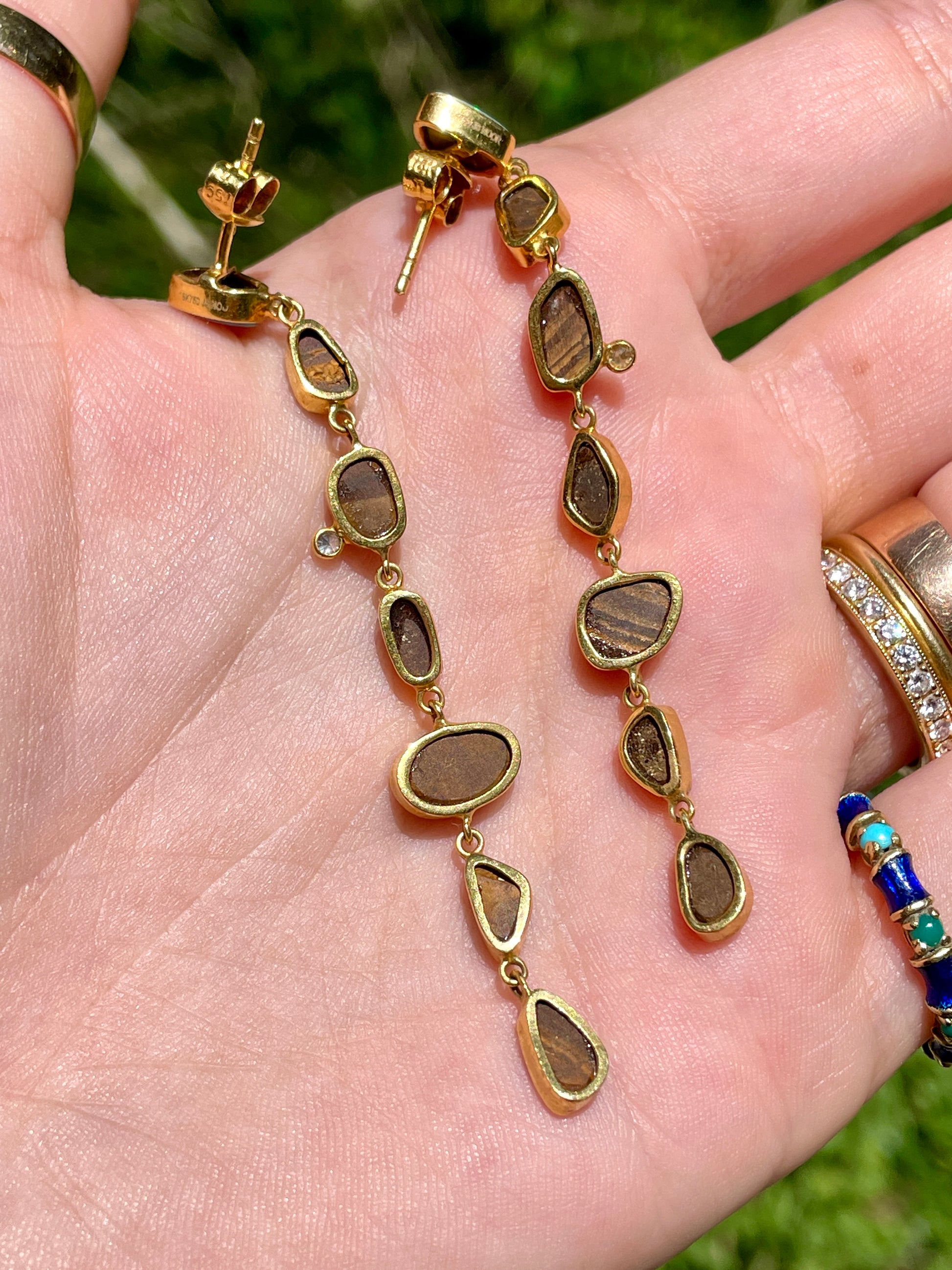A super chic pair of Australian opal yellow 18K bezel set long opal drop post earrings with approx .1 ctw diamonds. Diamonds are GH, VS/SI. Inventive design where they climb the lobe. Measures 16.2 mm long. Weighs 6.6 grams. Hallmarked 18K and 750. Super comfortable on and gorgeous movement. Very good preowned condition.
