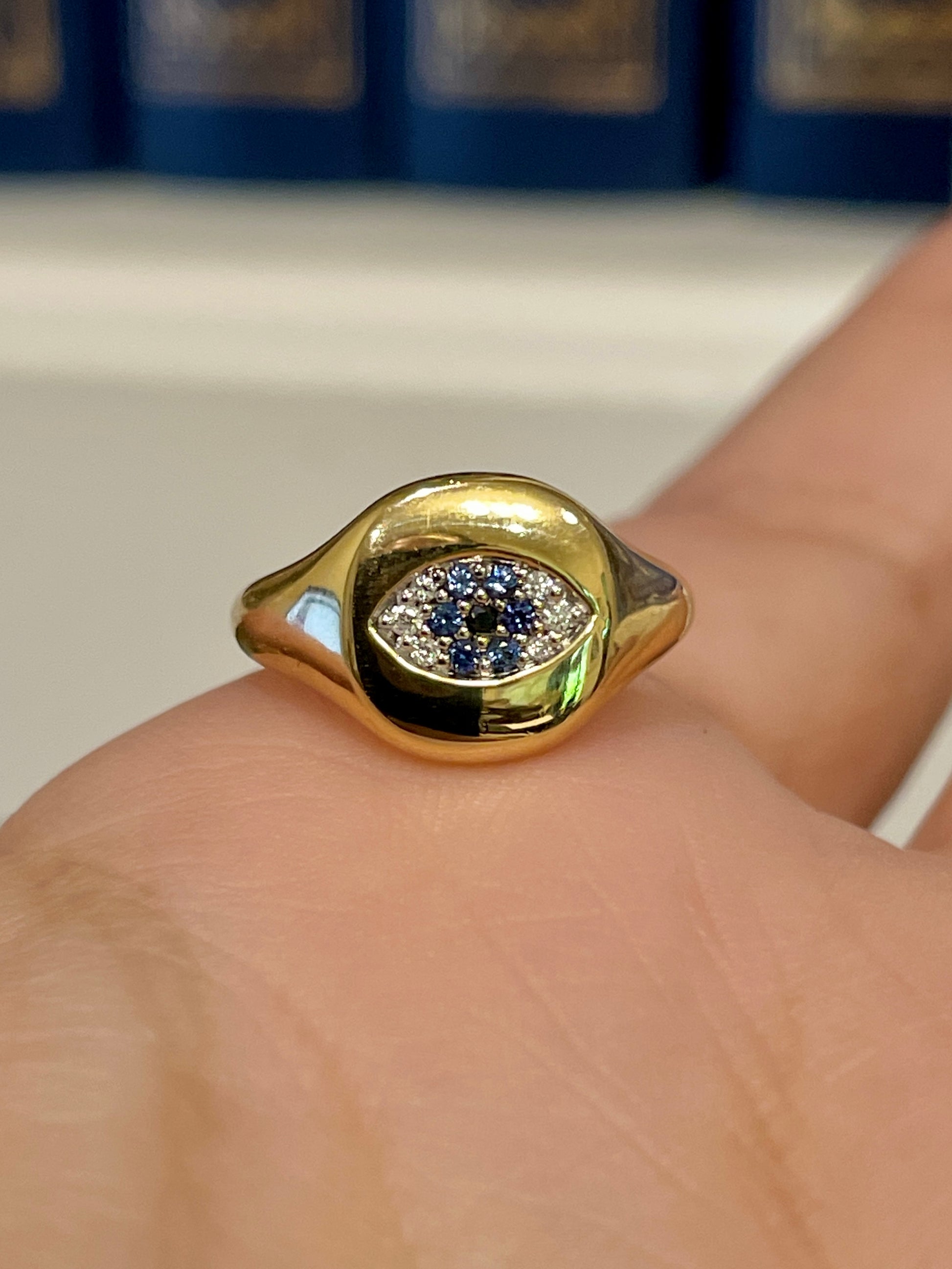 Well made Estate yellow 18K David Yurman sapphire and diamond evil eye signet, size 1.5. Sizable. Listed on DY site for $2150 currently. 9.8 mm widest, weighing 5.3 grams. Very good preowned condition.
