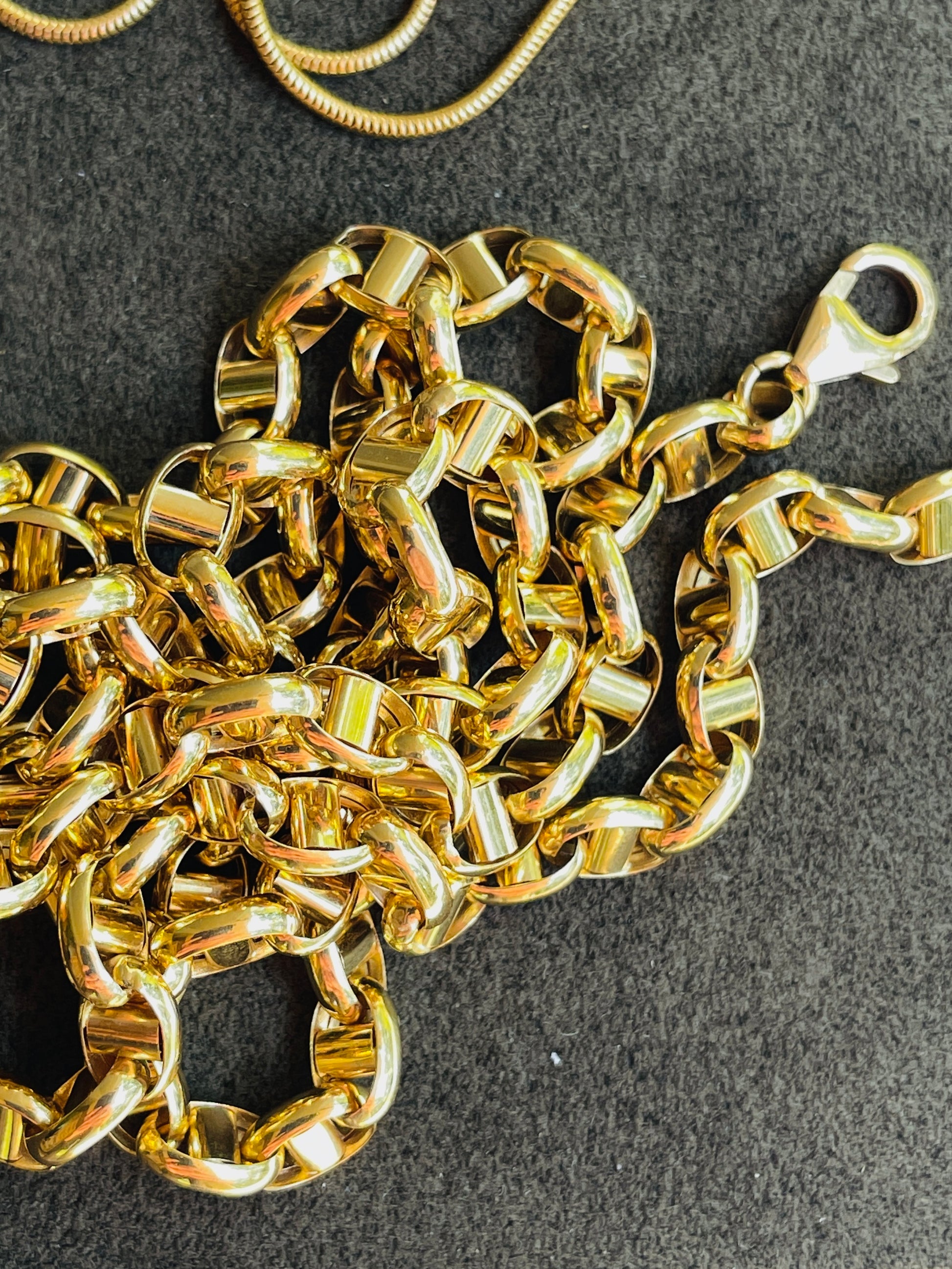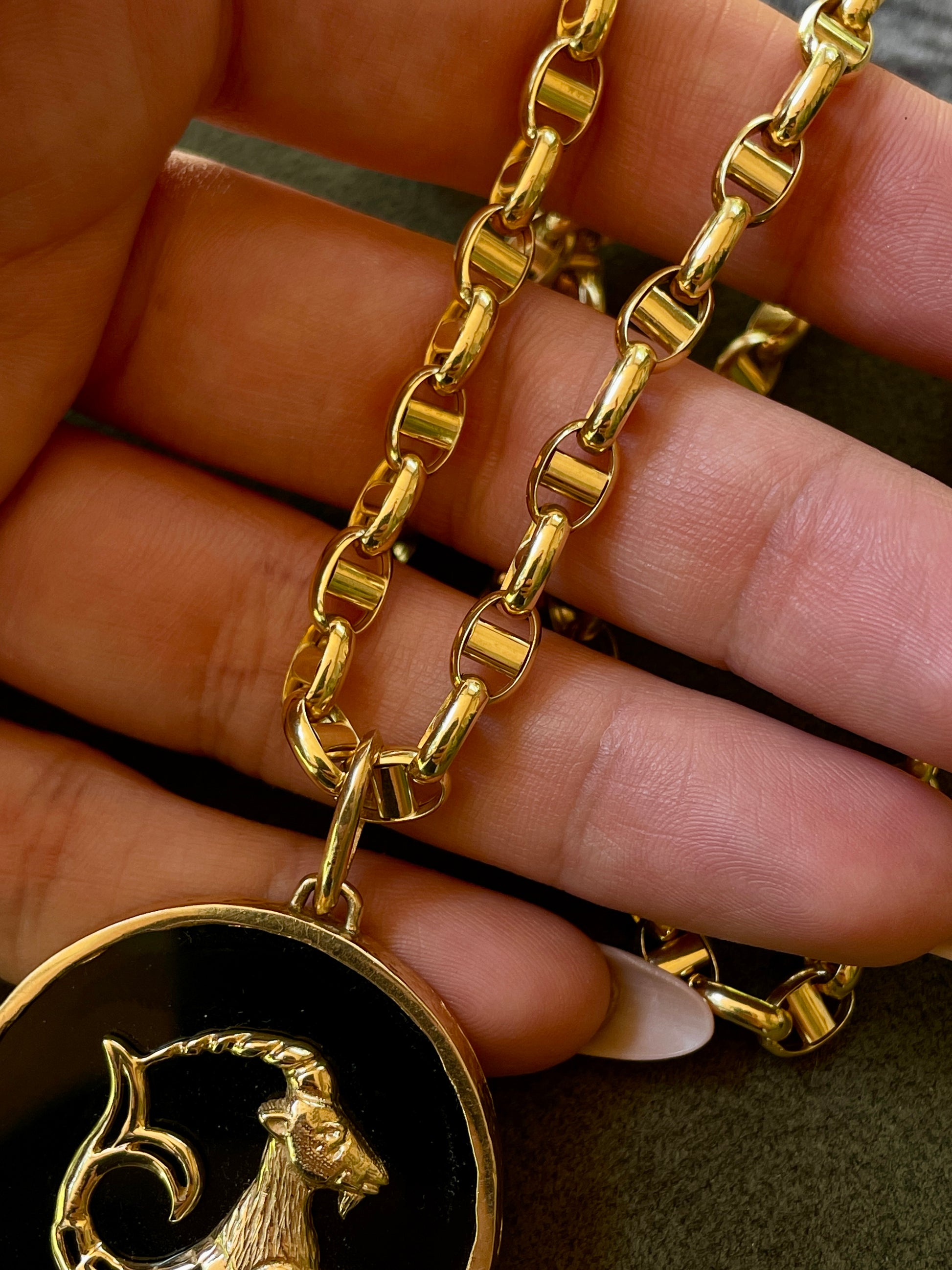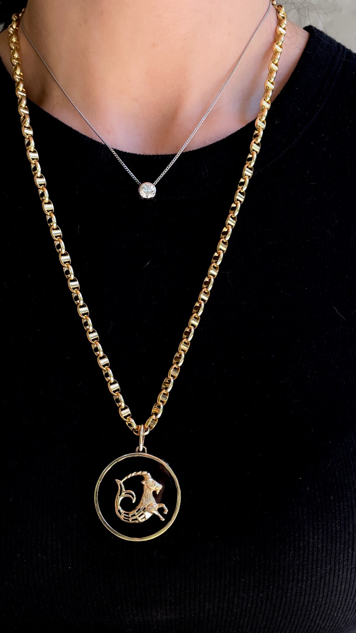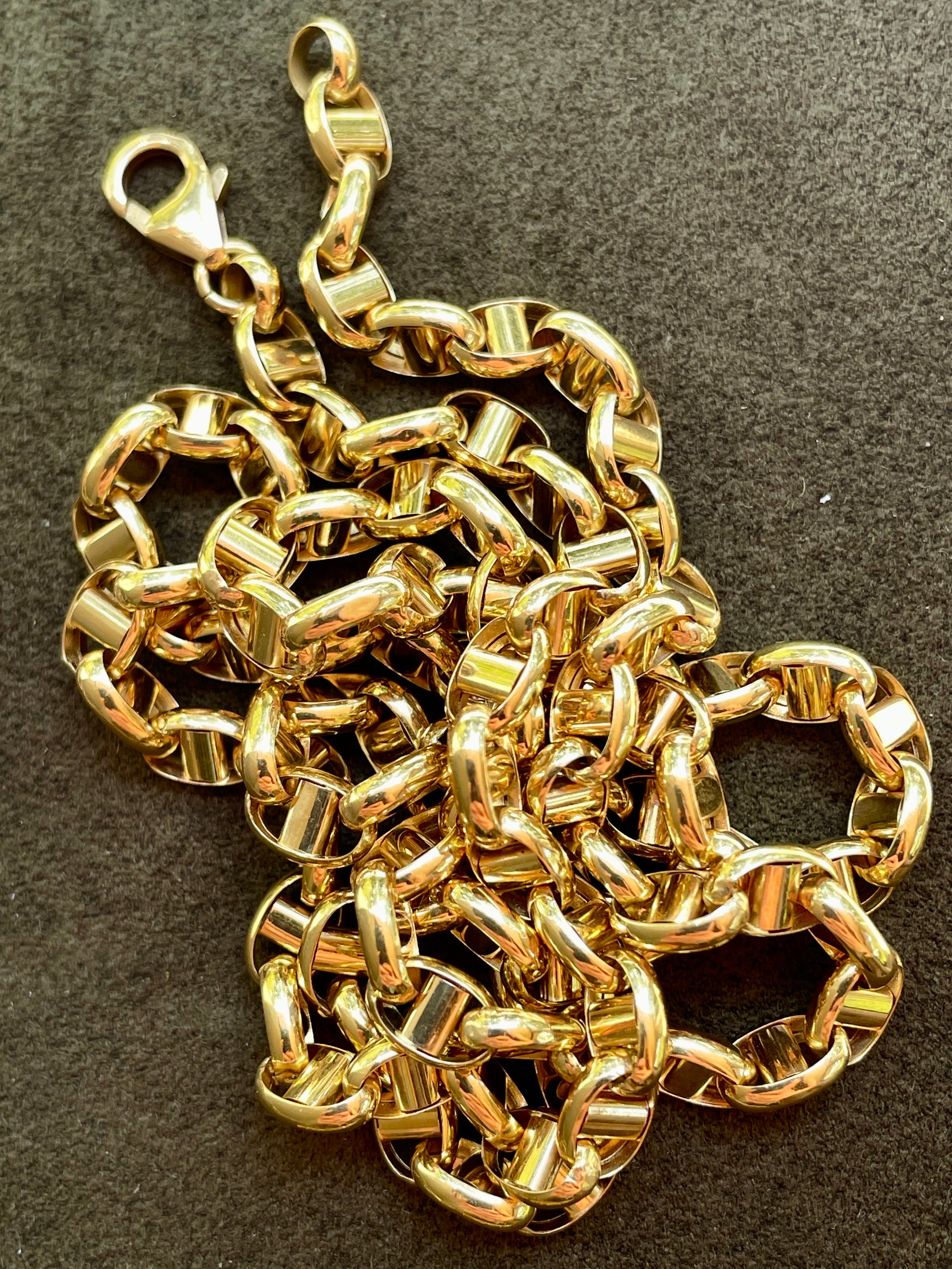 This is a really great larger look Estate yellow 18K round mariner chain, 24 inch long with lobster clasp. A link that has a great scale and still enough weight in the construction to hang well solo or with charms and be more durable without paying $000s more. Measures 5.1 mm wide. Links are open seamed on the inside as part of the hollow construction. Weighs 18.8 grams. In very good preowned condition.