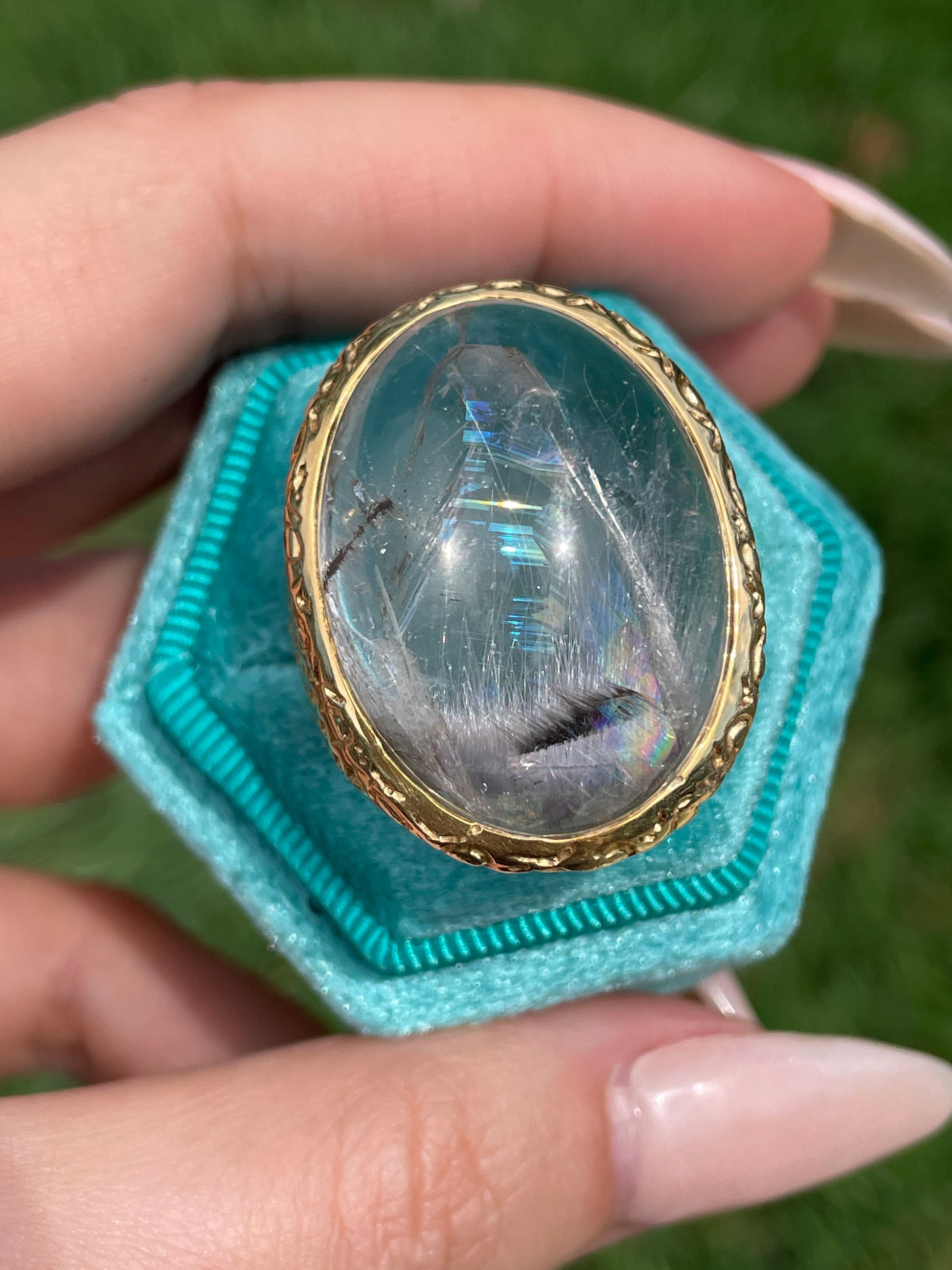 Rainbow quartz is known as a manifestation stone. The term sagenitic refers to the small rutile crystals, aka “needles” inside the stone, which are a mix of whites and light to darker greys in color. Ring weighs 23.4 g. It is in excellent preowned condition.