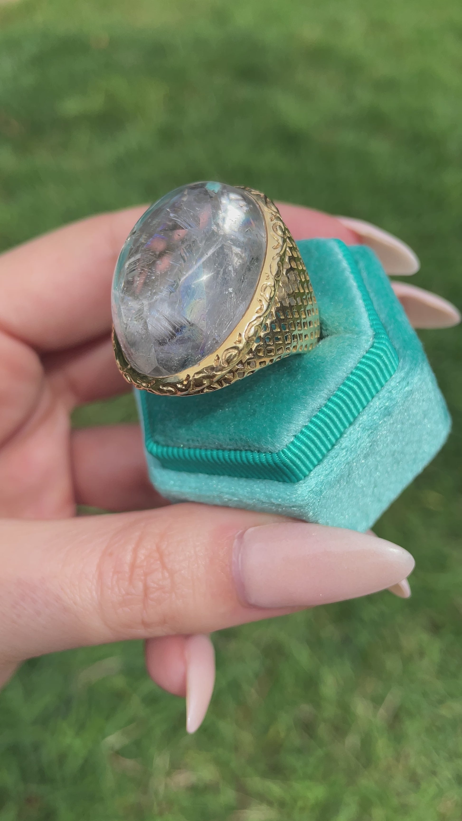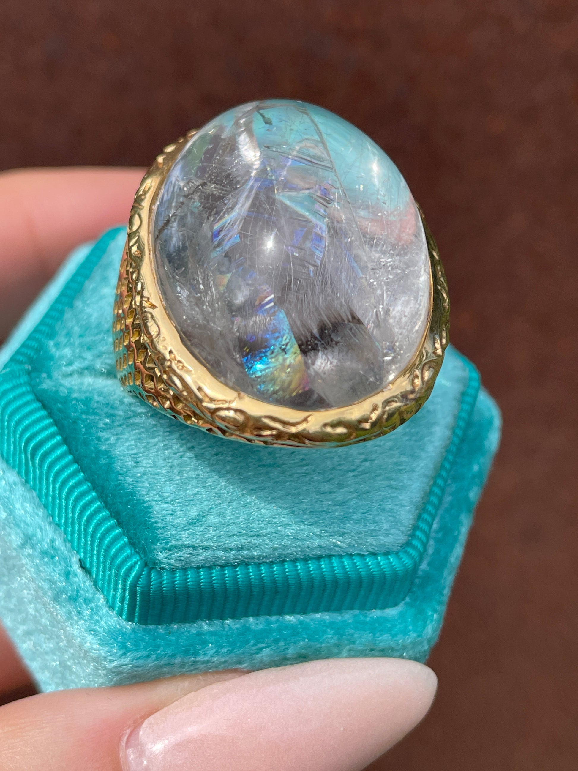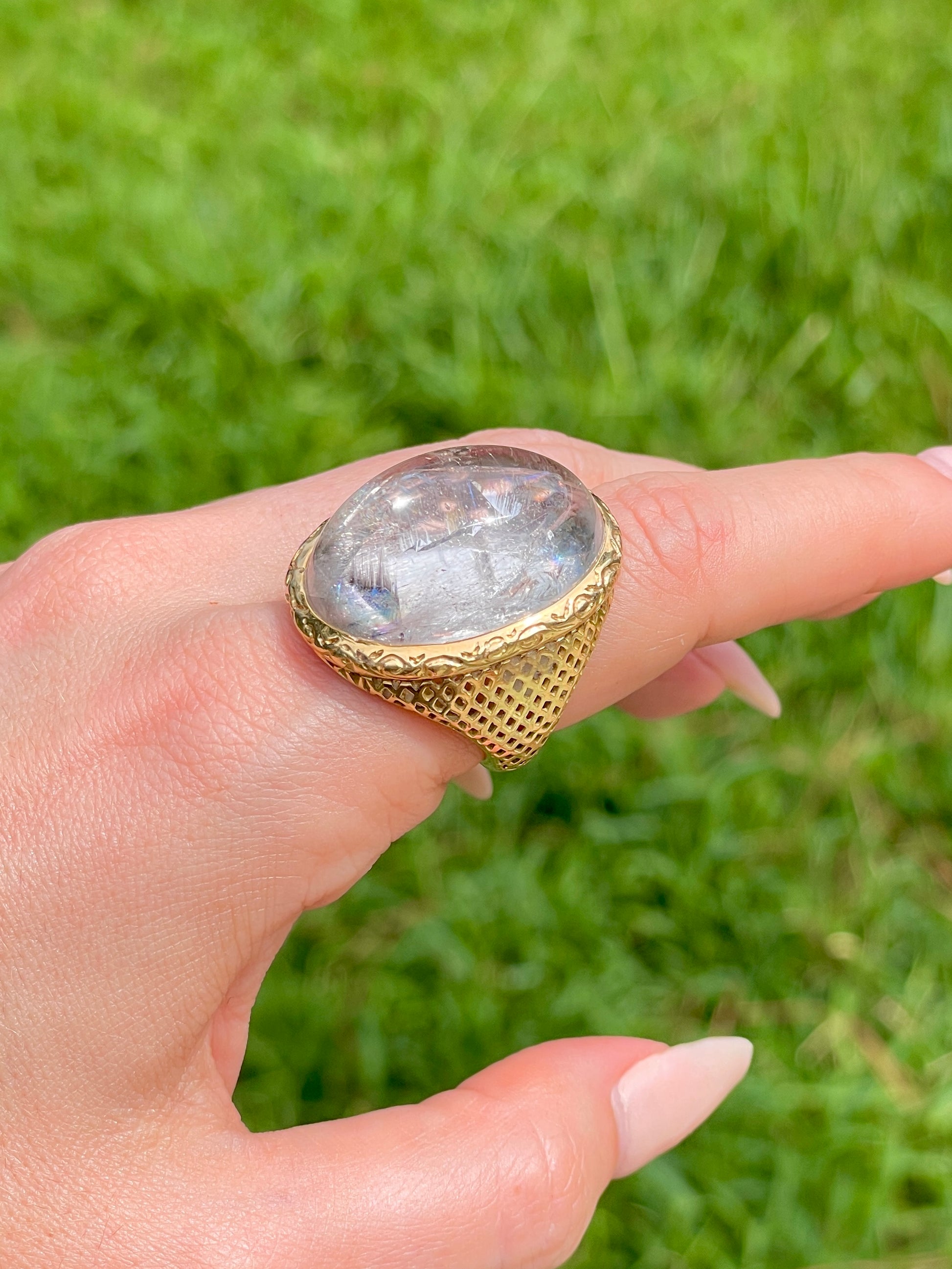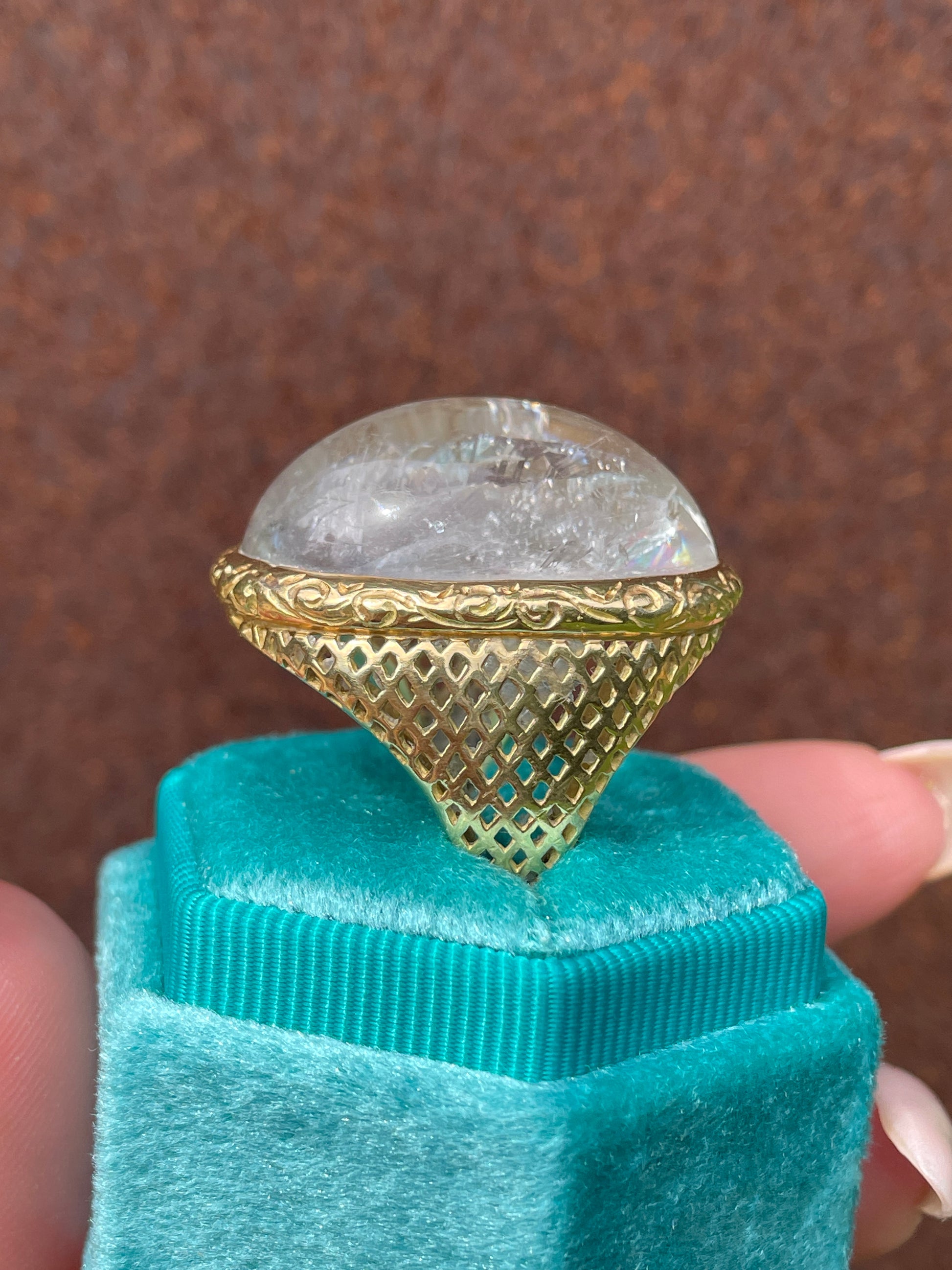 A striking Estate yellow 18K Sagenite rutile rainbow quartz statement ring, size 8.5 (not sizable). A true statement piece, measuring 31.5 mm wide. The rainbow quartz is beautiful condition, with no wear or cracks. So much character inside the stone, and it is so enchanting! The scrollwork of the 18K bezel and pierced detail on the ring's shoulders complement this whimsical stone so nicely.
