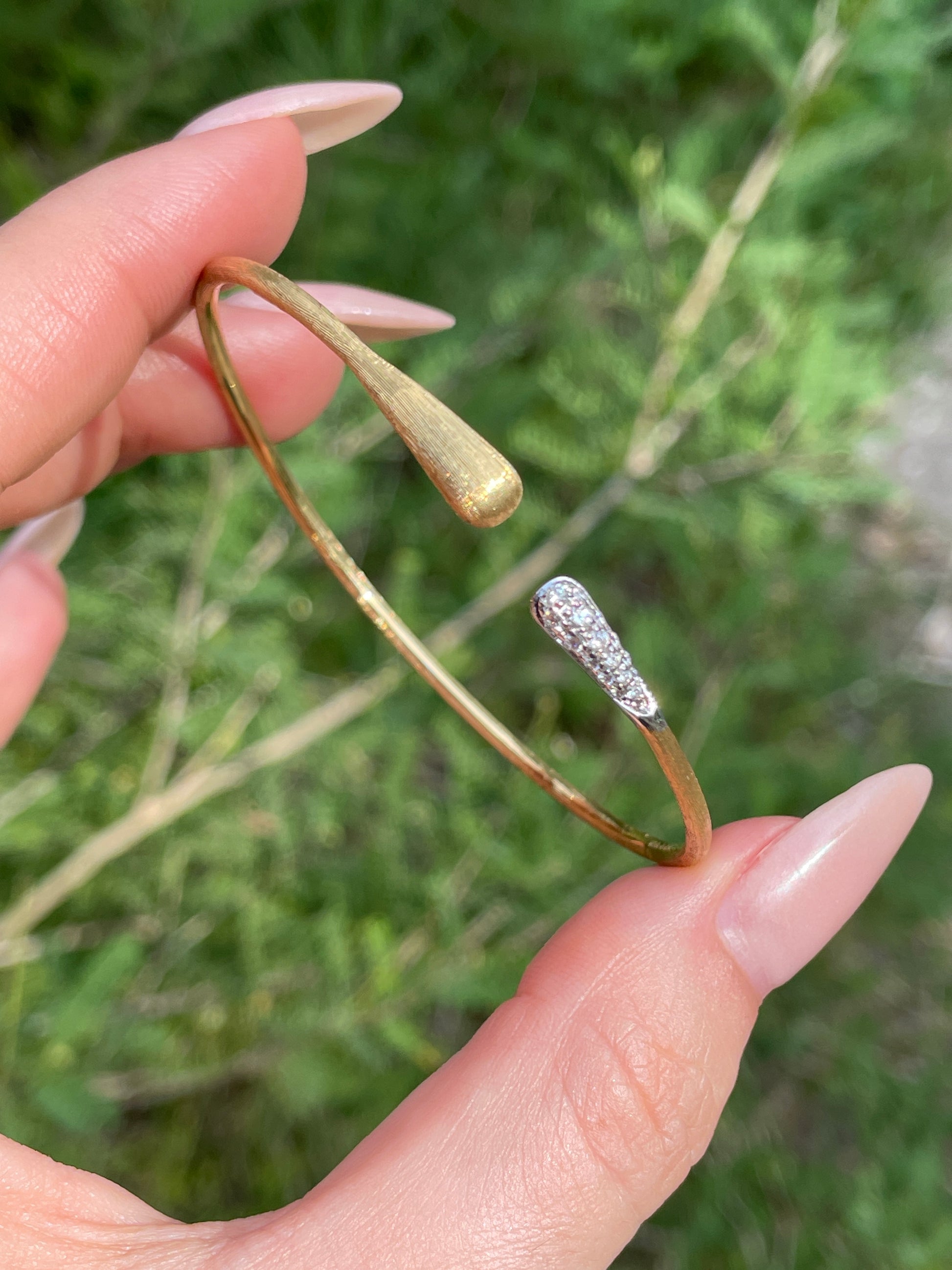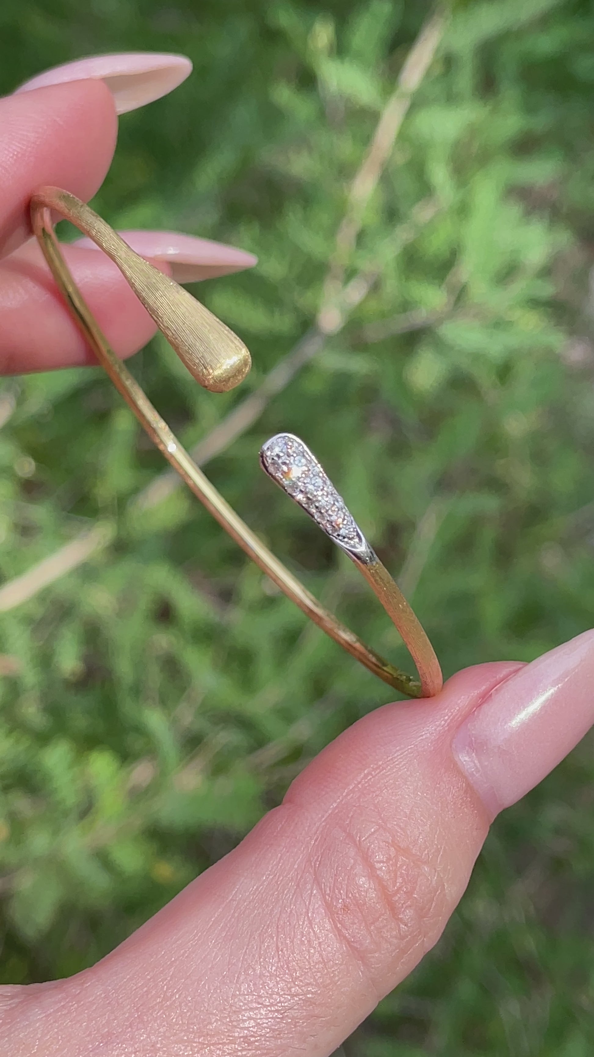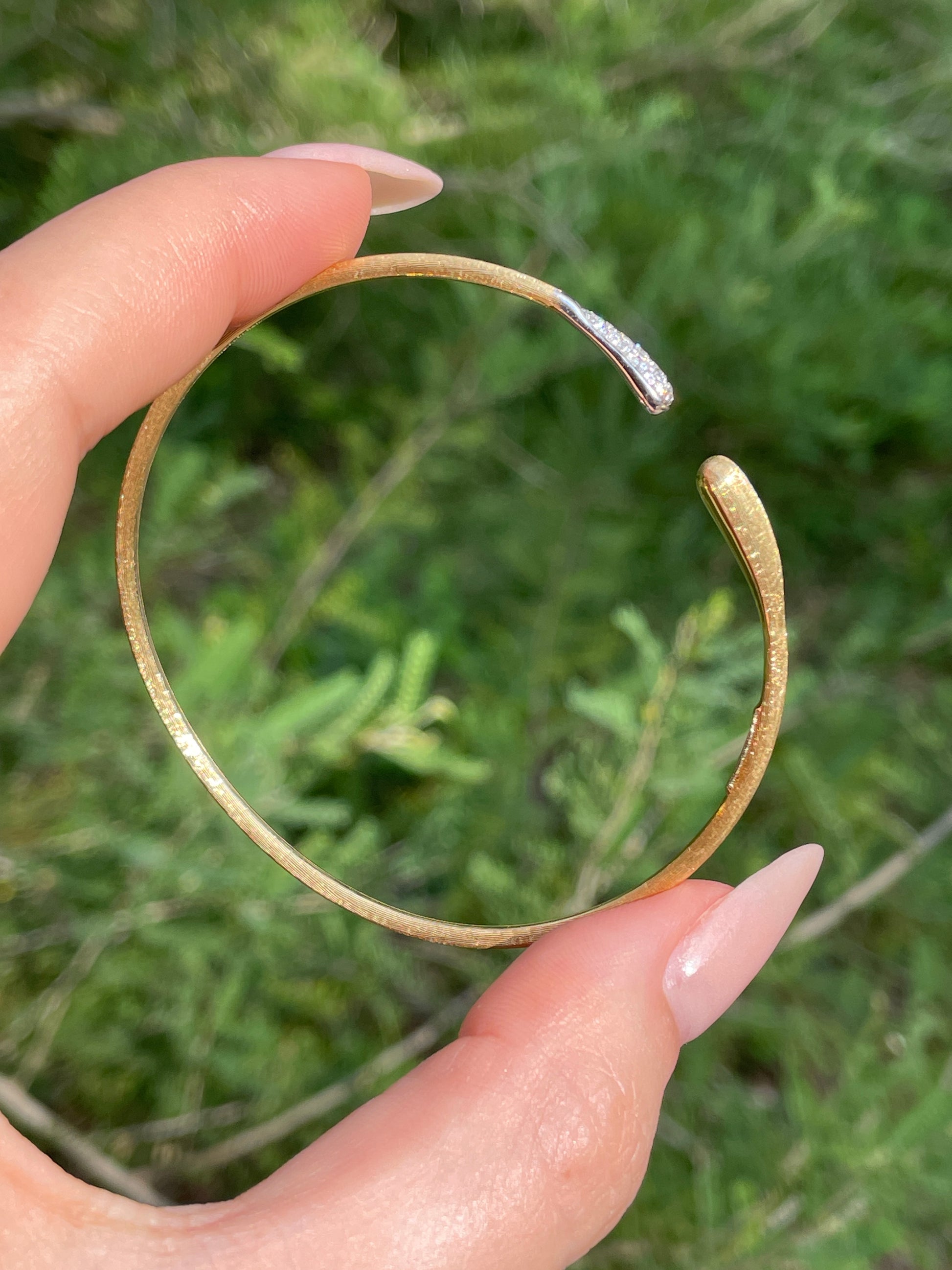 A pretty Estate yellow and white 18K and .1 ctw diamond textured cuff bracelet. Interior measures 2.3 x 1.9 inch, which is just over a 6.6 inch circumference, so fits a wrist 6.25 inch and smaller. Flexes to accommodate putting it on the wrist. Measures 2 mm wide. Hallmarked with Italian makers marks and 750 for 18K gold. Weighs 4 grams. In excellent preowned condition.
