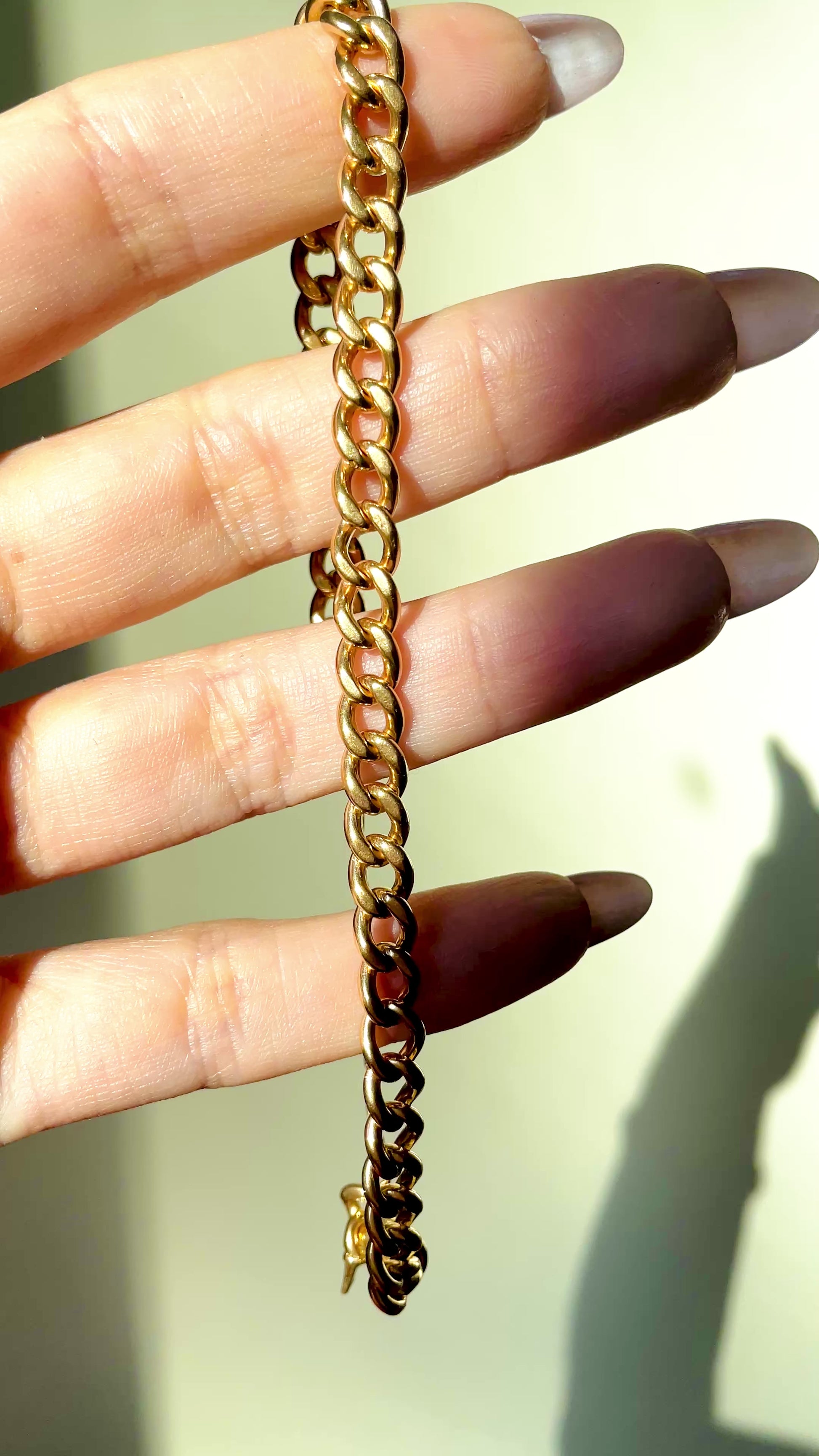 Vintage solid rosy yellow 18K gold curb bracelet with safety chain, 8 and 3/8 inch