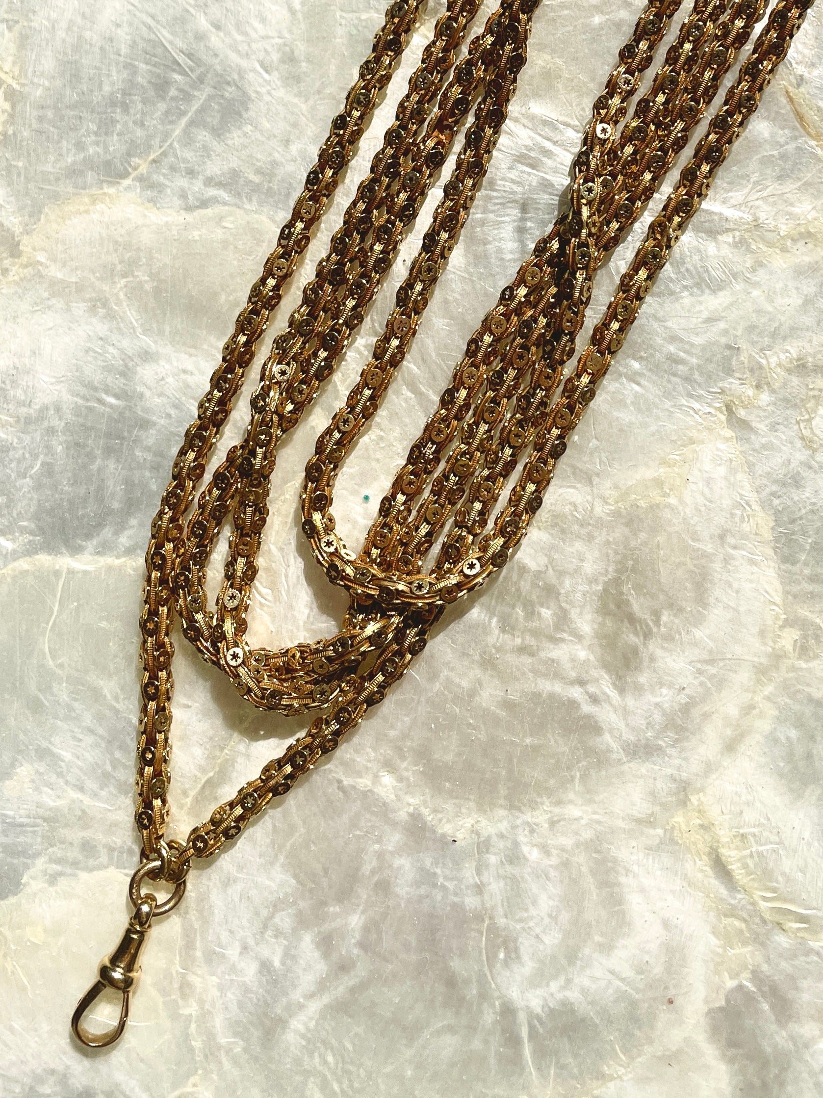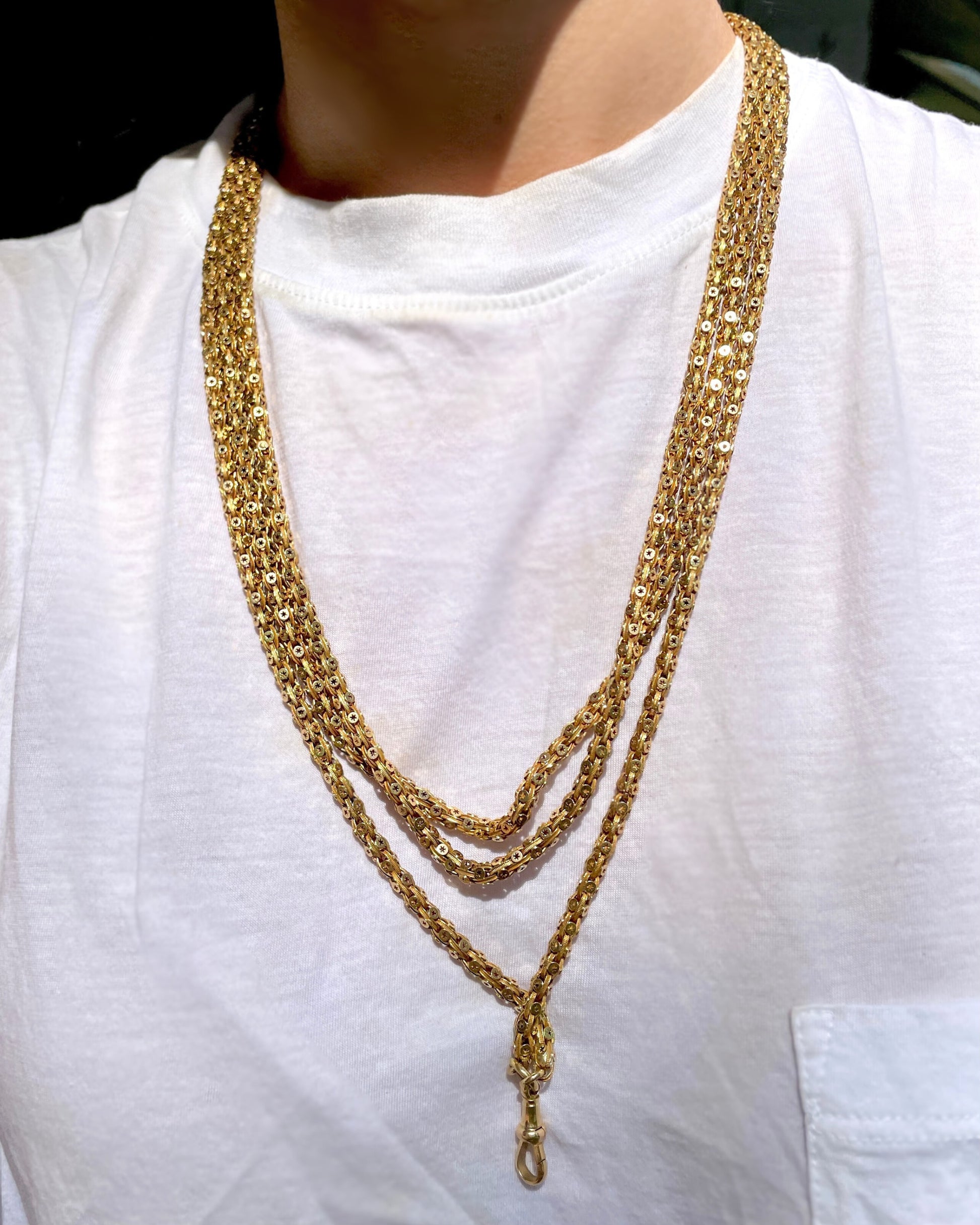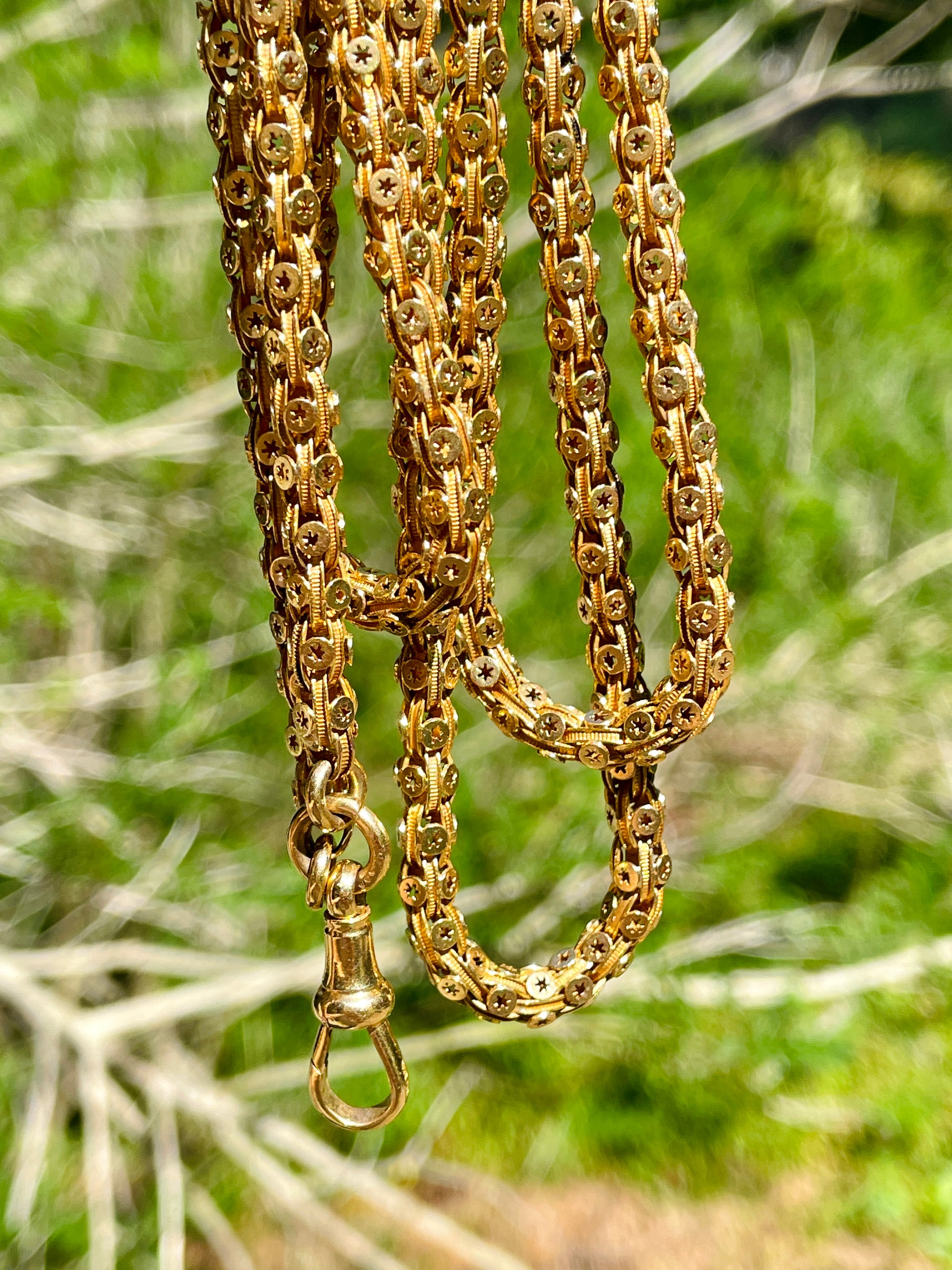 A truly exceptional Rare Antique yellow 18K gold star cut longguard chain, 74.5 inch long, plus 1 inch long dog clip clasp. An absolutely phenomenal all original handmade circa 1800s chain measuring 4.7 mm widest, and clearly hallmarked '18C' for 18K gold on both the dog clip clasp and end of the star cut chain. UK origin. Weighs 78.9 grams. May be worn many ways. In very good preowned antique condition.