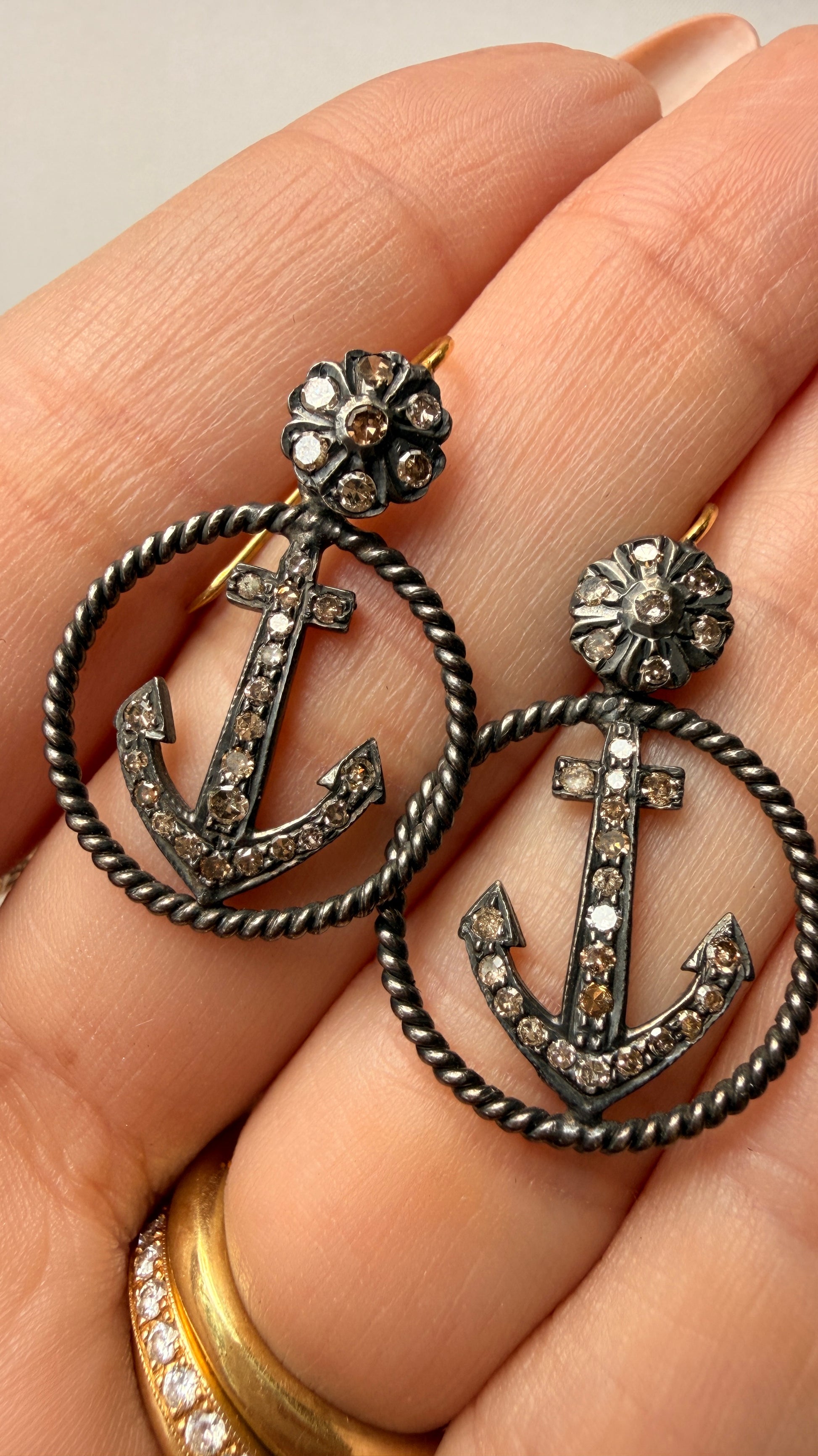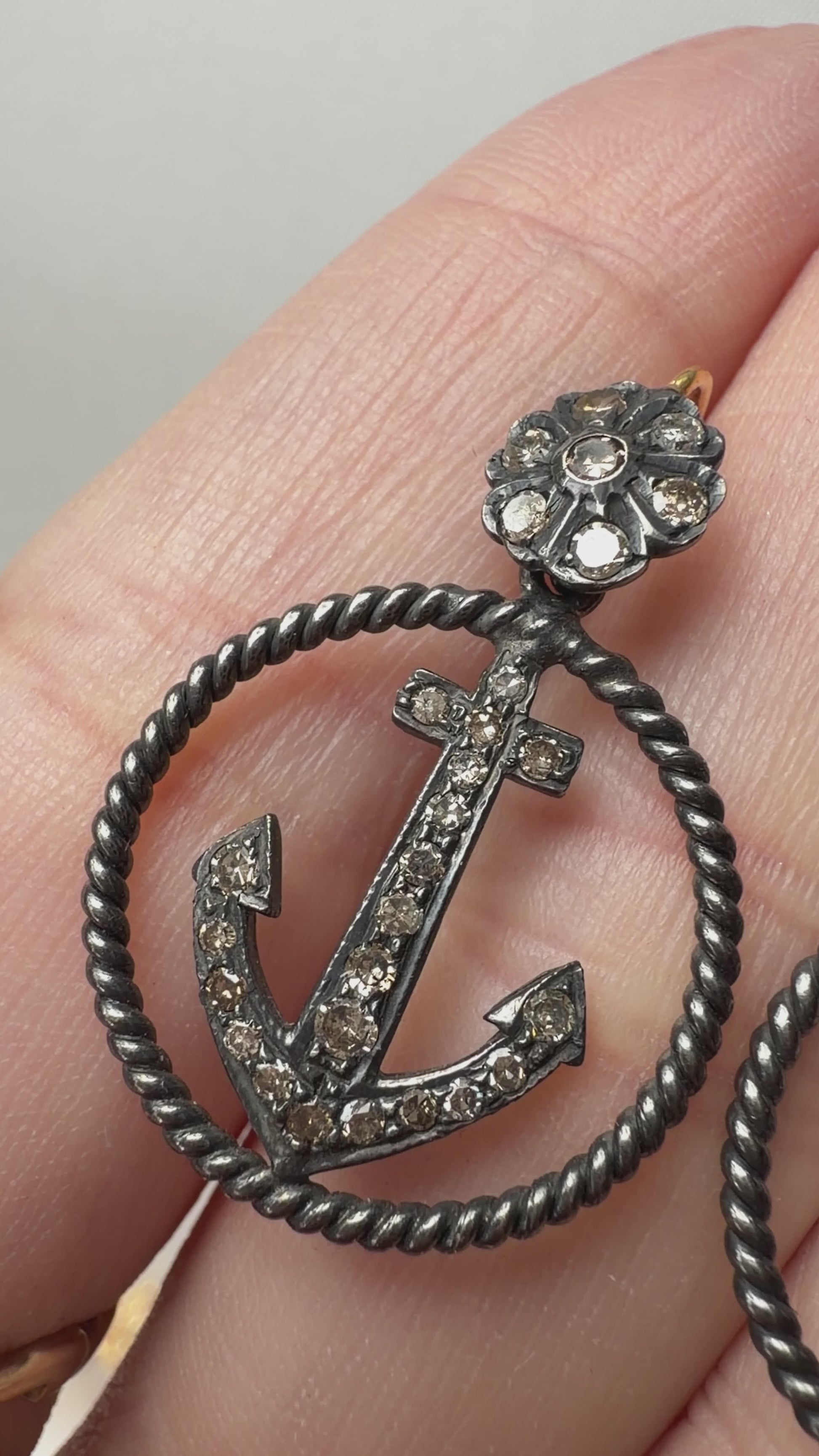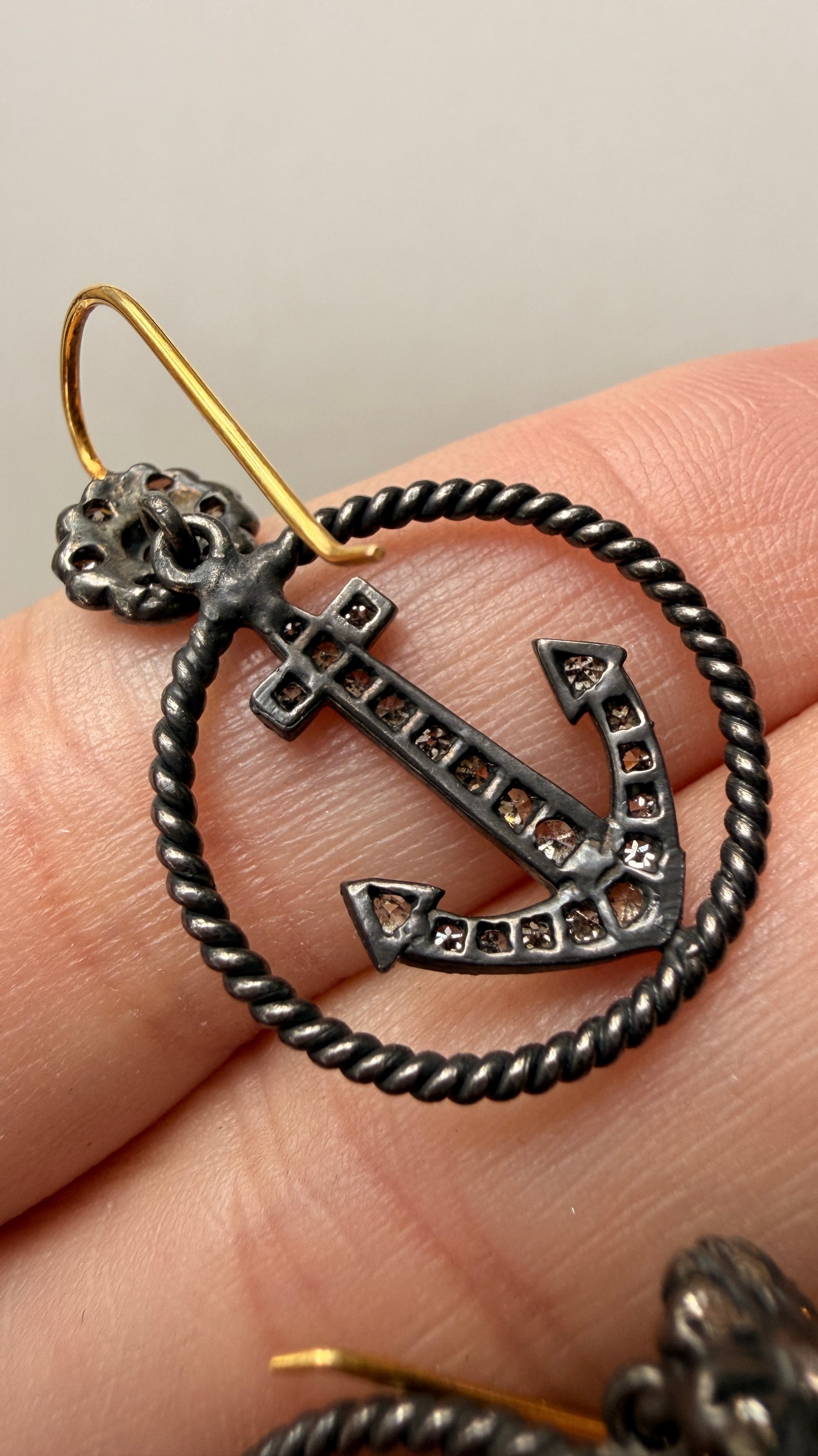 These are so fabulous! It’s difficult to date the anchor and floral clusters of these earrings but we are calling them vintage but they could be antique. The diamonds are included and range from light champagne to a warmer brown which is a nice play with the oxidized metal to add a moody shimmer. Pair weighs 3.9 grams combined. Measure 30mm top to bottom, 19.5mm across. Ear wires test 14K gold, other elements test 10K. Very good preowned condition.