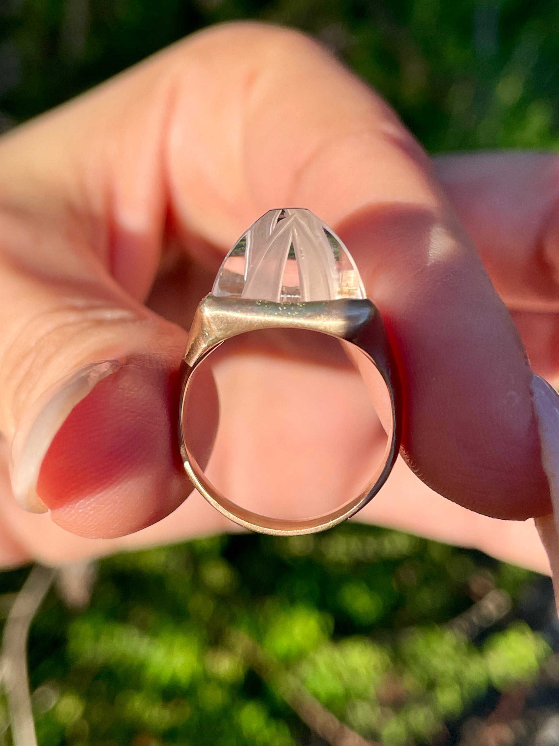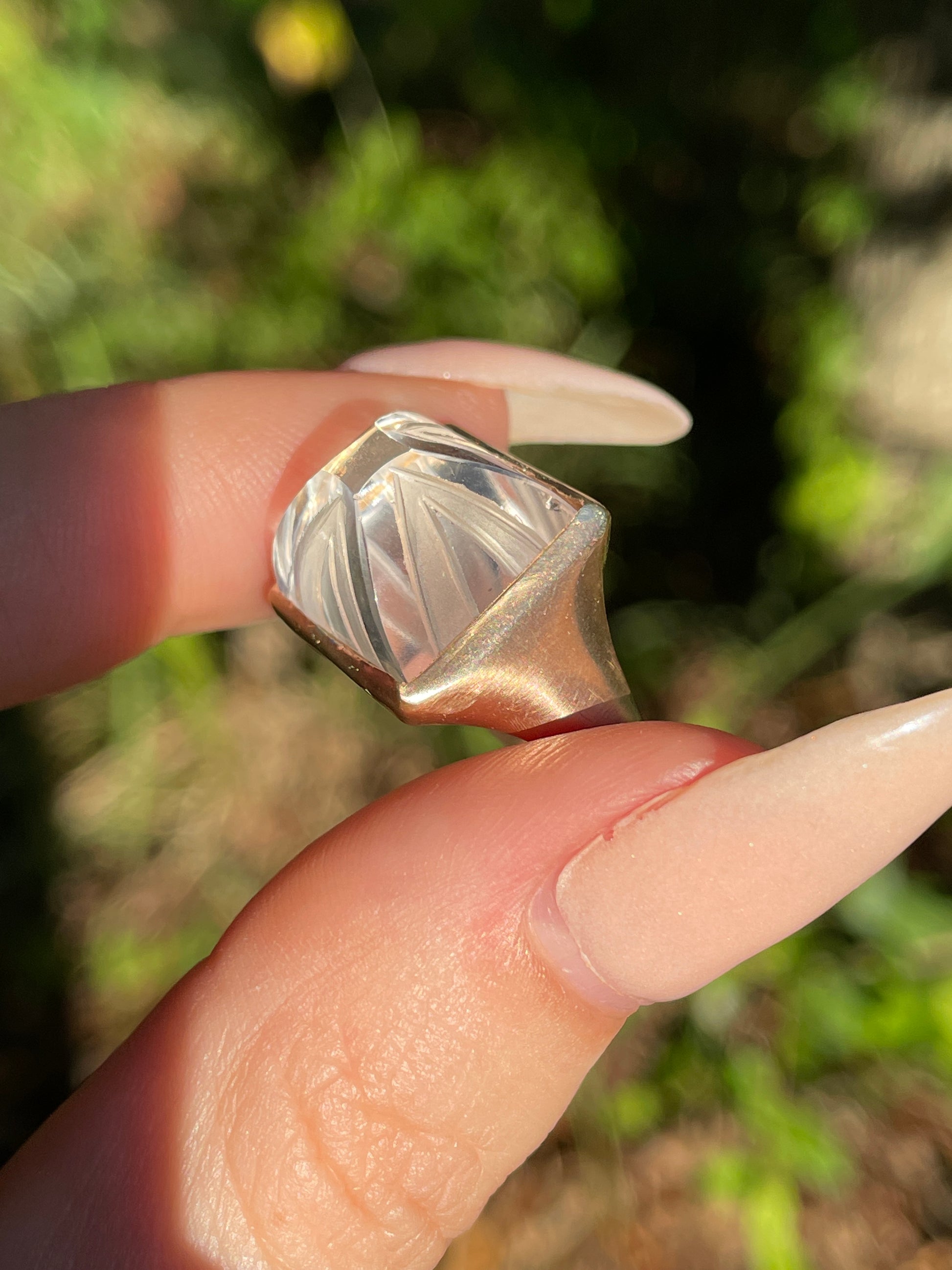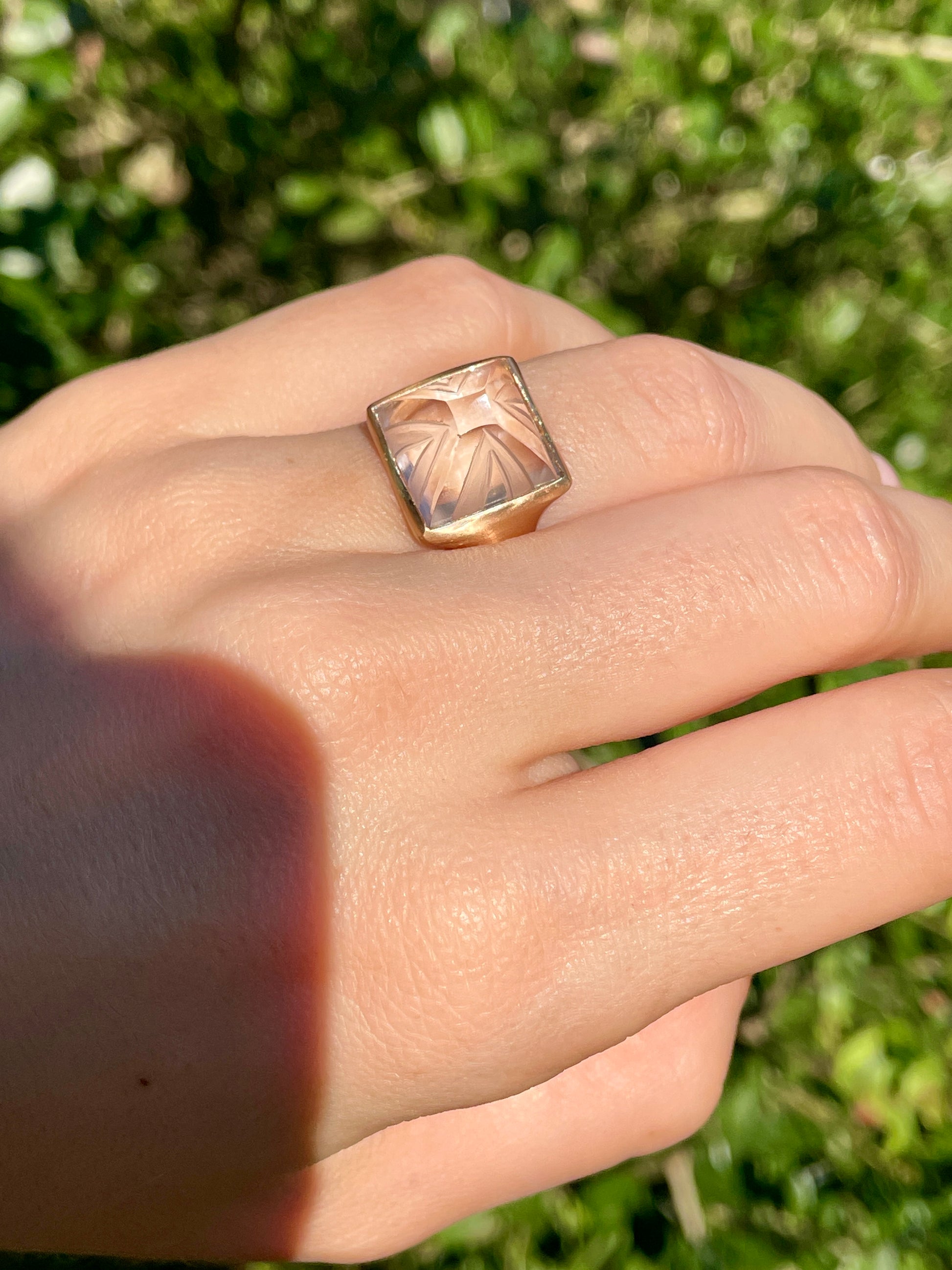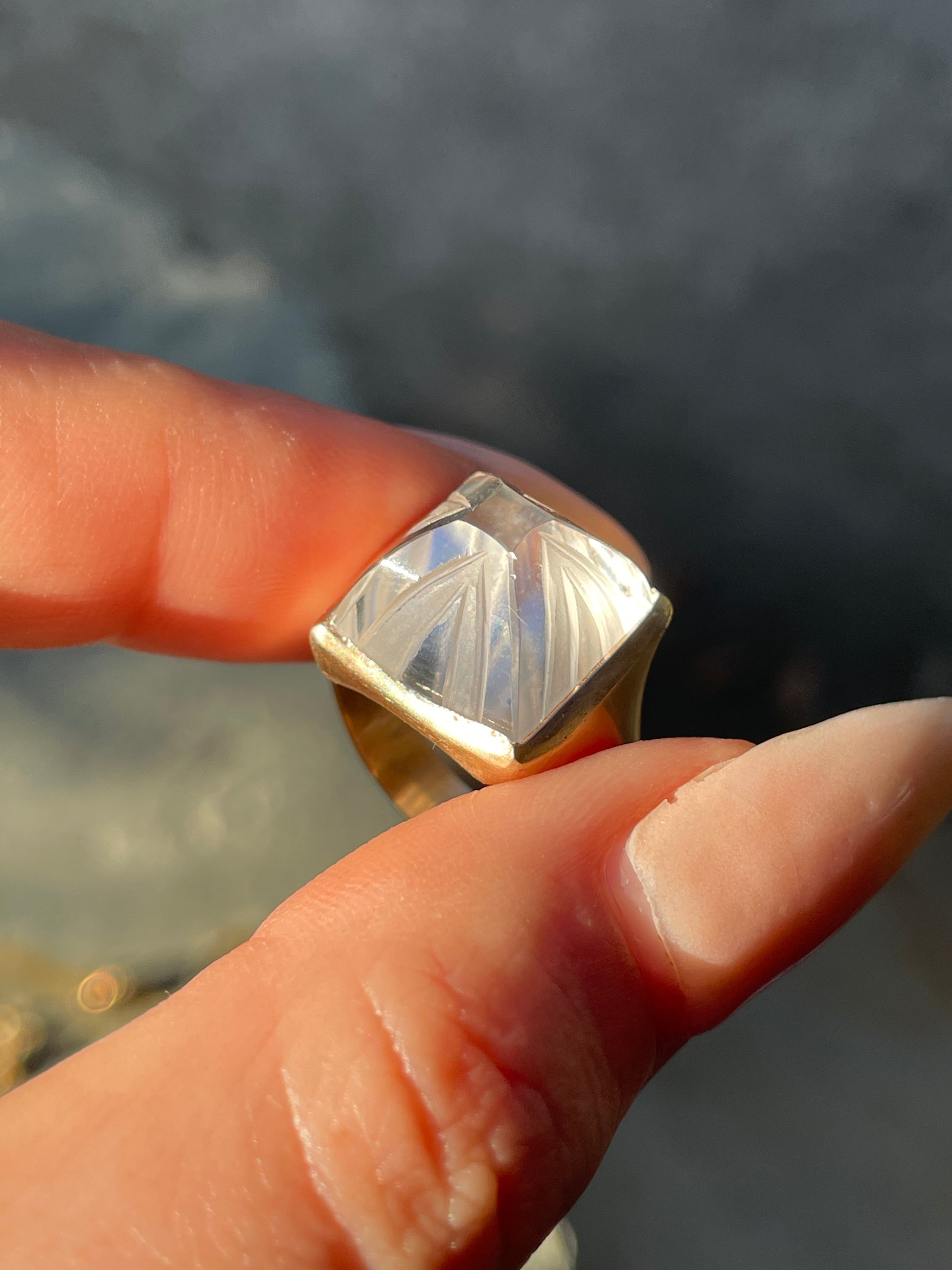 An enchanting carved sugarloaf carved rock crystal bezel set ring in matte 14K gold. Currently Size 6 and sizable. 14 mm wide. Weighs 6.5 grams. The carving adds dimension to the rock crystal with a play on textures. In excellent preowned vintage condition. Note: This ring is shown in group shots with other rings that have separate listings or will be listed in the future.