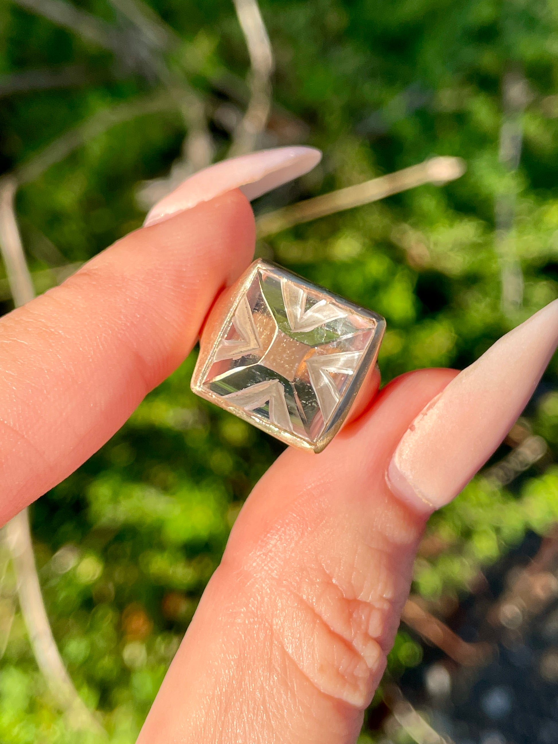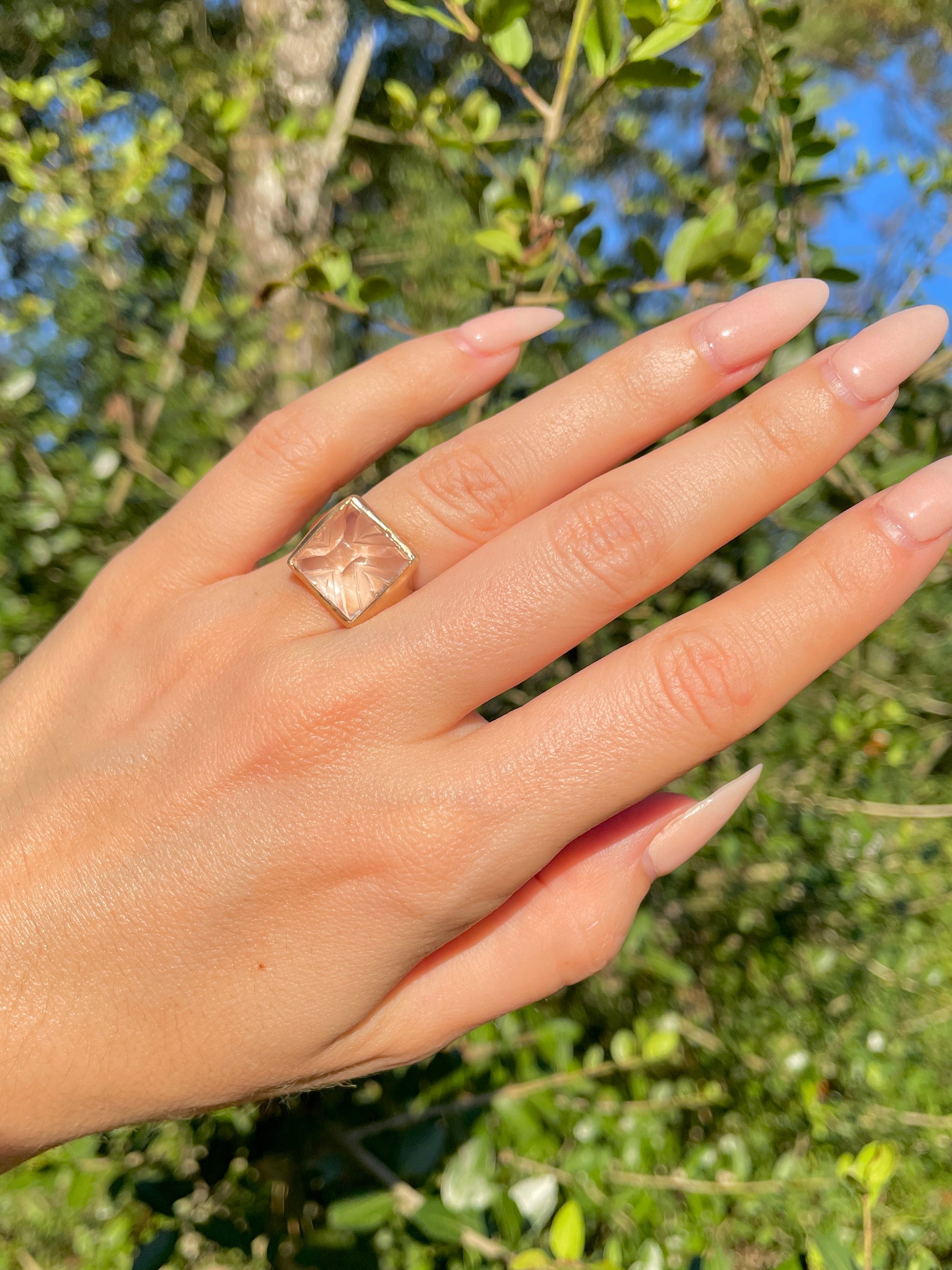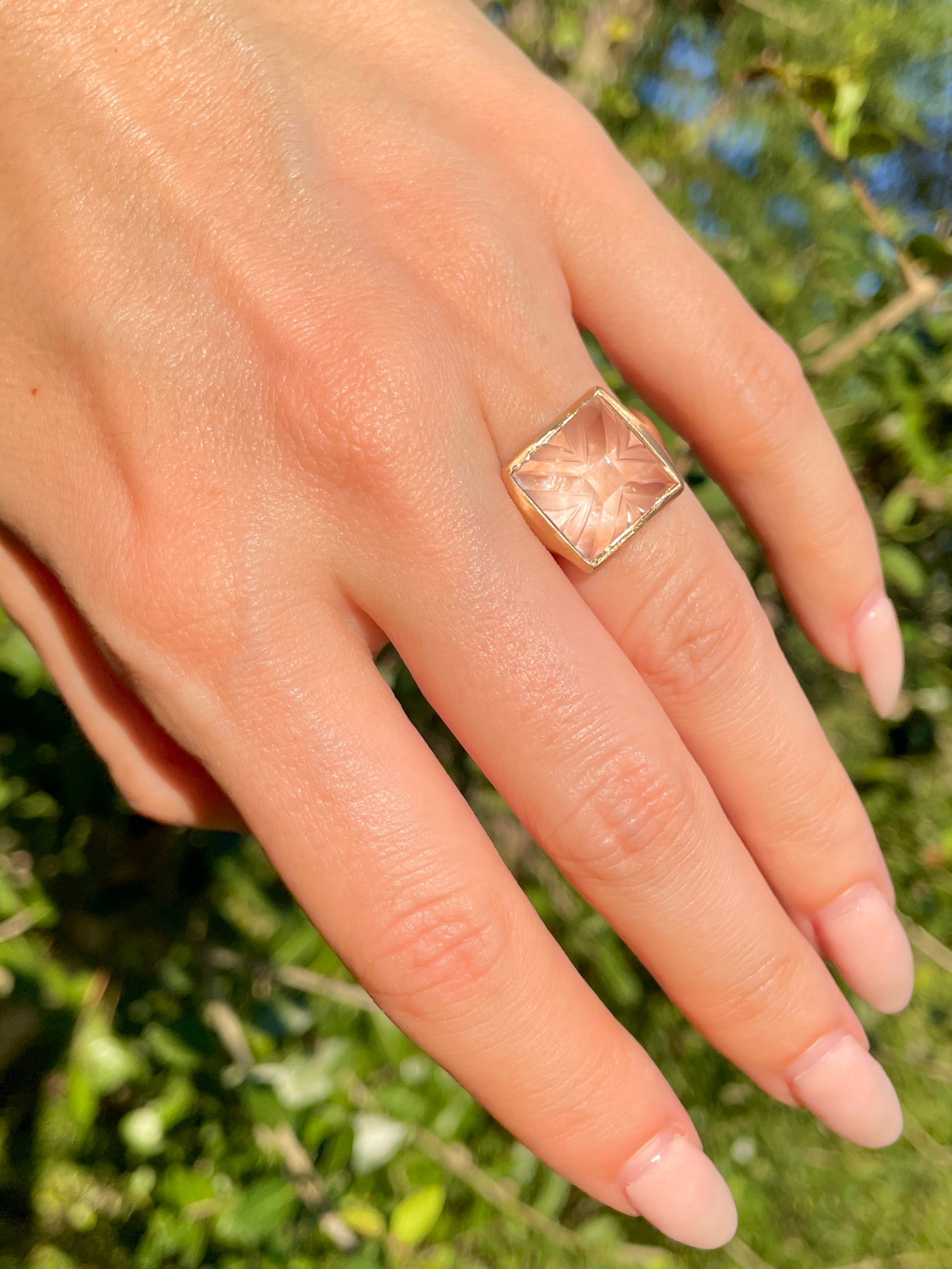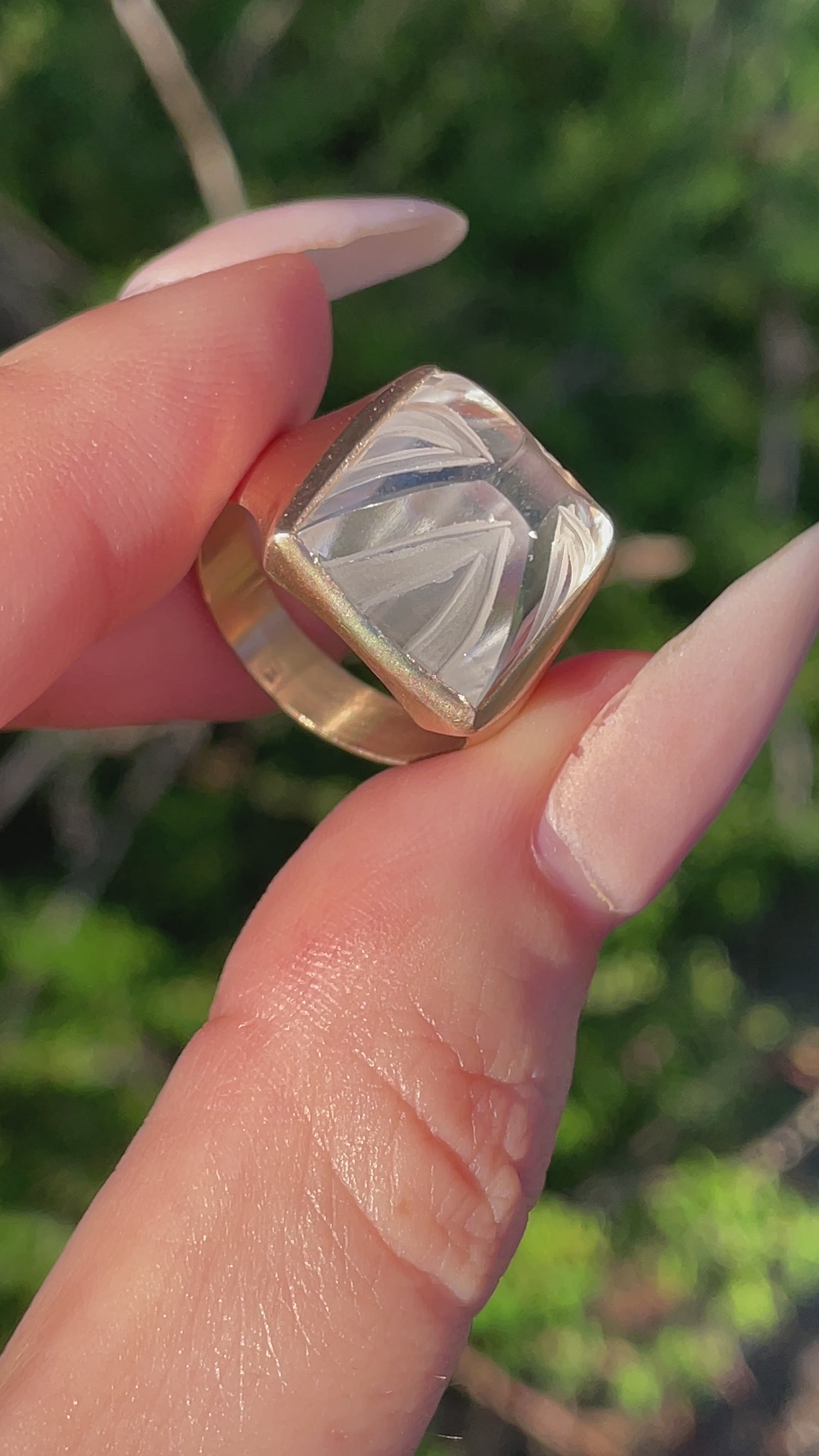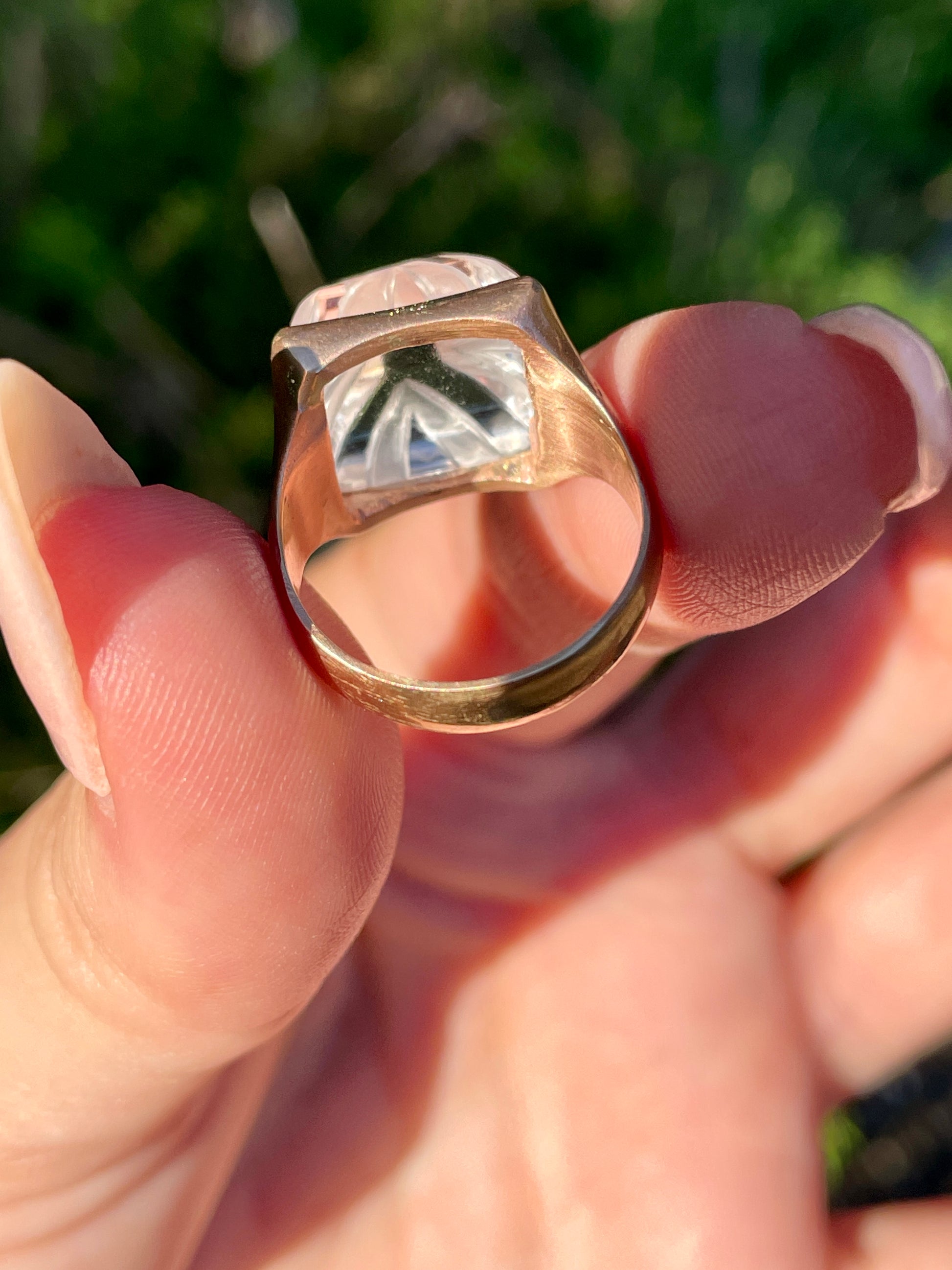An enchanting carved sugarloaf carved rock crystal bezel set ring in matte 14K gold. Currently Size 6 and sizable. 14 mm wide. Weighs 6.5 grams. The carving adds dimension to the rock crystal with a play on textures. In excellent preowned vintage condition. Note: This ring is shown in group shots with other rings that have separate listings or will be listed in the future.