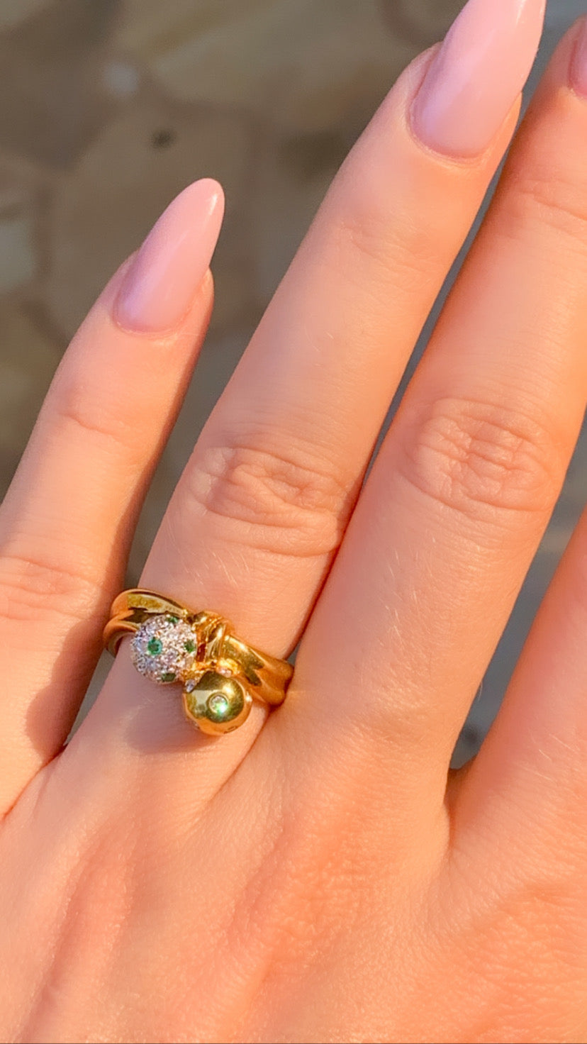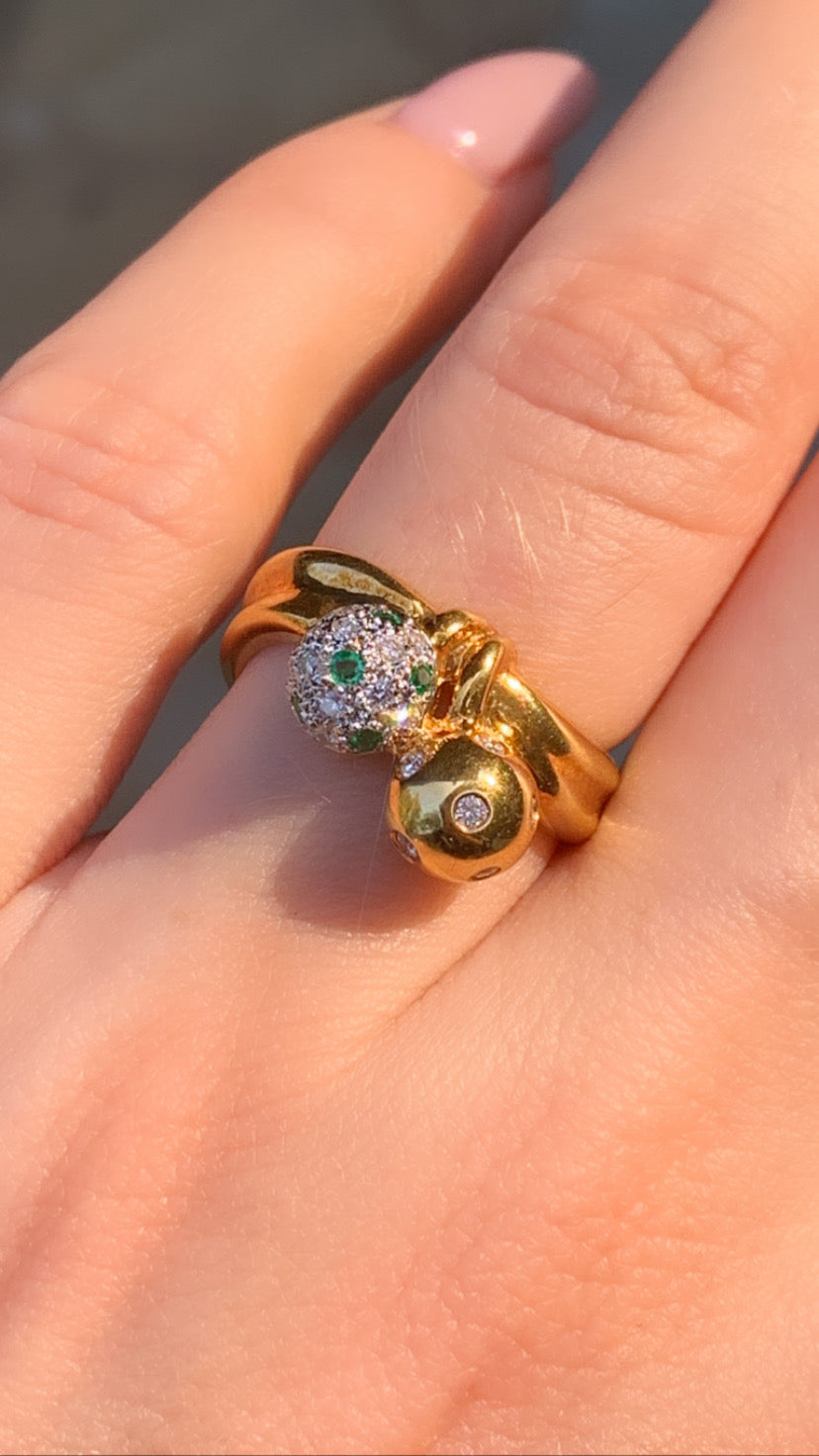 Vintage 18K deadstock emerald and diamond bow ring, size 6