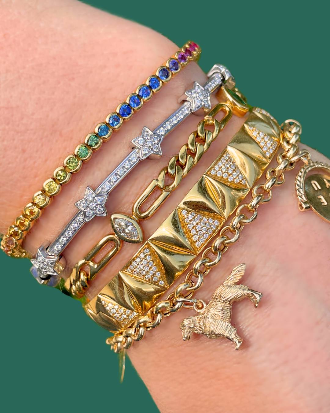 A bold and unique Vintage yellow 18K marquise gemstone and curb bracelet, 7.25 inch (sizable) with an array of vibrant natural gemstones including .28 ctw diamond, .22 ctw emerald, .32 ctw ruby, and .32 ctw blue sapphire. Love this one! Curb links between the marquise bezel settings are 4.8 mm wide, and marquise bezel links are 8.3 mm wide. Stones measure 5.9 mm x 2.9 mm. Links are totally solid and very buttery yellow. Has a side safety clasp and 2 loops where a safety chain was previously removed. In excellent preowned vintage condition with a worn hallmark on the clasp.