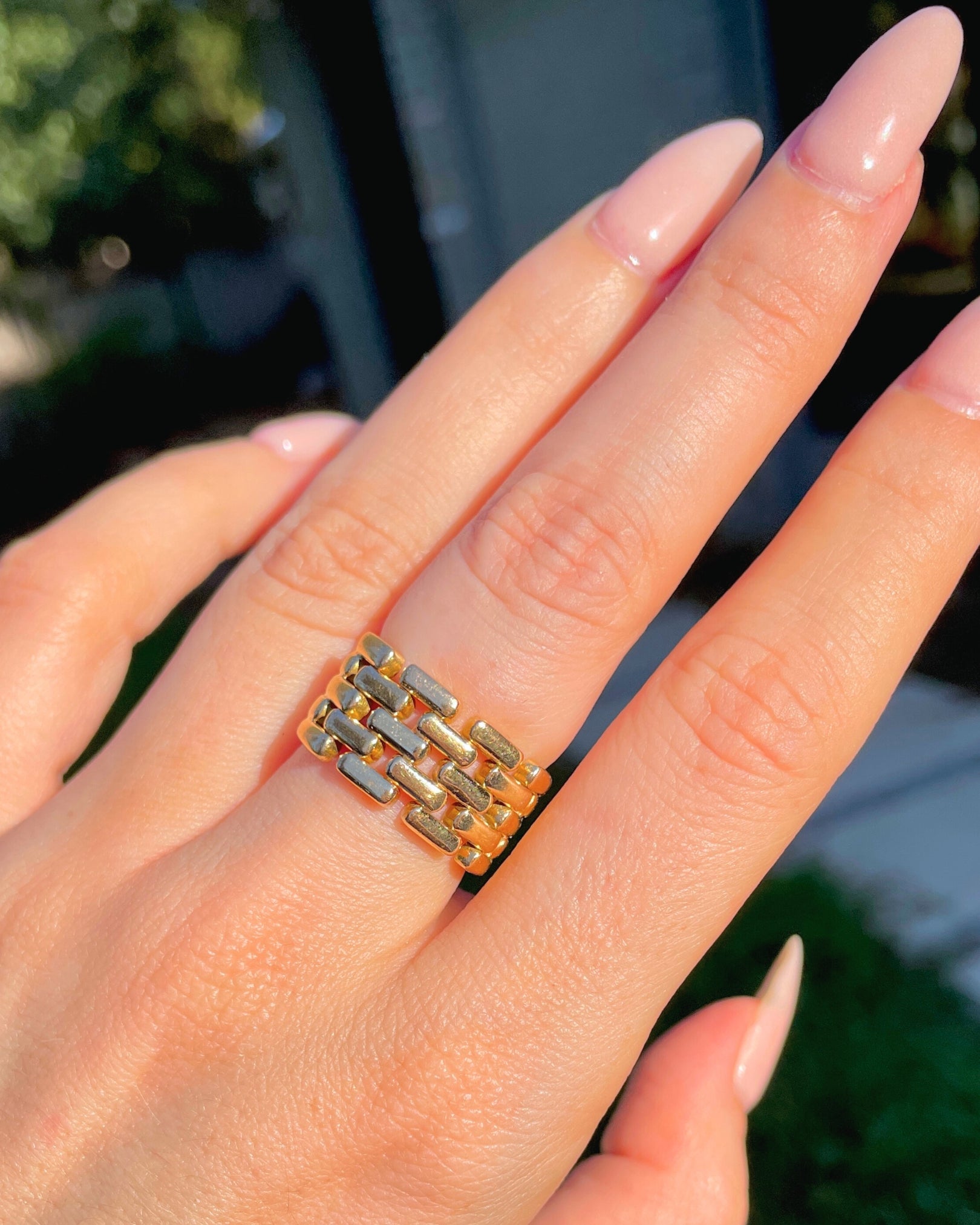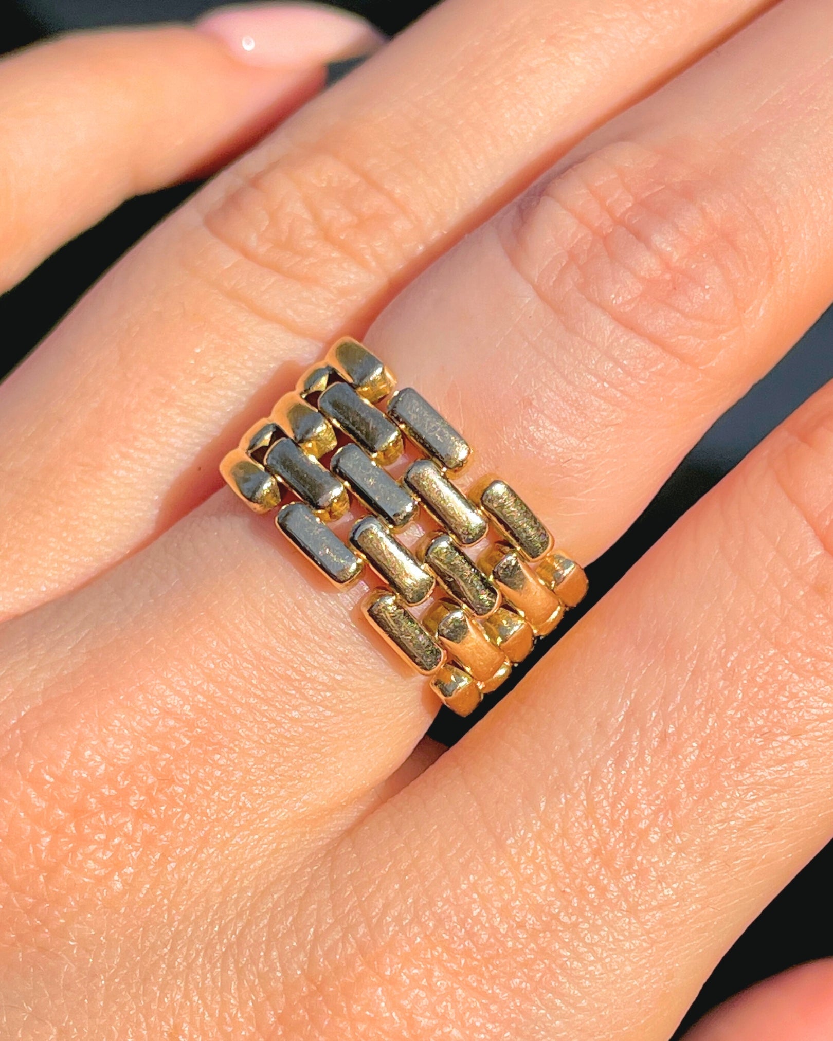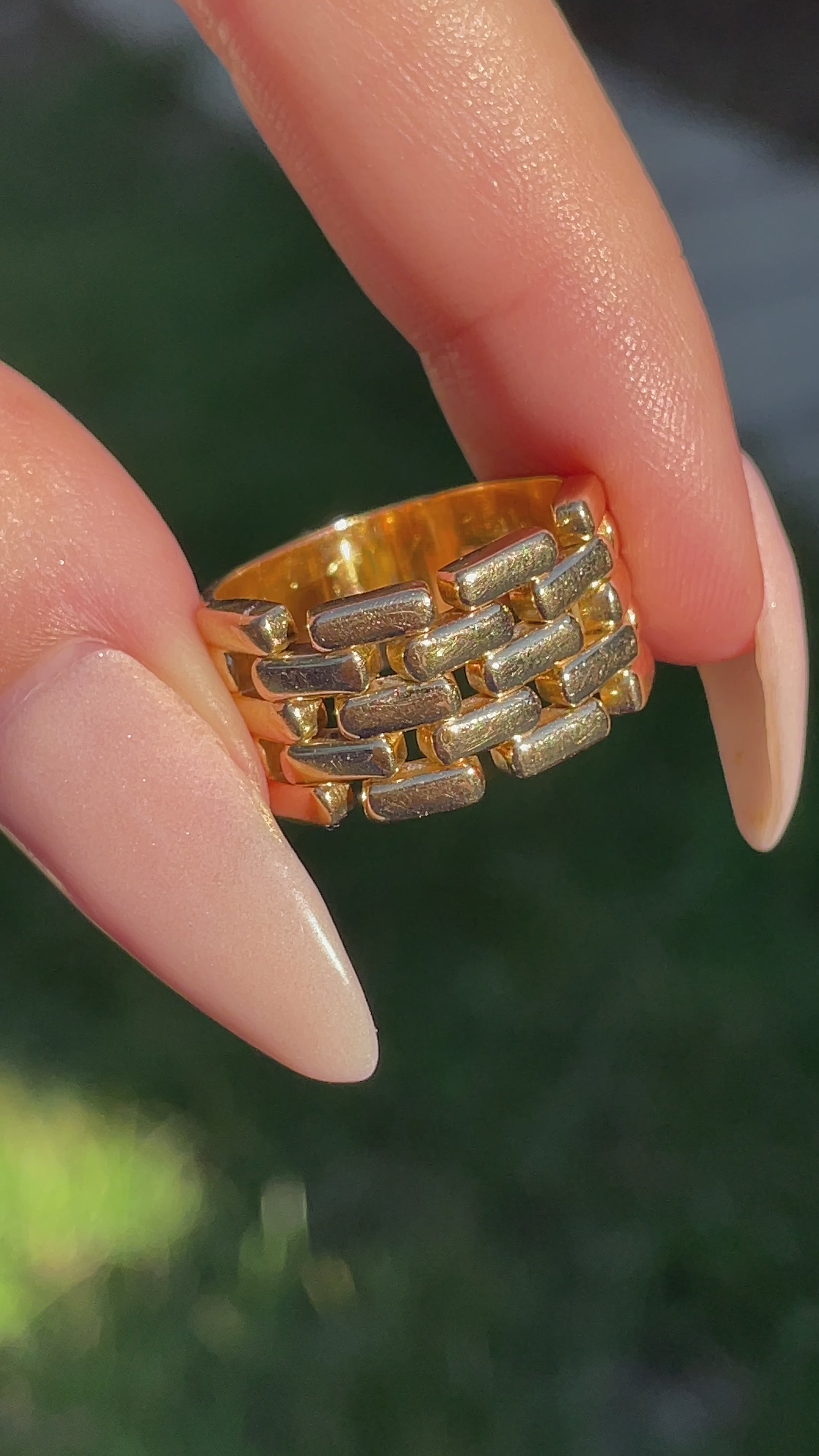 A super chic Vintage 18K panther chain link wide band. So comfortable! The panther link is flexible across the front of the ring, while the back of the ring is a solid wide gold bar that slightly tapers and allows resizing. This ring is super beautiful on. Measures 11.2 mm wide. Currently fits size 6.25 due to width (can be resized). Weighs 11.1 grams. Hallmarked '750' for 18K along with a 'KO' maker’s mark. In excellent preowned vintage condition.