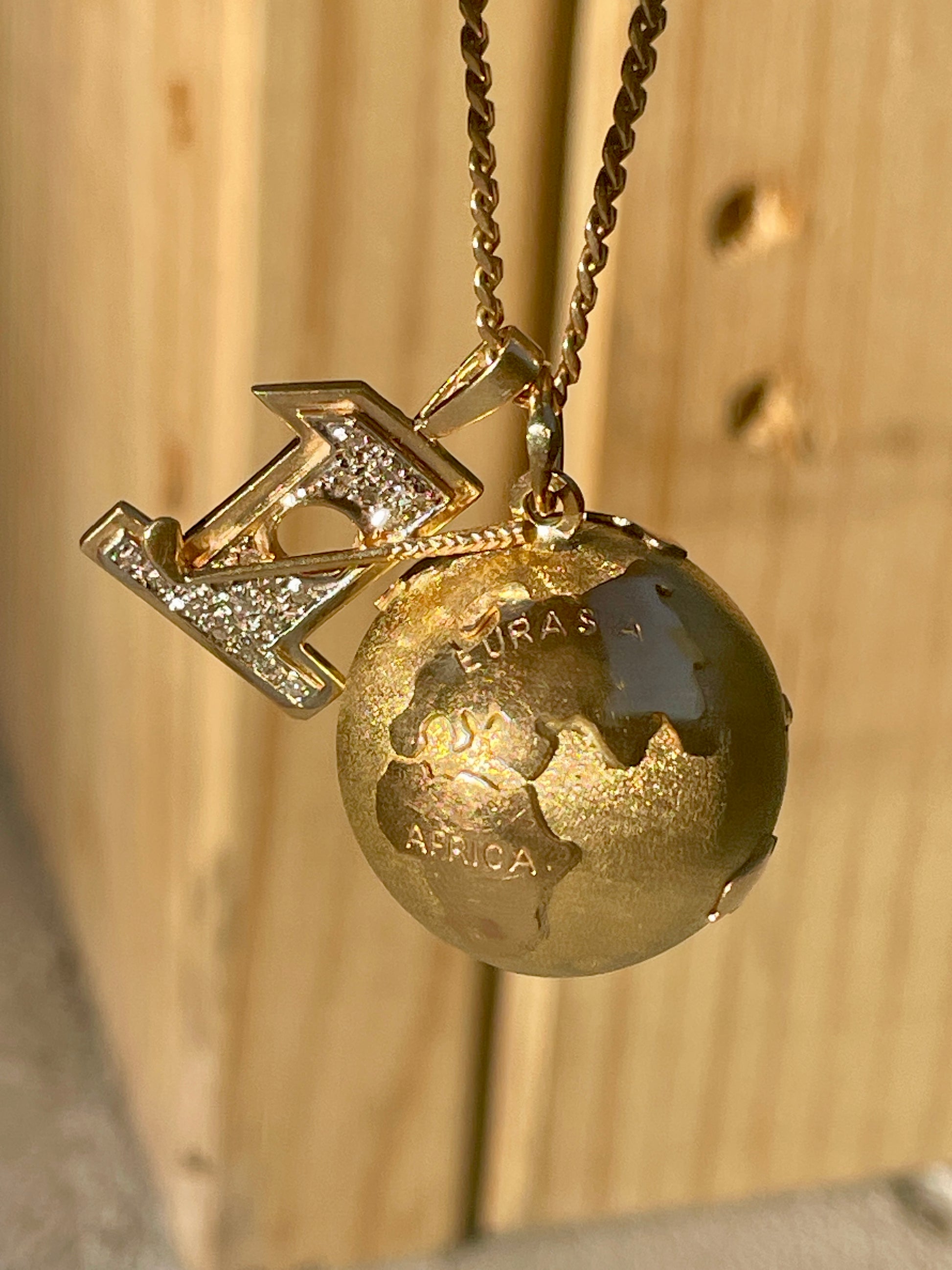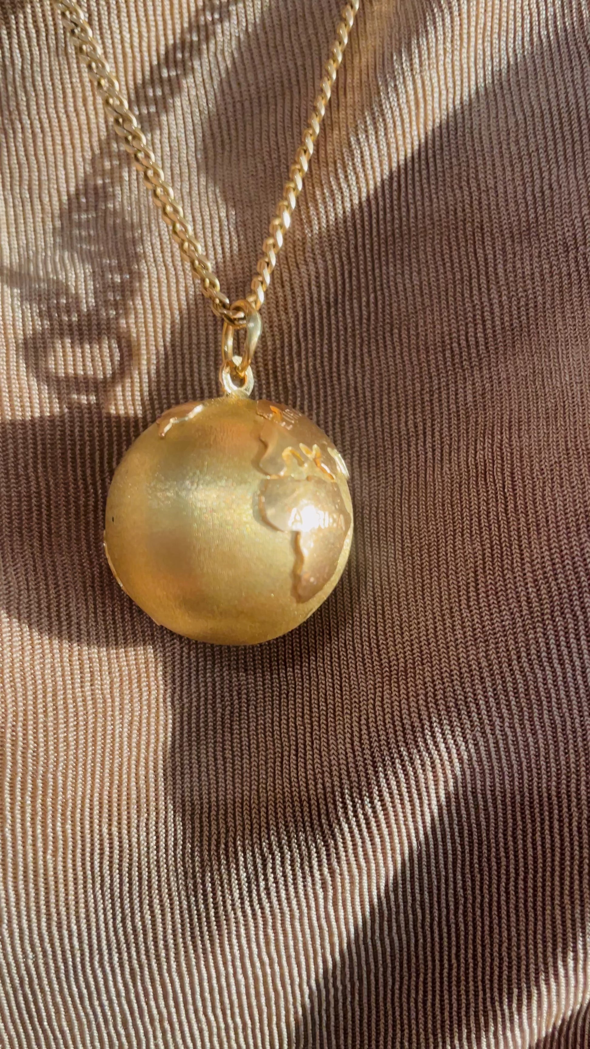 A beautiful Vintage 18K textured globe pendant with a fine textured finish against polished gold continents. A must for a world traveler or one you love and fun options like adding stones to mark meaningful places. Measures 32.6 mm long from bale x 23.6 mm wide. Weighs 10.1 grams. In very good preowned vintage condition.