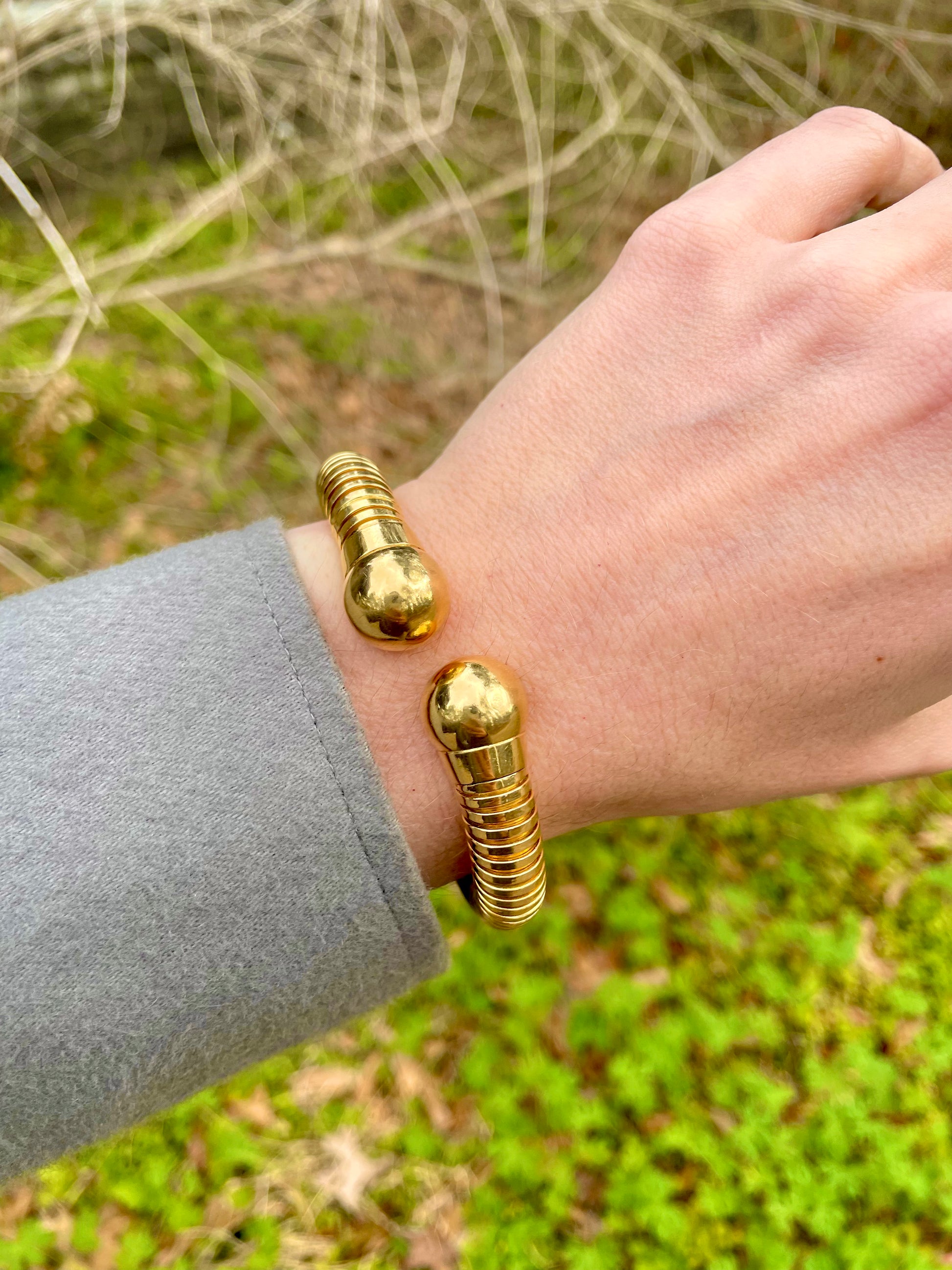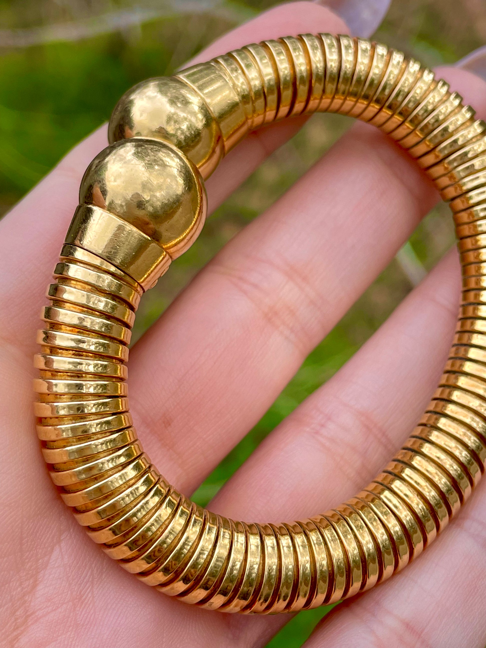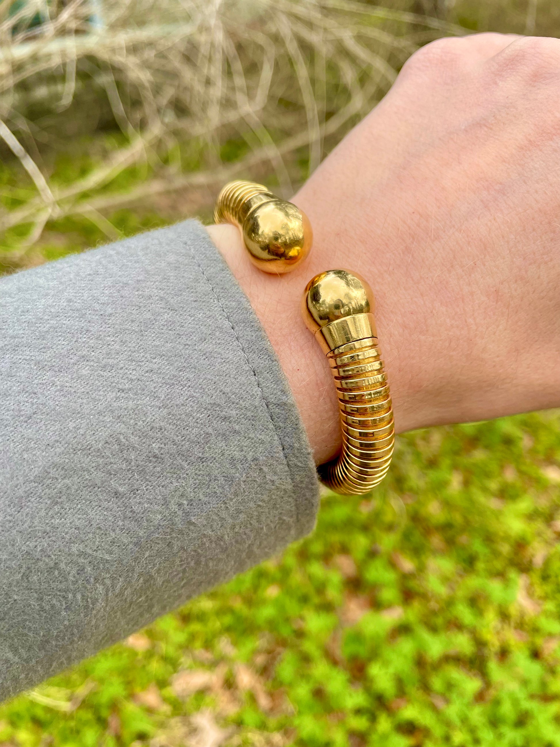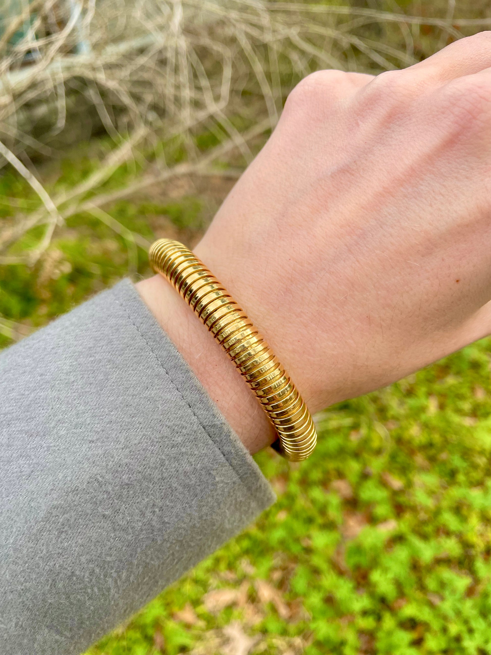 Vintage 18K heavy tubogas ball bracelet, 109 VR italy hallmark, weighs 48.4 grams. 9.8 mm wide x 9.8 mm thick. Interior measures 2.1 inch x 1.6 inch unstretched but it flexes open to fit wrist. As result it fits a range of sizes but best for wrist 6 inch and under. A little too snug on my 6.25 inch wrist. A couple super minor impressions on the balls. $3950