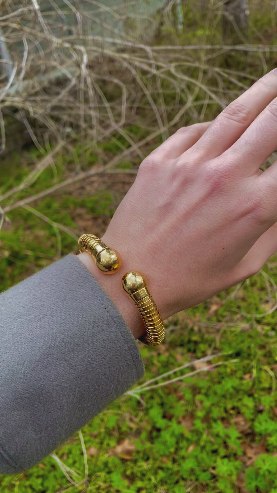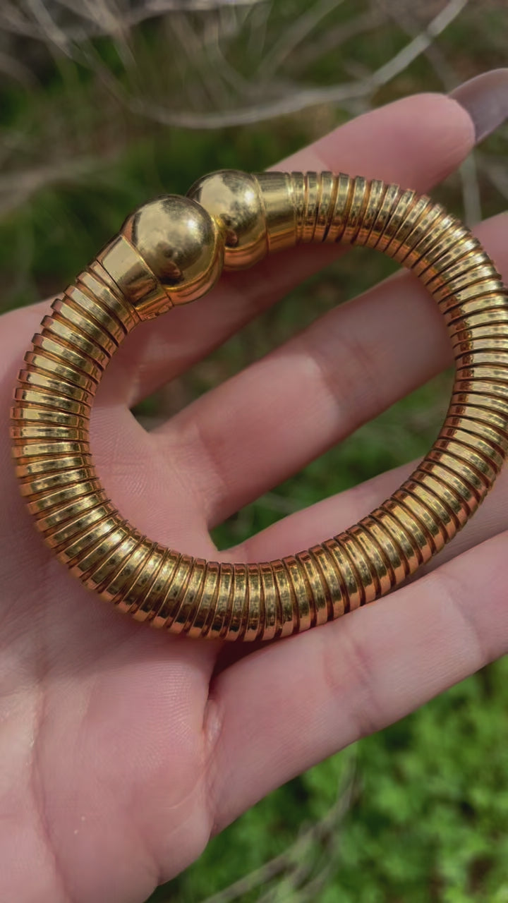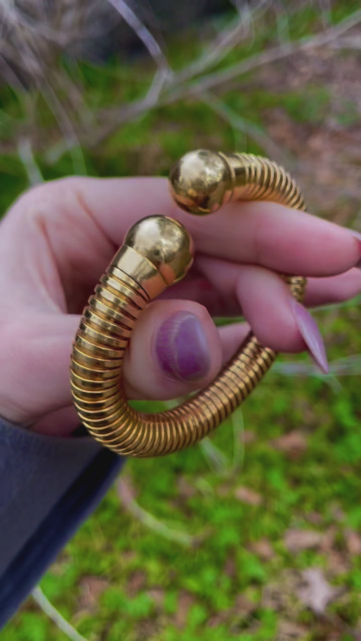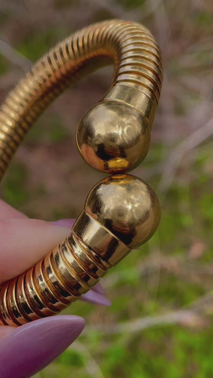 Vintage 18K heavy tubogas ball bracelet, 109 VR italy hallmark, weighs 48.4 grams. 9.8 mm wide x 9.8 mm thick. Interior measures 2.1 inch x 1.6 inch unstretched but it flexes open to fit wrist. As result it fits a range of sizes but best for wrist 6 inch and under. A little too snug on my 6.25 inch wrist. A couple super minor impressions on the balls. $3950