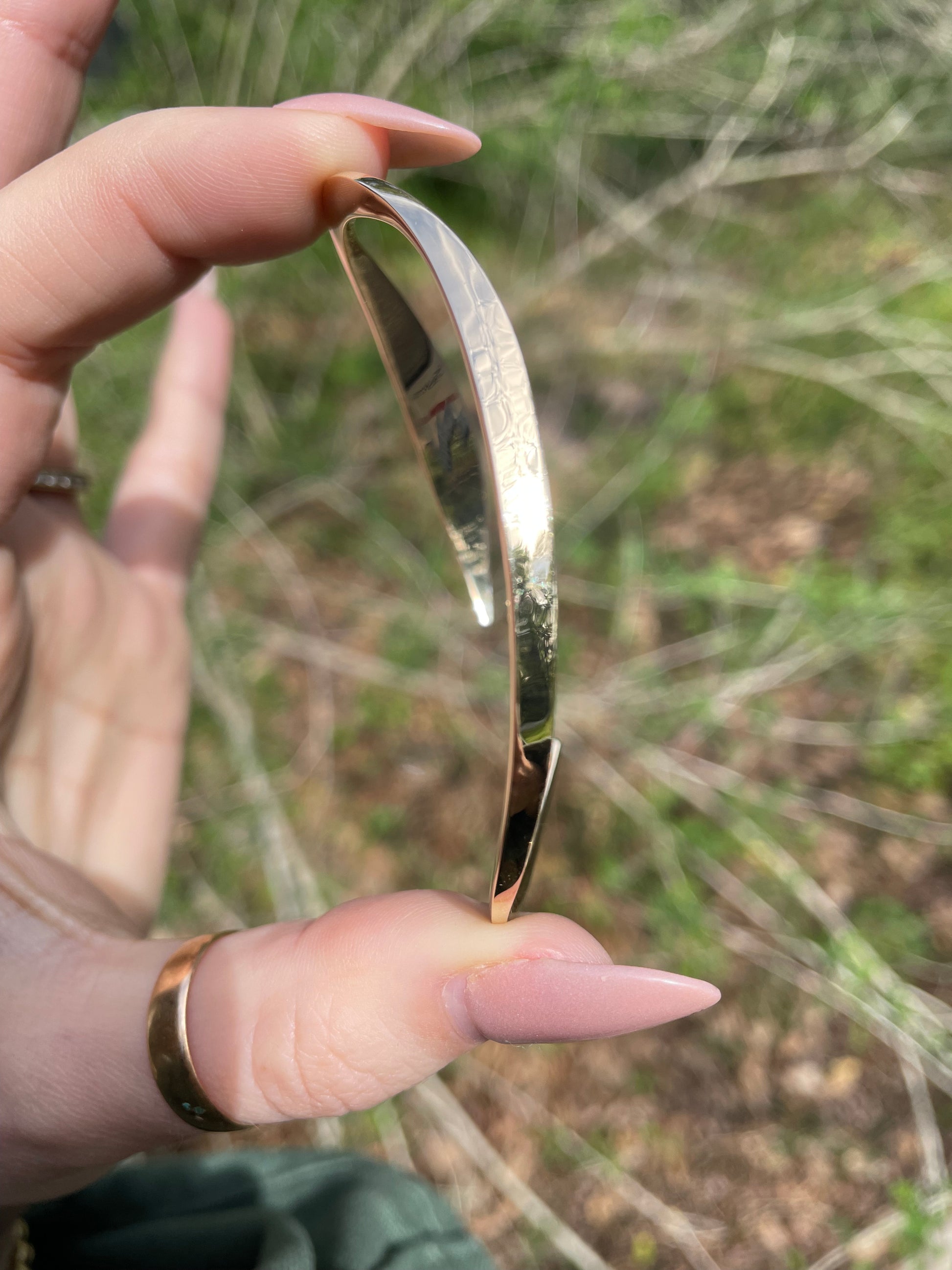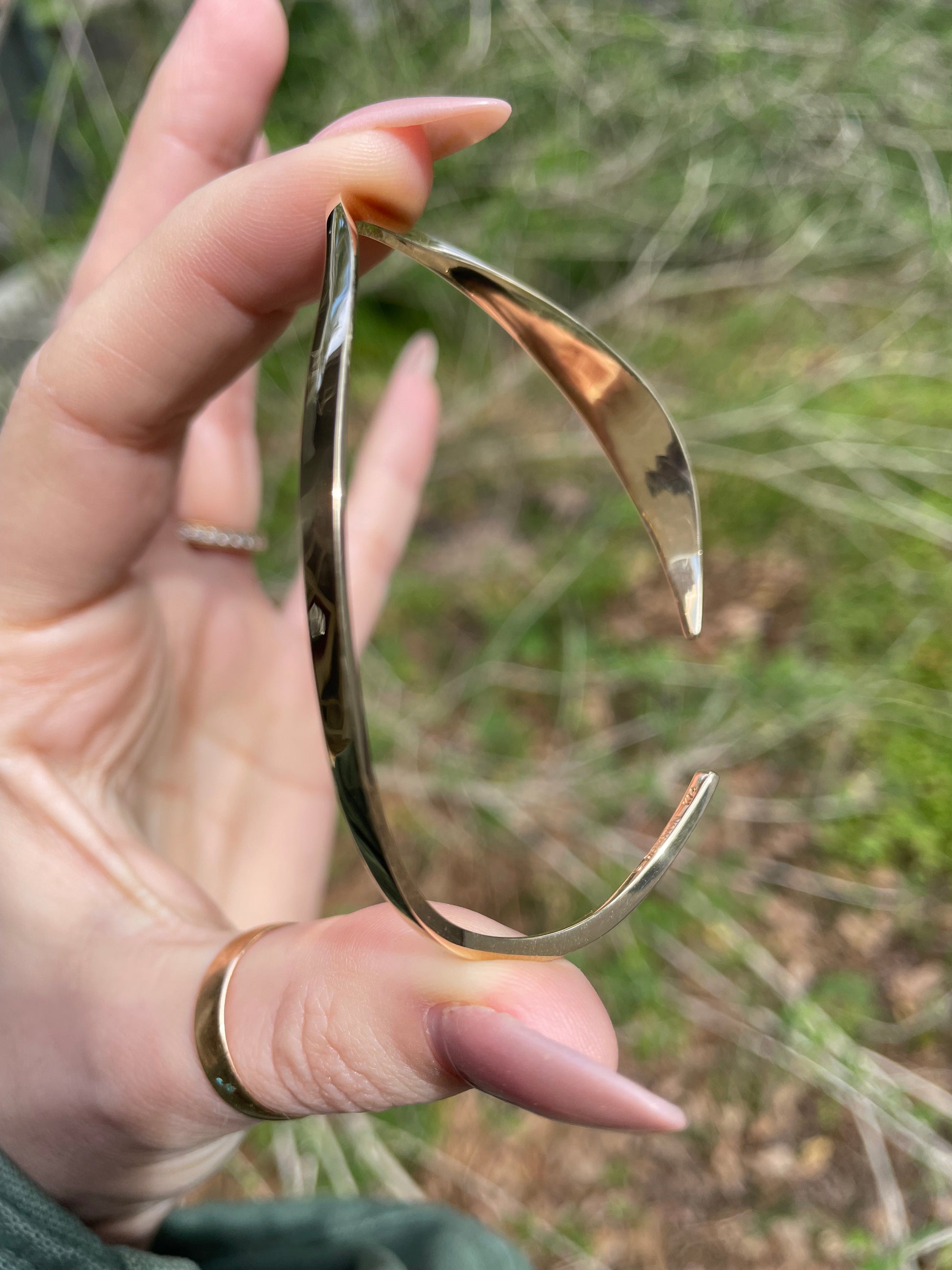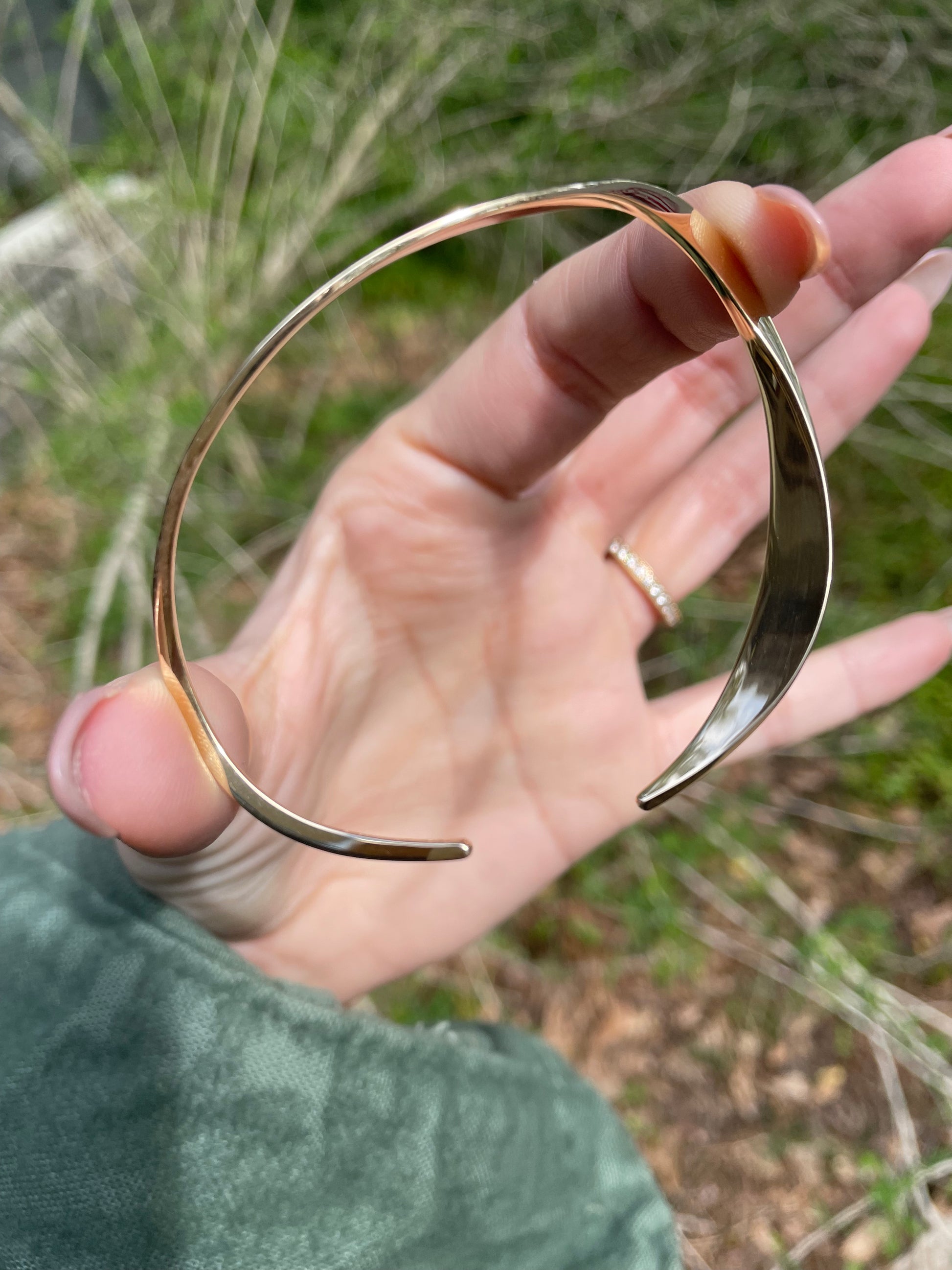 Vintage curvy polished open cuff. Great play of movement and thicknesses. Interior measures 2.5 x 2.1 inch for a medium size wrist. Weighs 9.6 grams. Hallmarked “Royston K14”. Width varies but 4.1 mm on top and ranges 1.7 - 7.7 mm