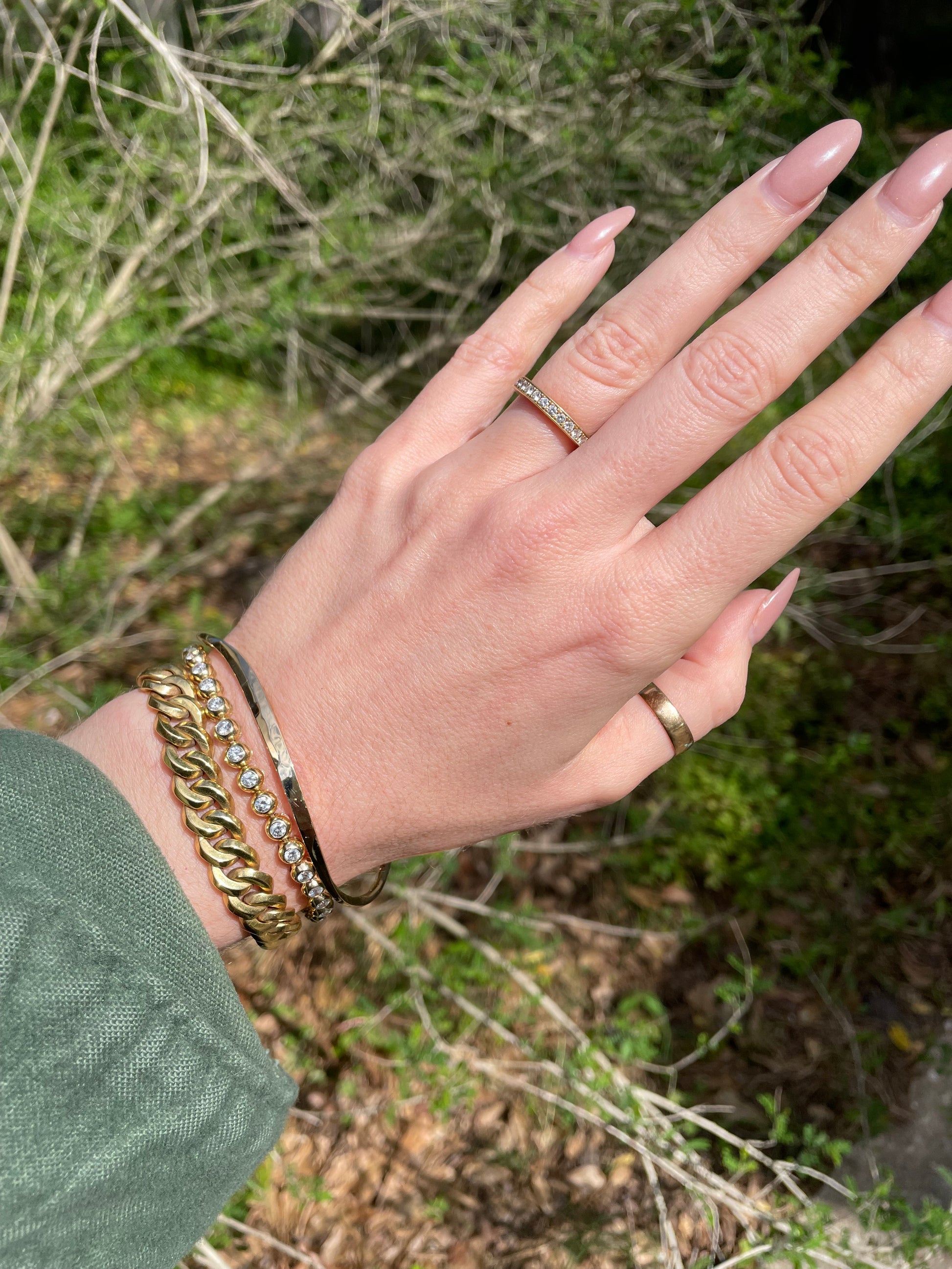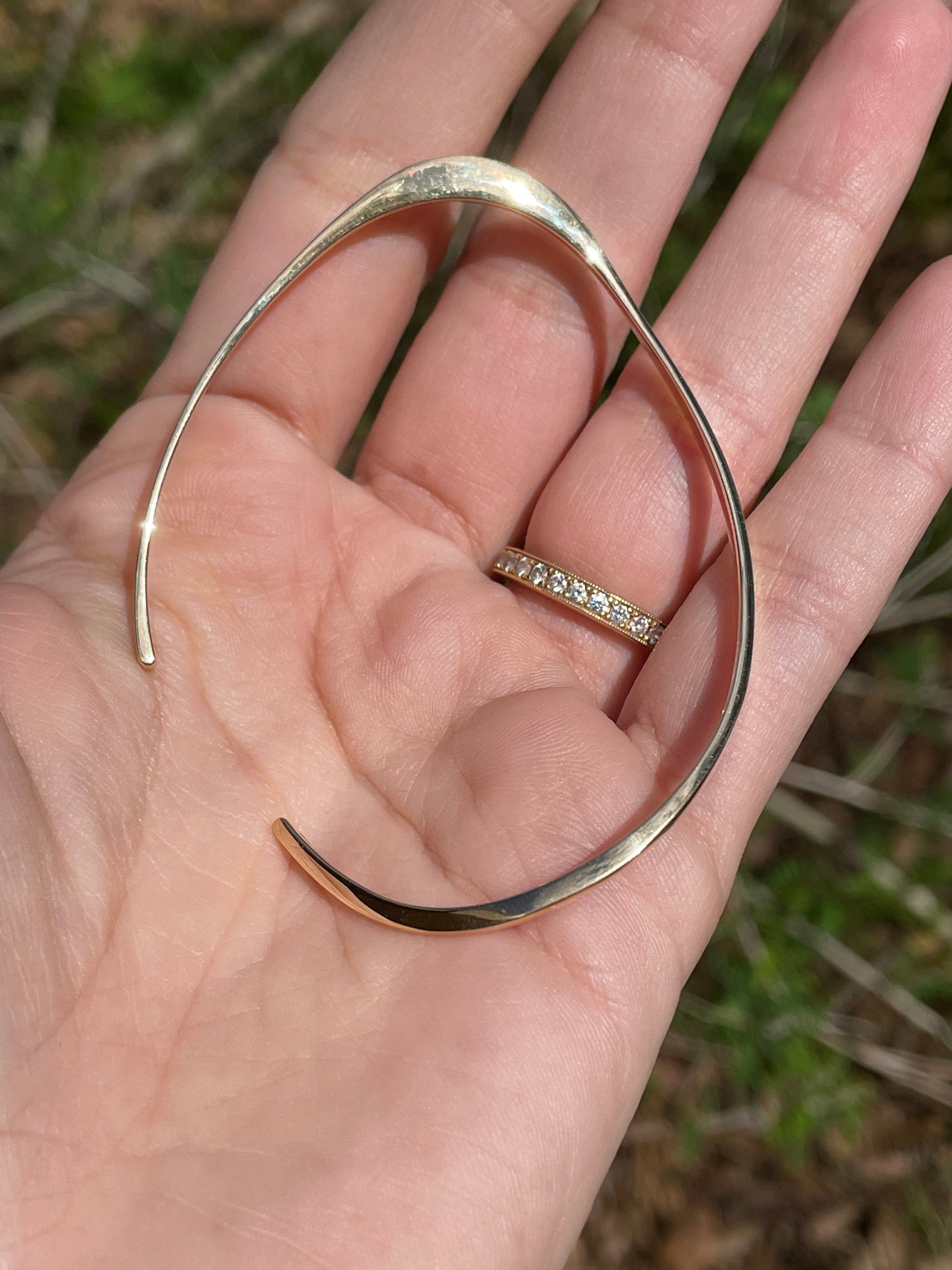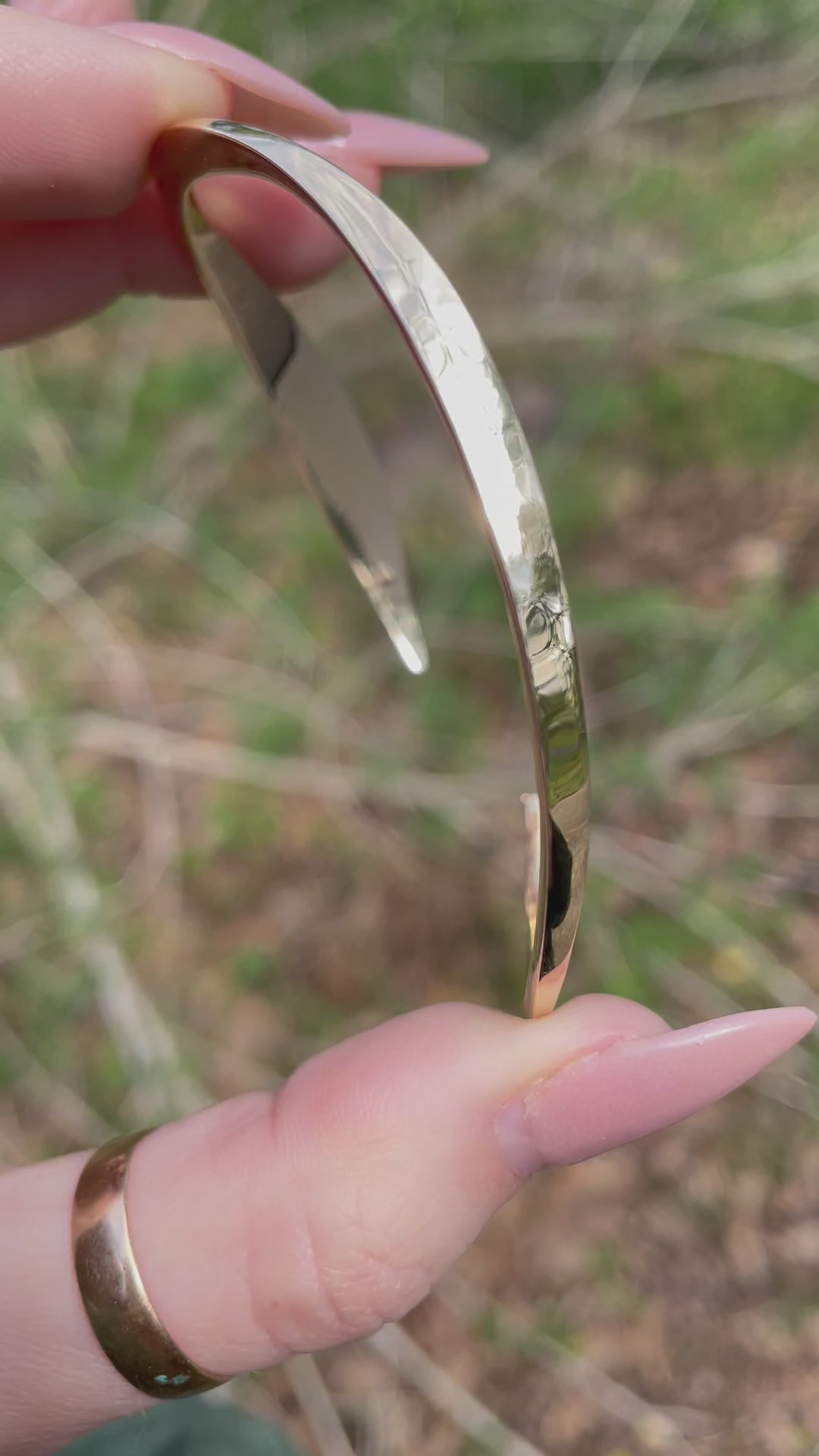 Vintage curvy polished open cuff. Great play of movement and thicknesses. Interior measures 2.5 x 2.1 inch for a medium size wrist. Weighs 9.6 grams. Hallmarked “Royston K14”. Width varies but 4.1 mm on top and ranges 1.7 - 7.7 mm